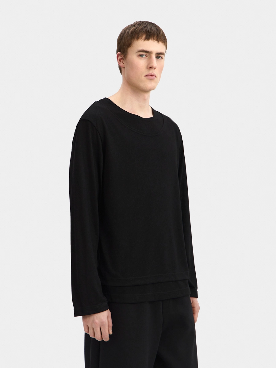 Лонгслив имеет прямой силуэт, спущенную линию плеча и круглую широкую горловину. Верхний слой лонгслива короче нижнего и имеет более широкую горловину.