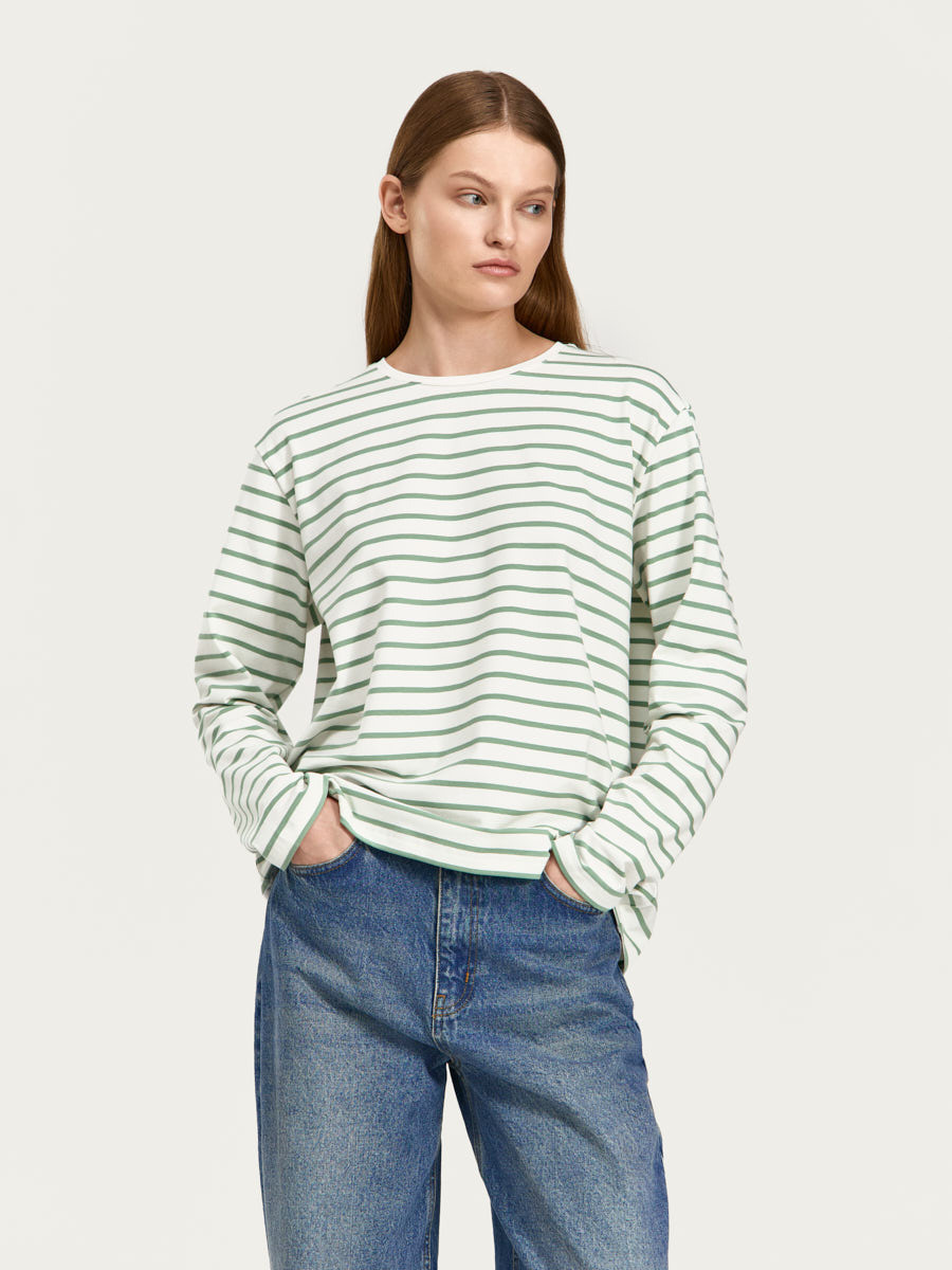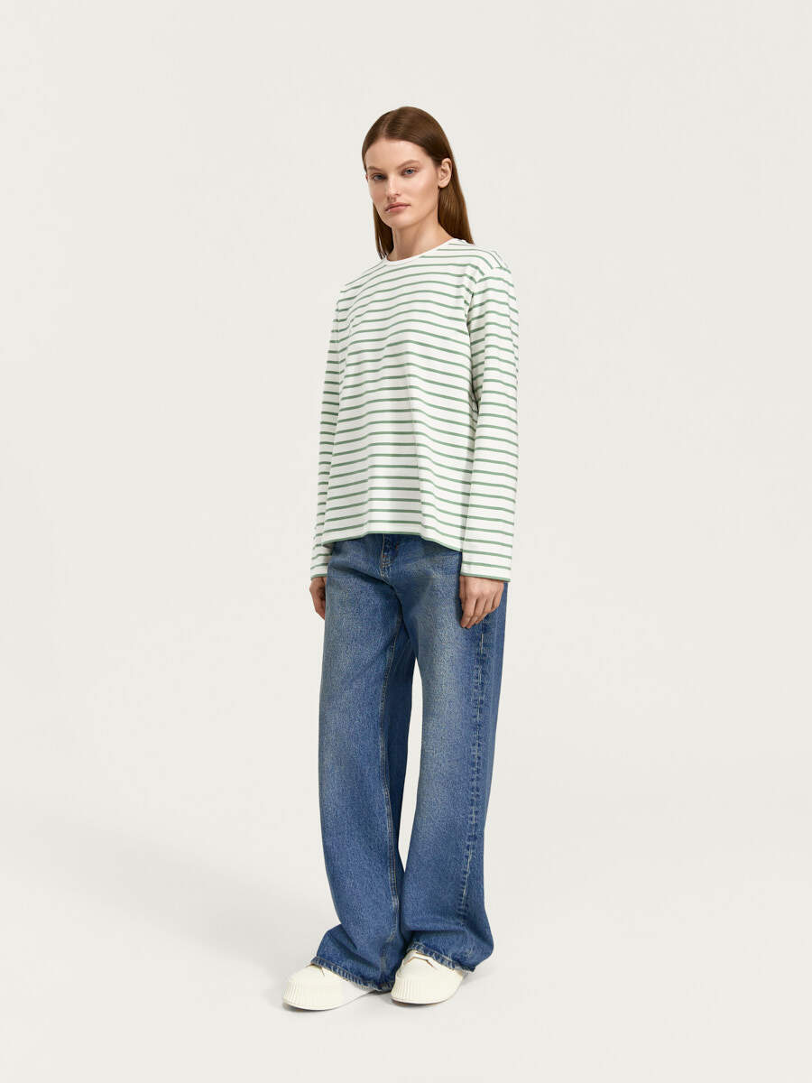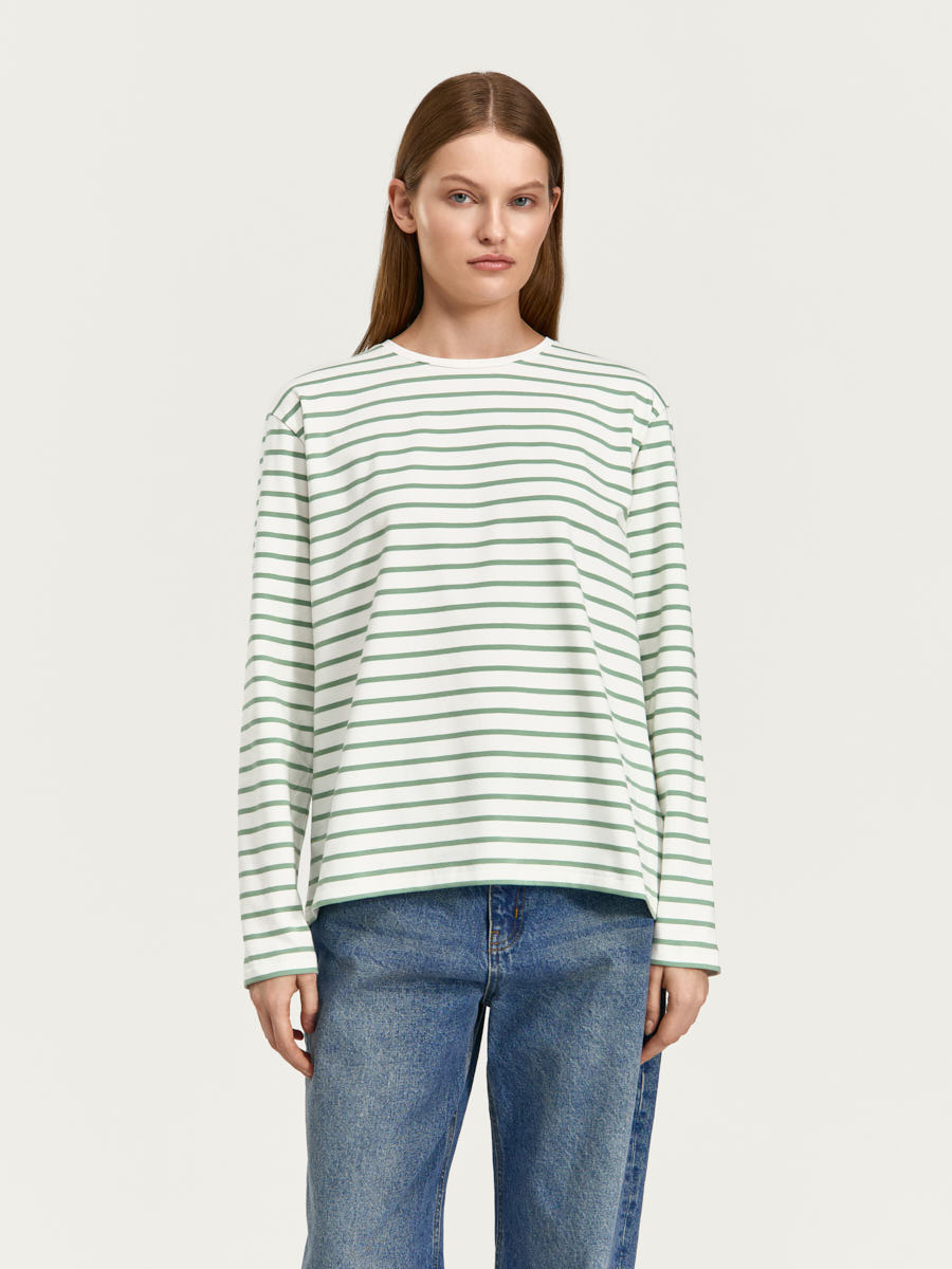 Лонгслив Лори в полоску из хлопкового трикотажа. Изделие прямого силуэта со спущенной линией плеча и круглой горловиной с обтачкой. Лонгслив Лори в полоску дополнит ваш гардероб.