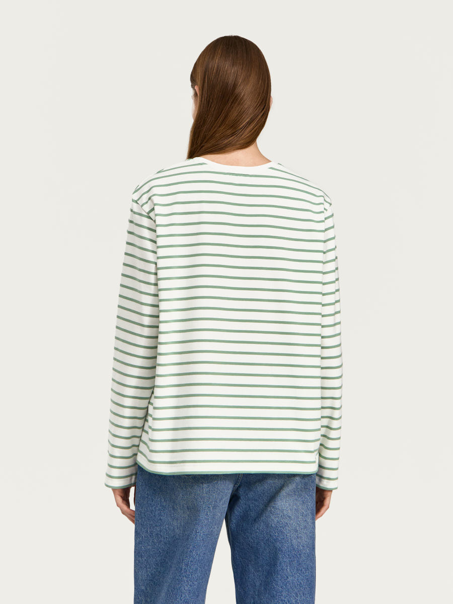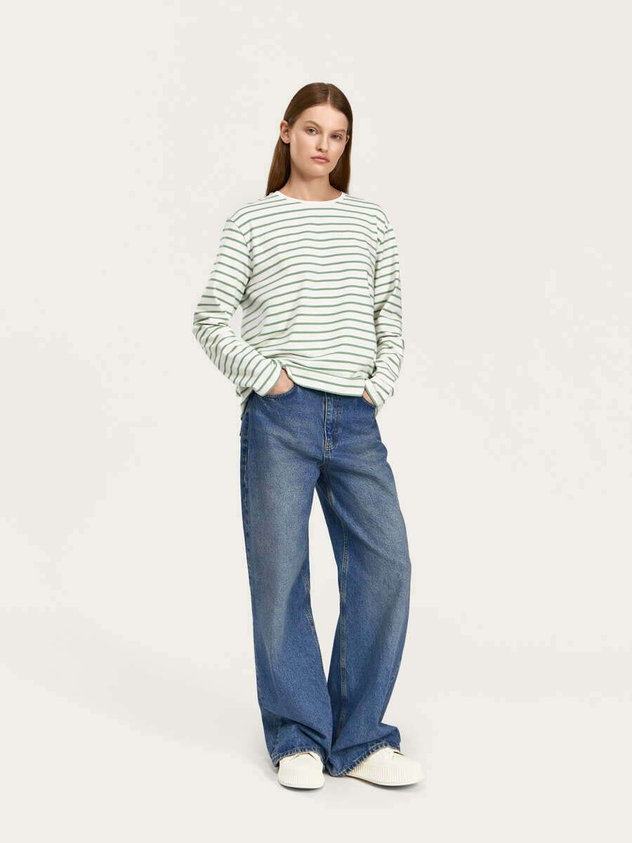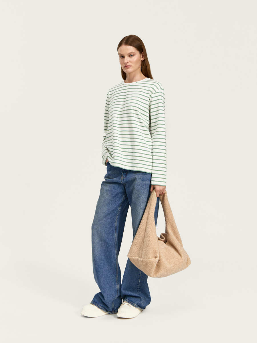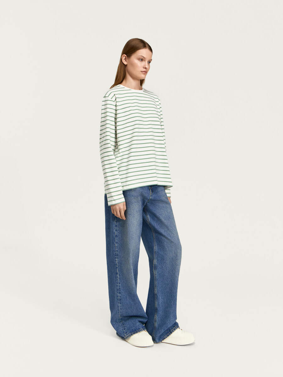 Лонгслив Лори в полоску из хлопкового трикотажа. Изделие прямого силуэта со спущенной линией плеча и круглой горловиной с обтачкой. Лонгслив Лори в полоску дополнит ваш гардероб.