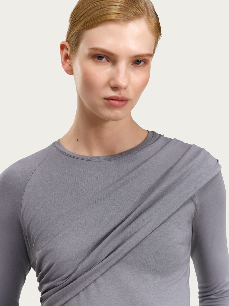 Особенностью дизайна является драпировка, которая формируется по косой от бокового шва к плечу.