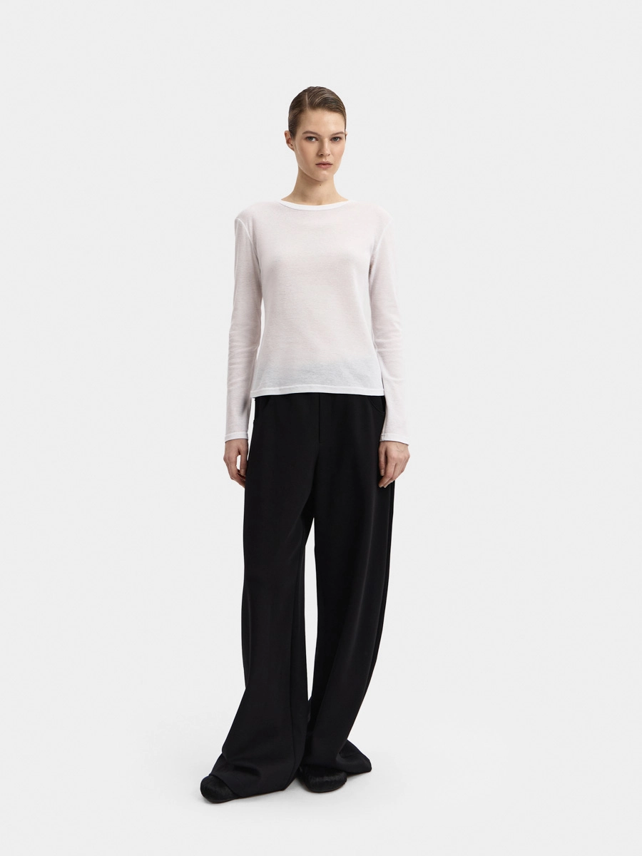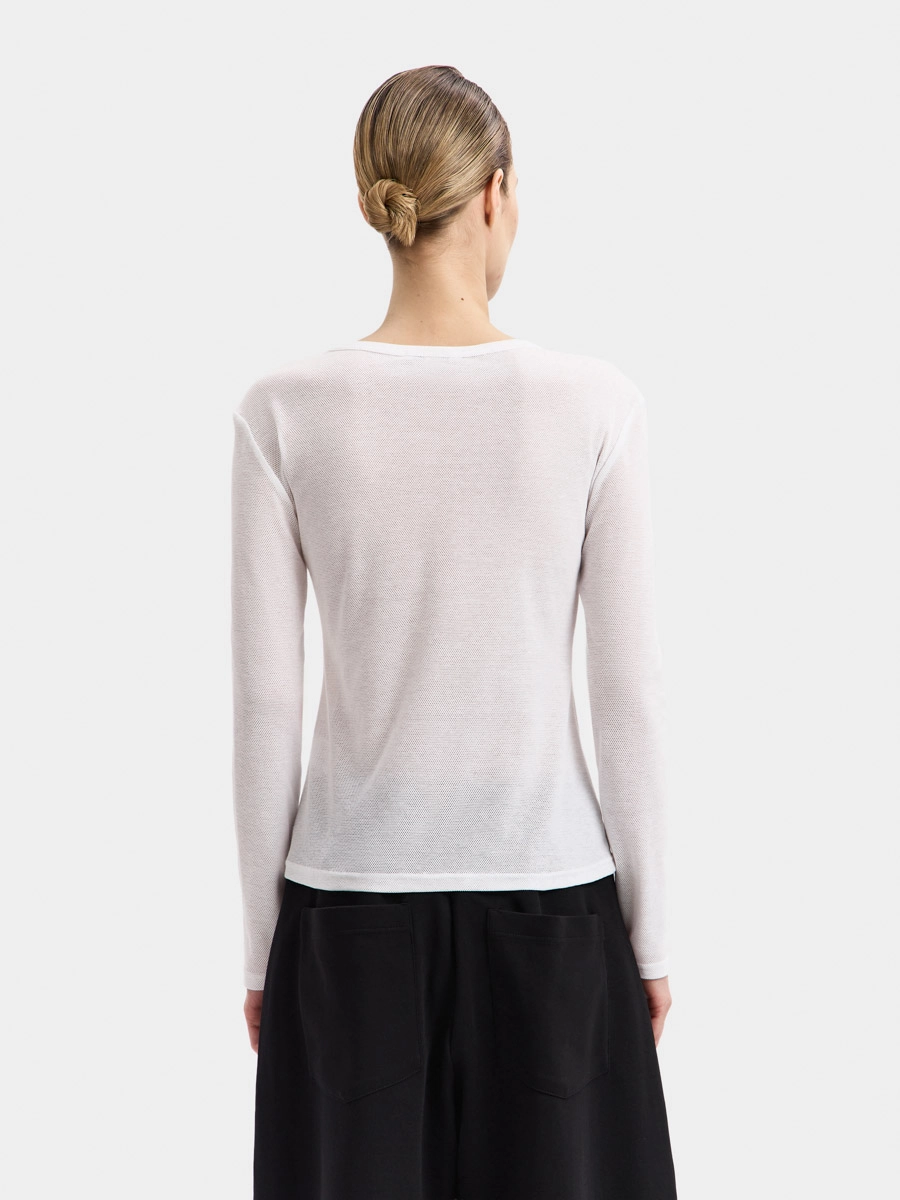 Longsleeved top Vanessa is made of textured Italian mesh knit fabric. This semi-fitted longsleeve features a round neckline finished with binding.