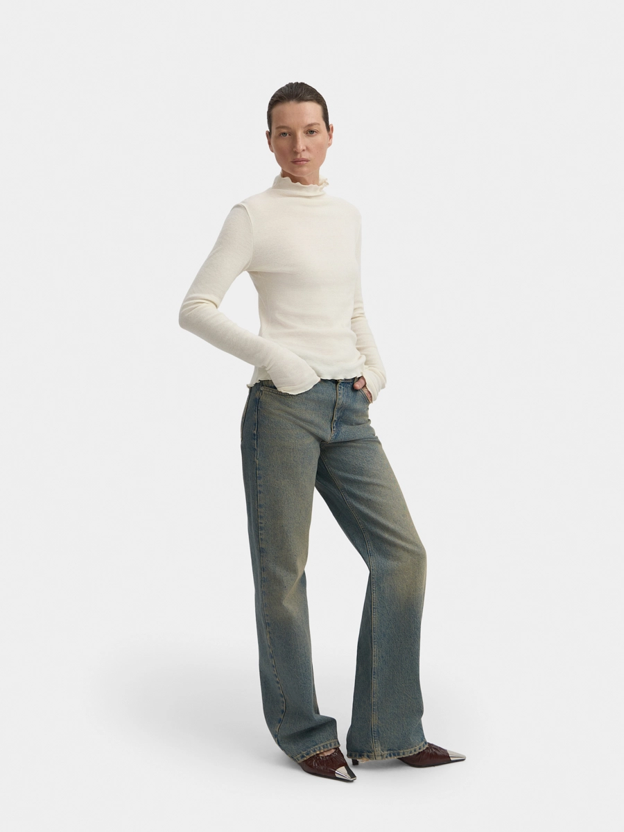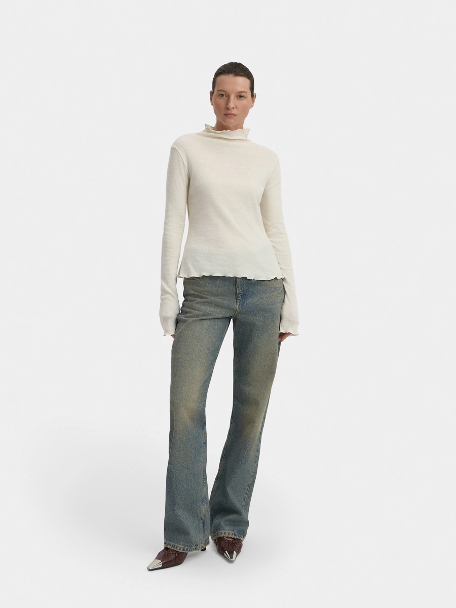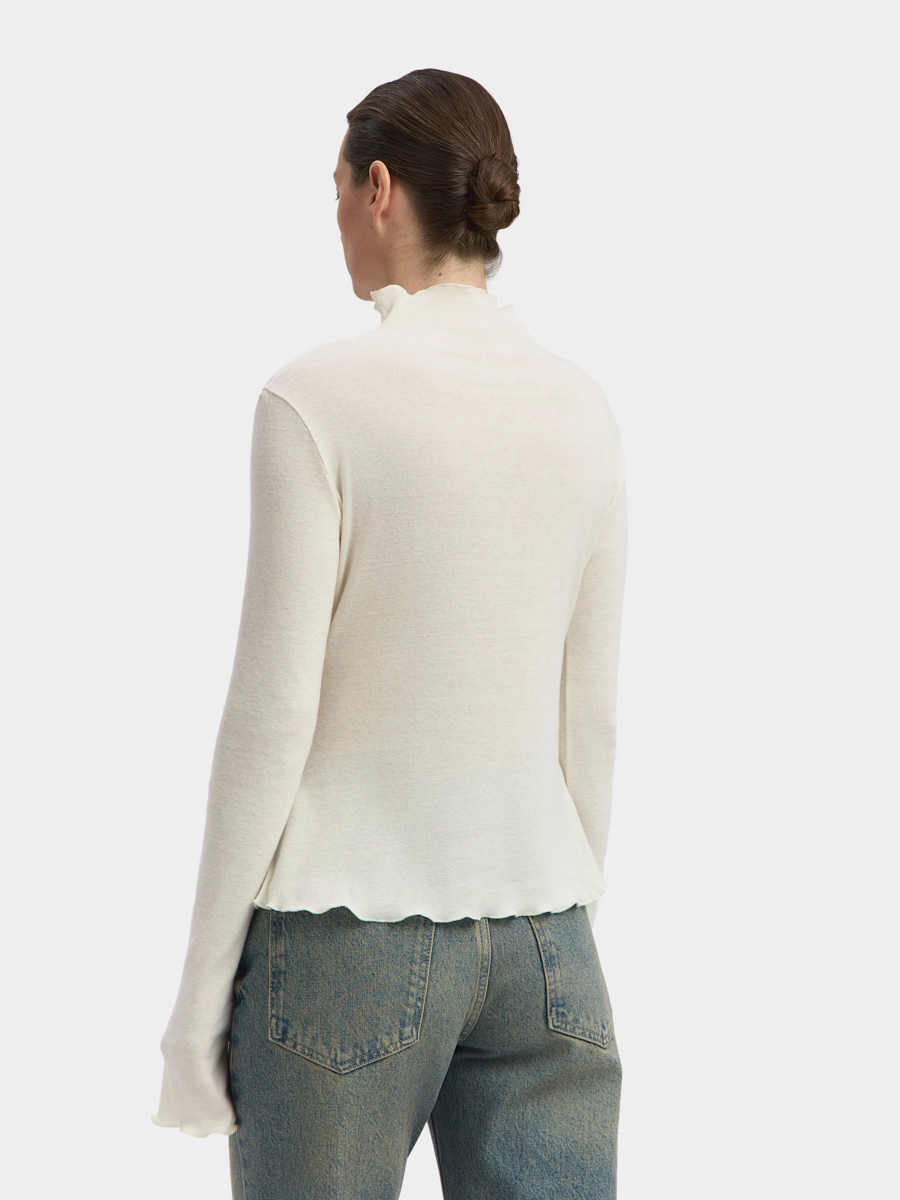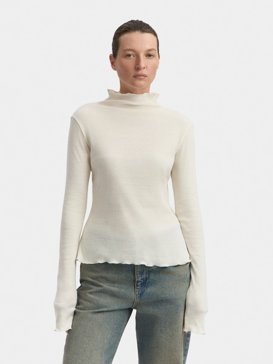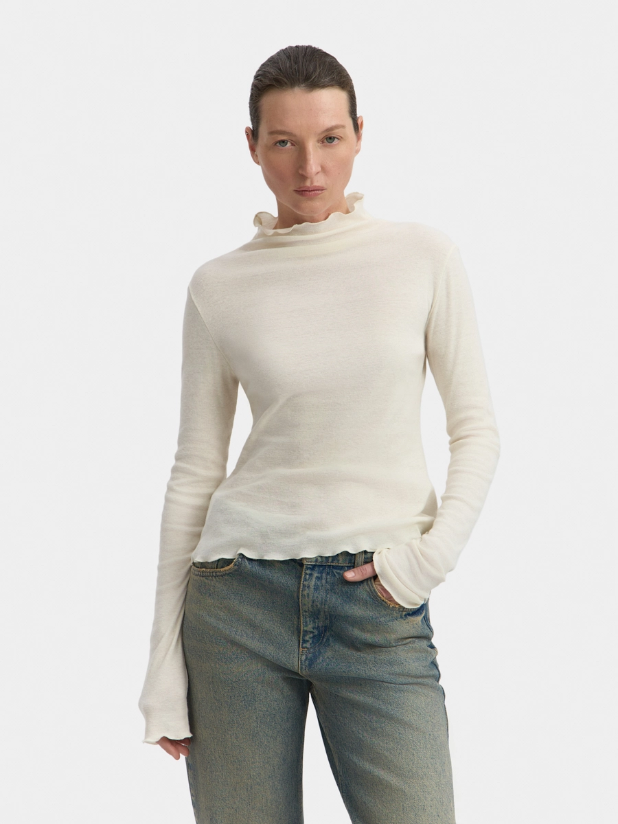 Лонгслив полуприлегающего силуэта с цельнокроеным воротником-стойкой и длинными рукавами. Верхний срез стойки, нижние срезы по рукавам и изделию обработаны декоративными швами.