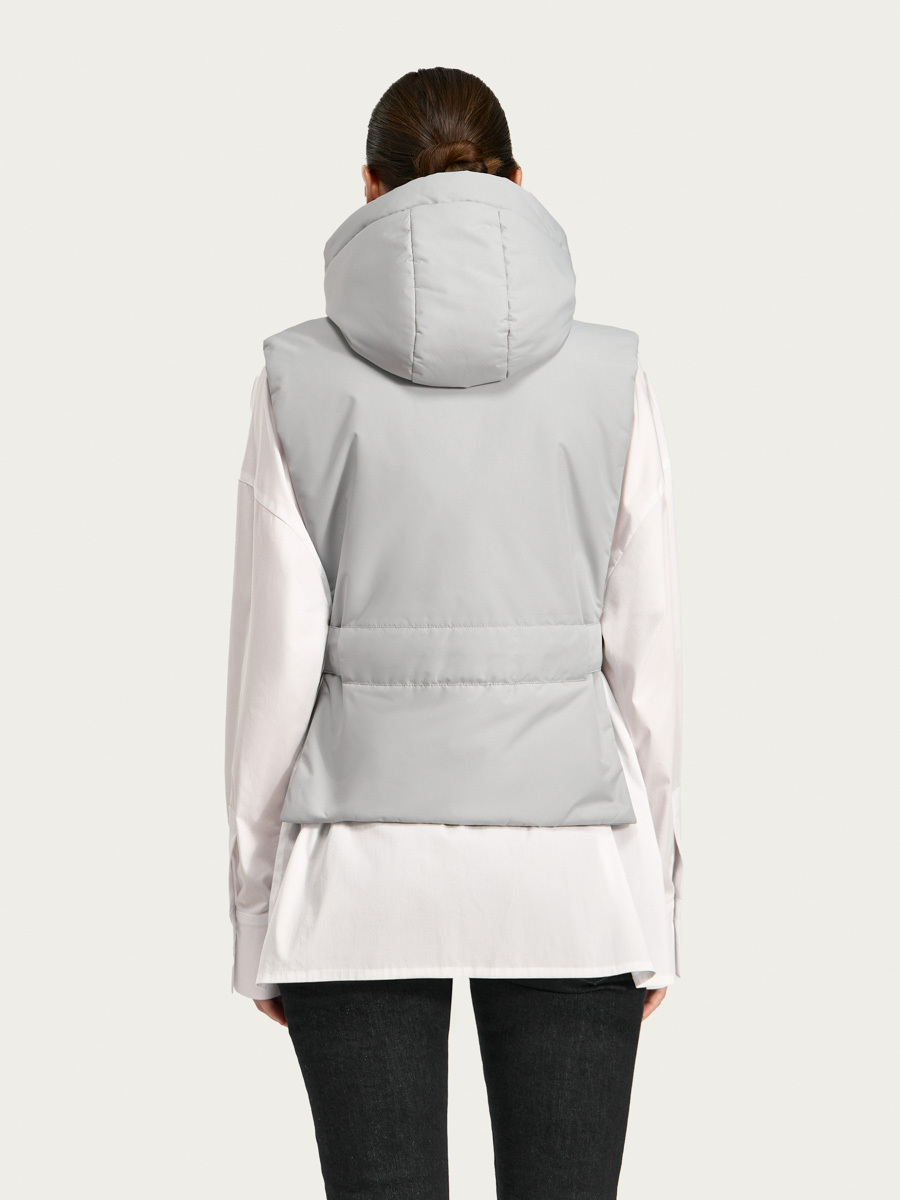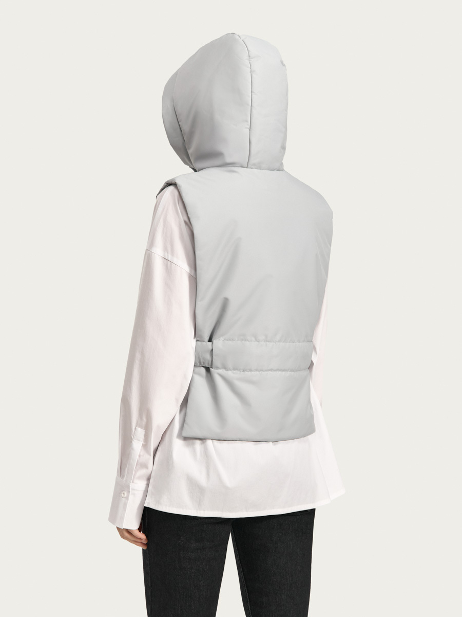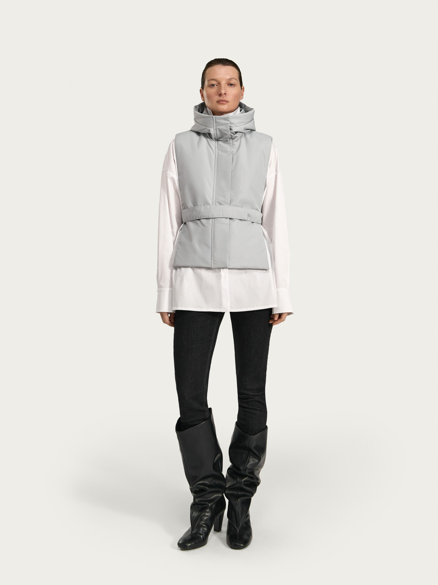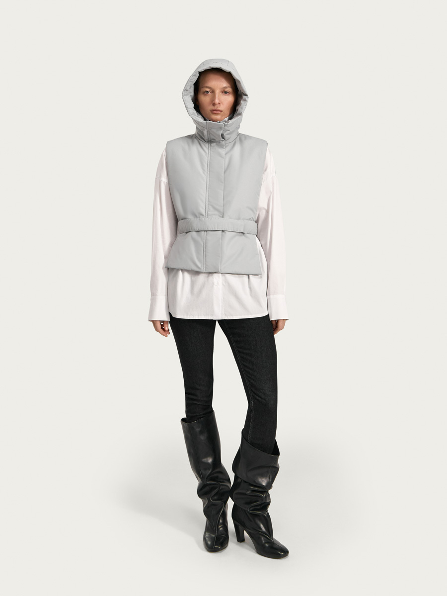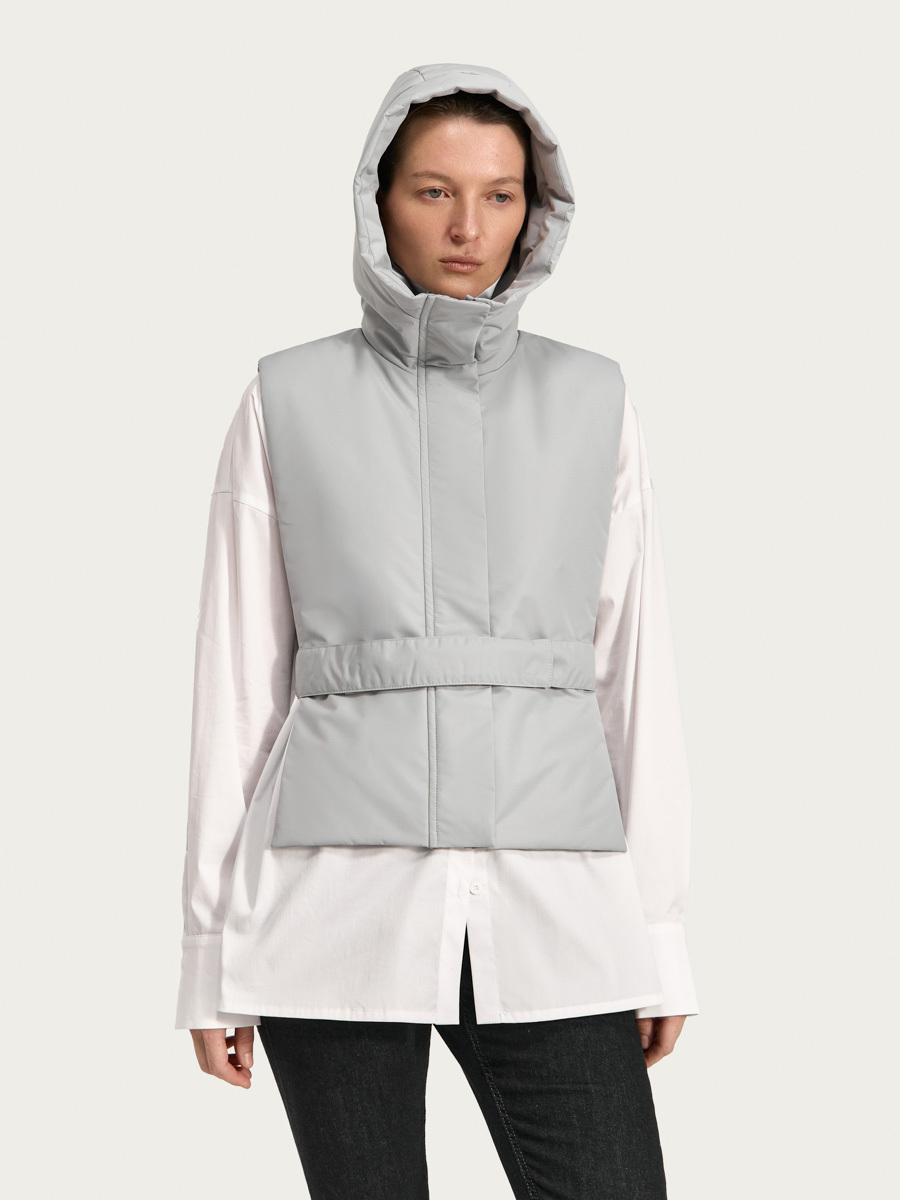 Утеплённая манишка Хельсинки из плащевой ткани. Манишка имеет объемный капюшон и широкую планку с застёжкой на молнию и кнопки. В изделии предусмотрен широкий пояс с кнопками для удобной фиксации и регулировки по талии. Манишку одинаково удобно носить как в качестве жилета поверх свитшотов и рубашек, так и под низ верхней одежды.
