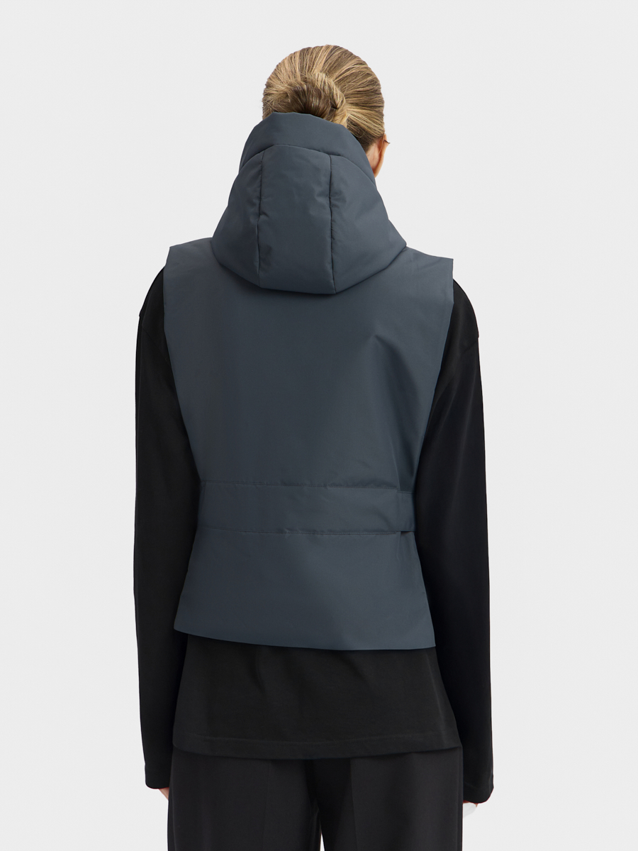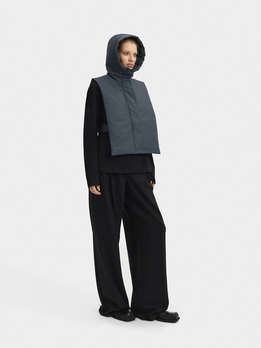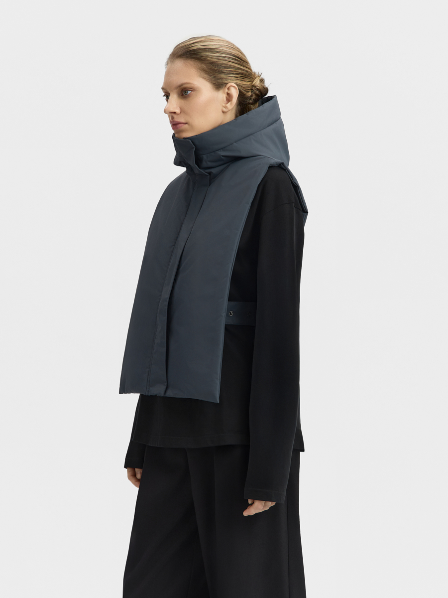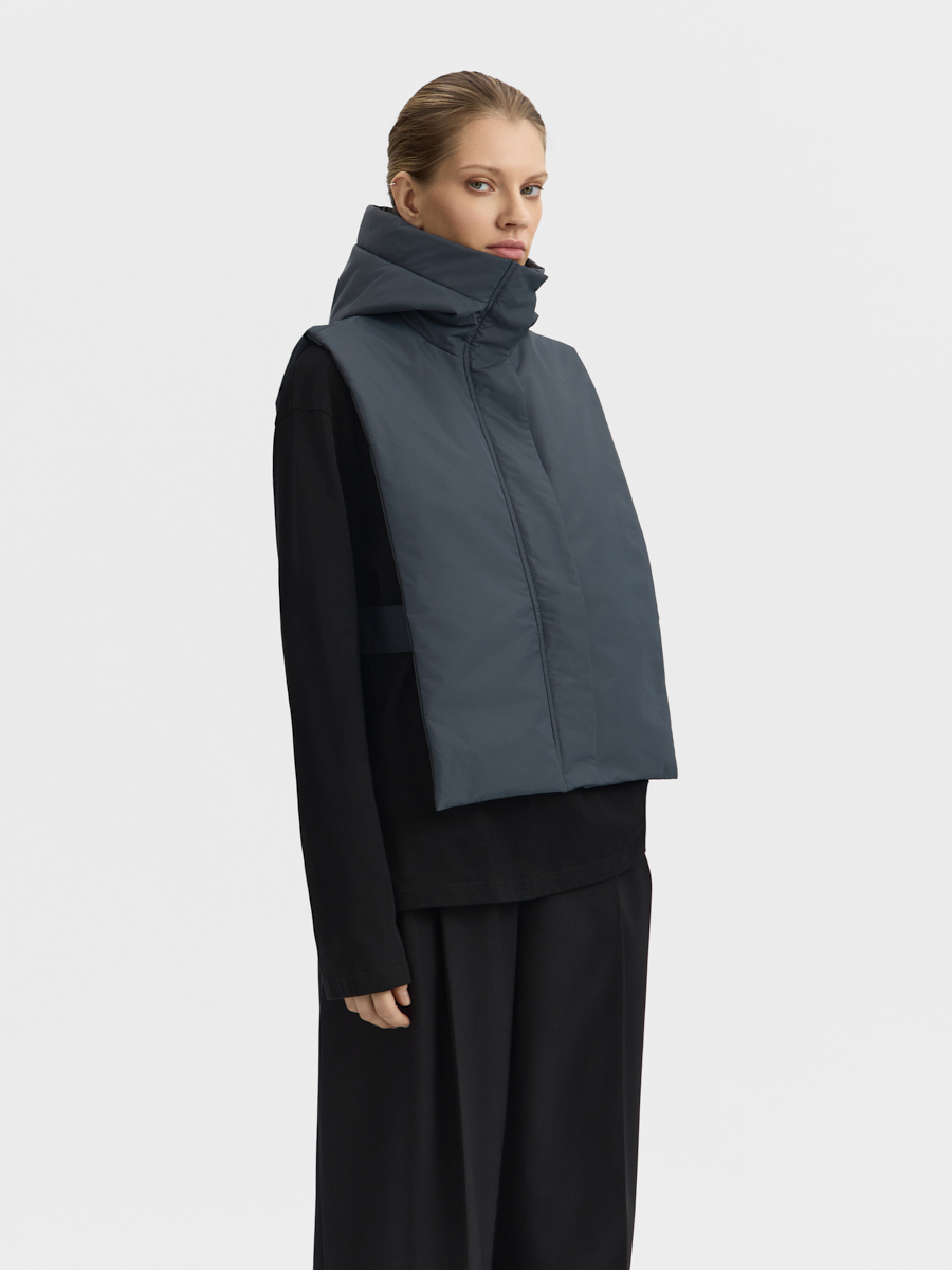 Утеплённая манишка Хельсинки из плащевой ткани. Манишка имеет объемный капюшон и широкую планку с застёжкой на молнию и кнопки. В изделии предусмотрен широкий пояс с кнопками для удобной фиксации и регулировки по талии. Манишку одинаково удобно носить как в качестве жилета поверх свитшотов и рубашек, так и под низ верхней одежды.
