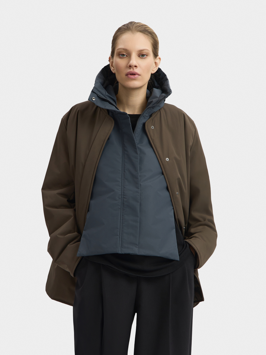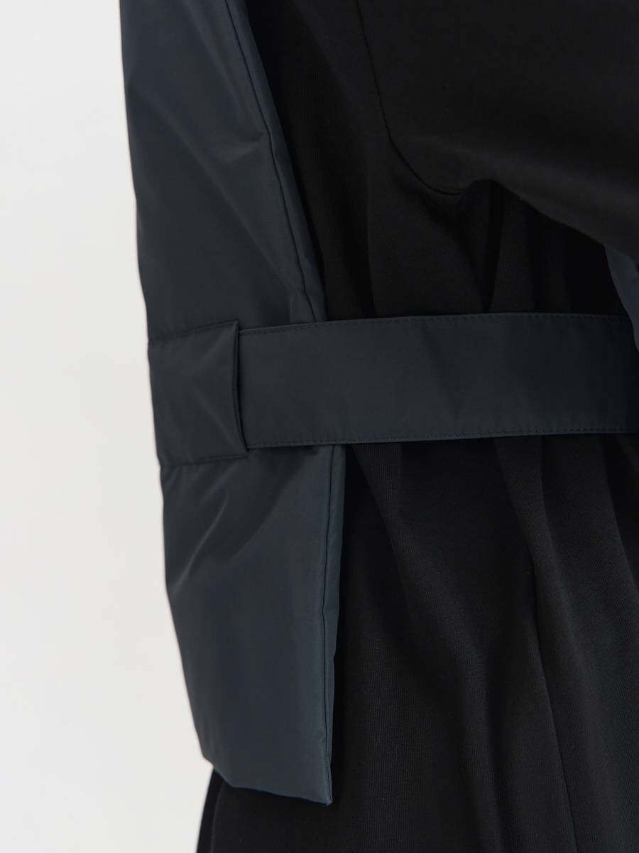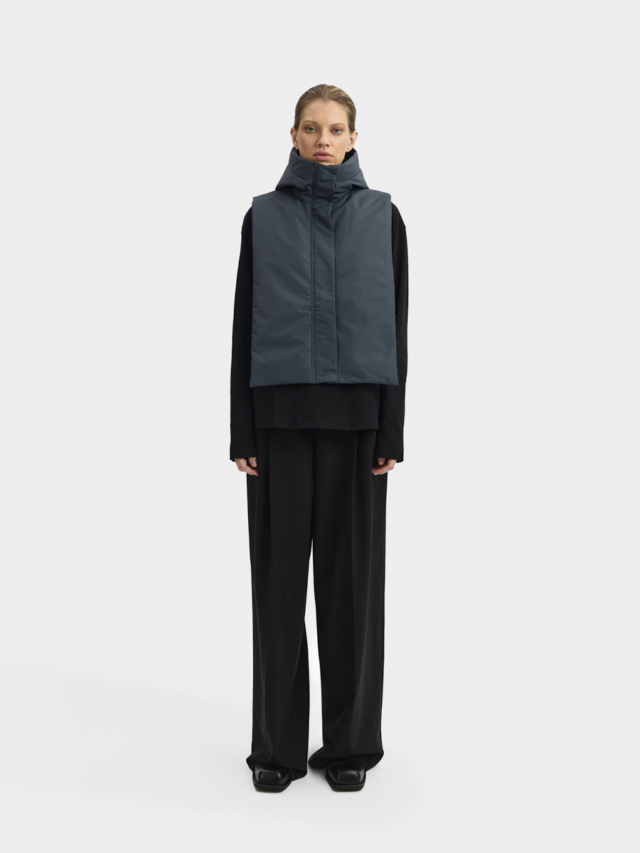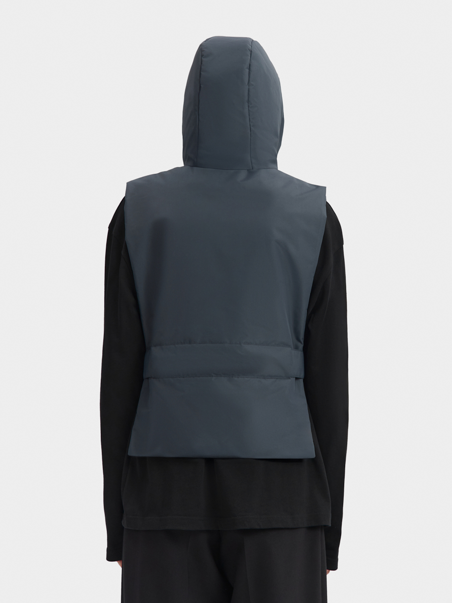 Утеплённая манишка Хельсинки из плащевой ткани. Манишка имеет объемный капюшон и широкую планку с застёжкой на молнию и кнопки. В изделии предусмотрен широкий пояс с кнопками для удобной фиксации и регулировки по талии. Манишку одинаково удобно носить как в качестве жилета поверх свитшотов и рубашек, так и под низ верхней одежды.