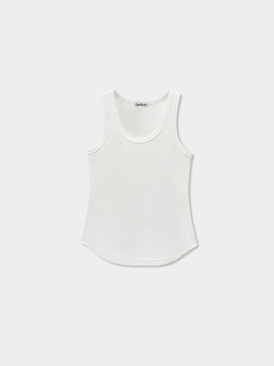 Майка прилегающего силуэта с окантовкой по горловине и проймам и фигурной линией низа.