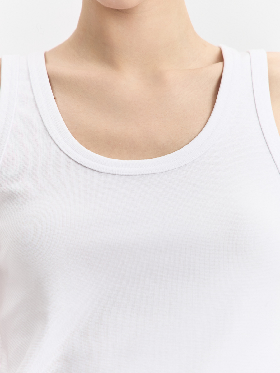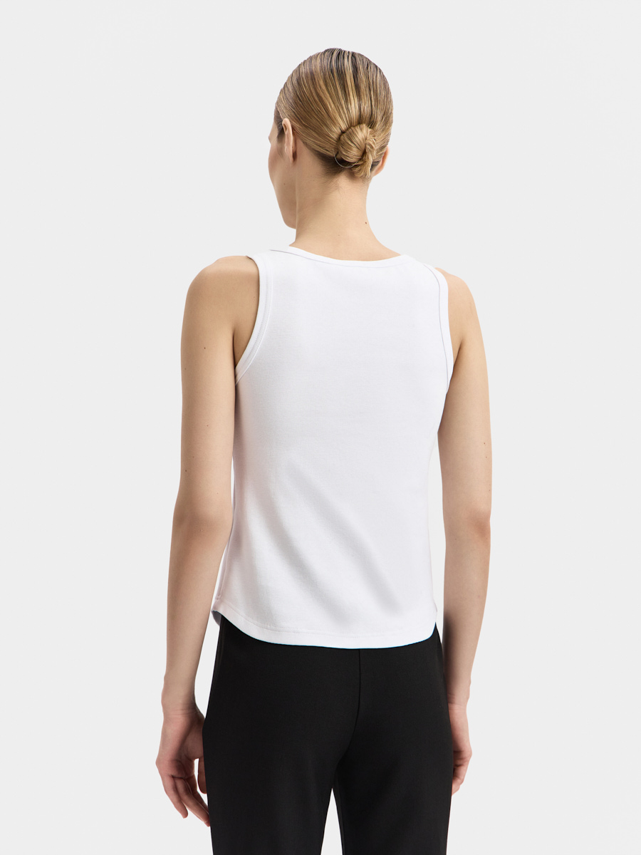 This fitted silhouette tank features a bound neckline and armholes, along with a curved hemline.