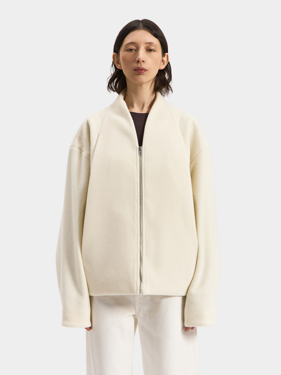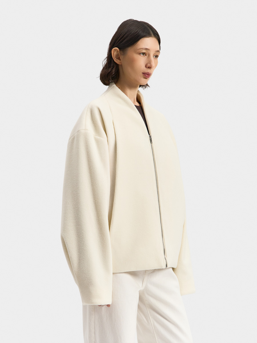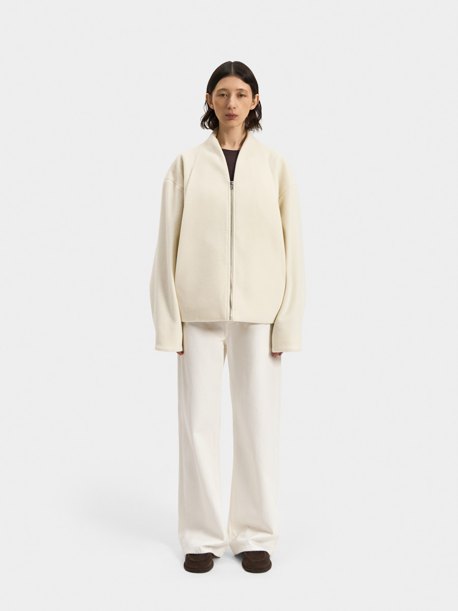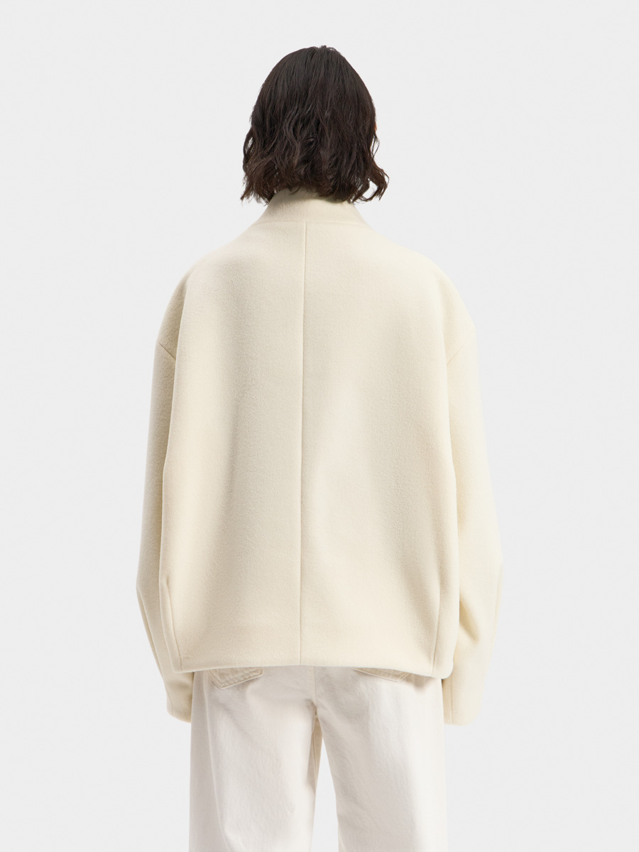 Укороченное пальто Тэгу выполнено из мягкой формоустойчивой ворсовой ткани. Пальто округлого оверсайз силуэта с небольшой цельнокроеной стойкой и застёжкой на молнию. Объём изделия создаётся за счет вытачек по низу и глубоких декоративных складок на полочках. В складках обработаны карманы в шве. Рукав объёмный с застроченной складкой по низу.