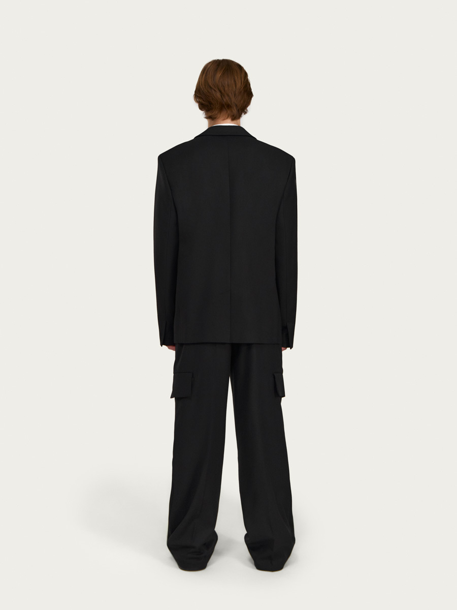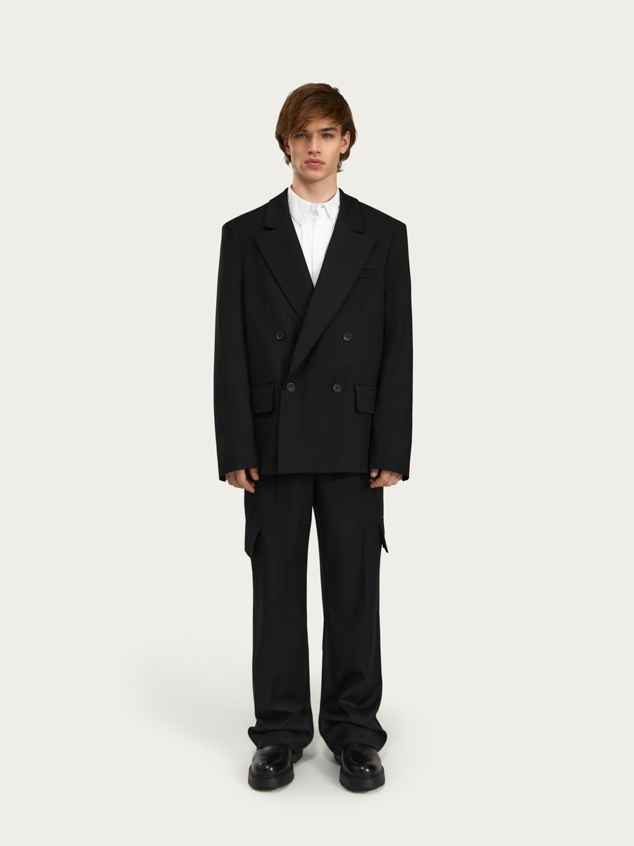 Мужской двубортный пиджак Брюссель оверсайз силуэта с классическим английским воротником и застежкой на пуговицы. На полочках расположены прорезные карманы с клапанами, а также нагрудный карман с листочкой с левой стороны. Рукава двухшовные со шлицей. Спинка со средним швом и шлицей.