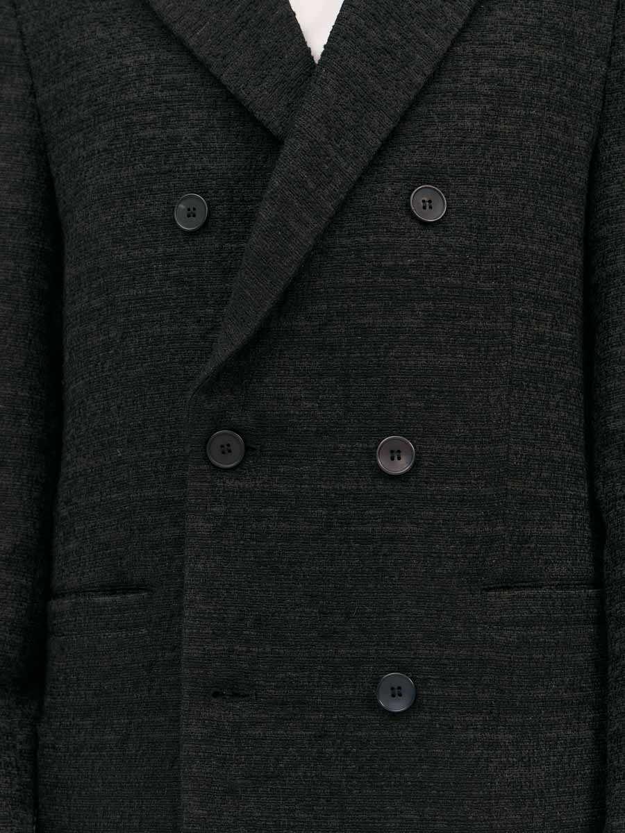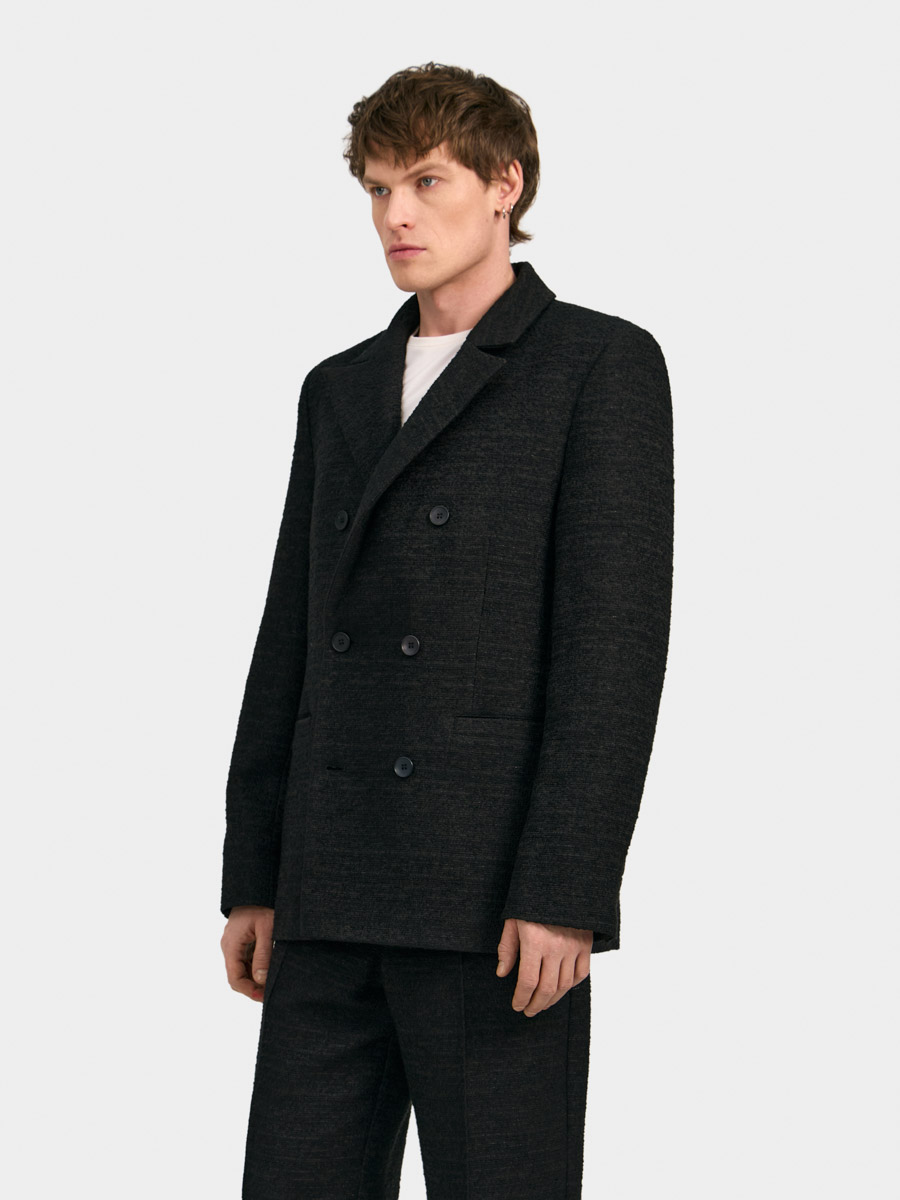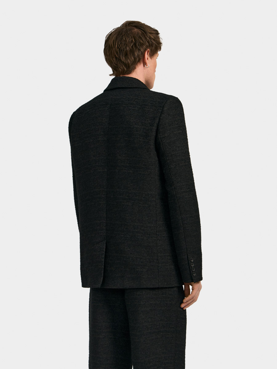 Мужской двубортный пиджак Шеффилд прямого силуэта выполнен из фактурного твида. Пиджак с классическим английским воротником и застёжкой на пуговицы. На полочках расположены вытачки и прорезные карманы с листочкой. Рукава двухшовные со шлицей и пуговицами. Спинка со средним швом и шлицей.