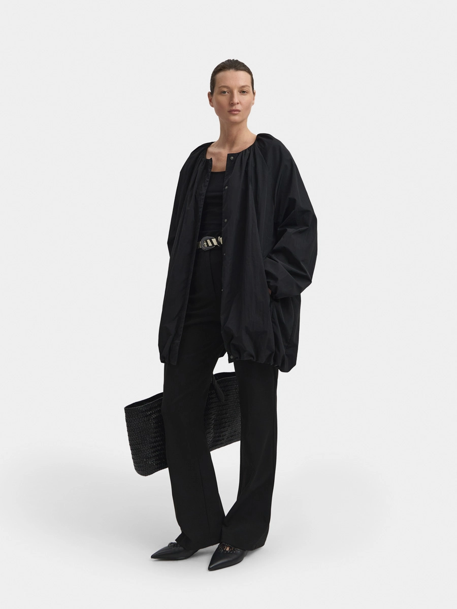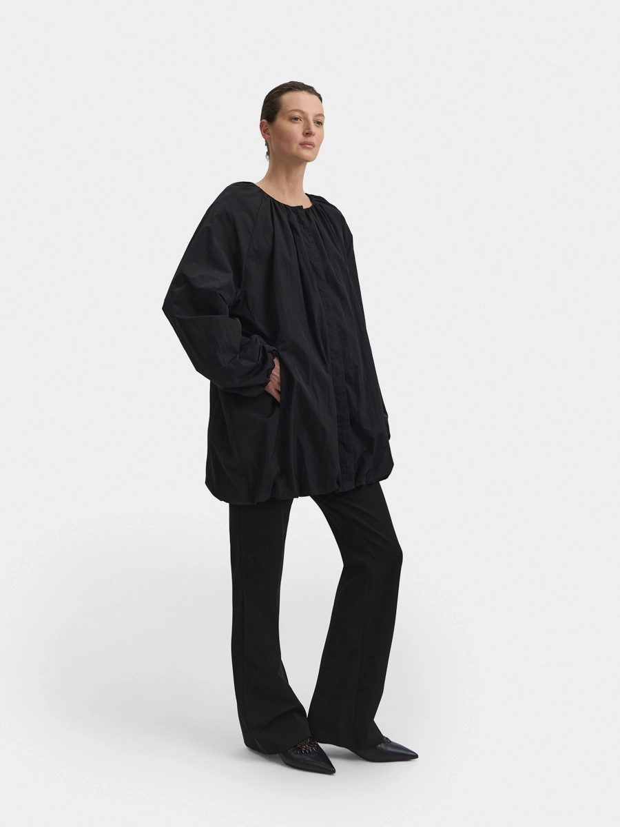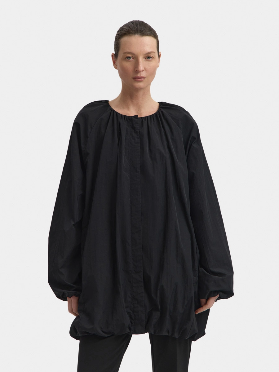 Плащ со сборкой по горловине, рукавам и низу изделия, застёжка спереди на потайные кнопки, в смещенных боковых швах обработаны карманы. Изделие на подкладке.