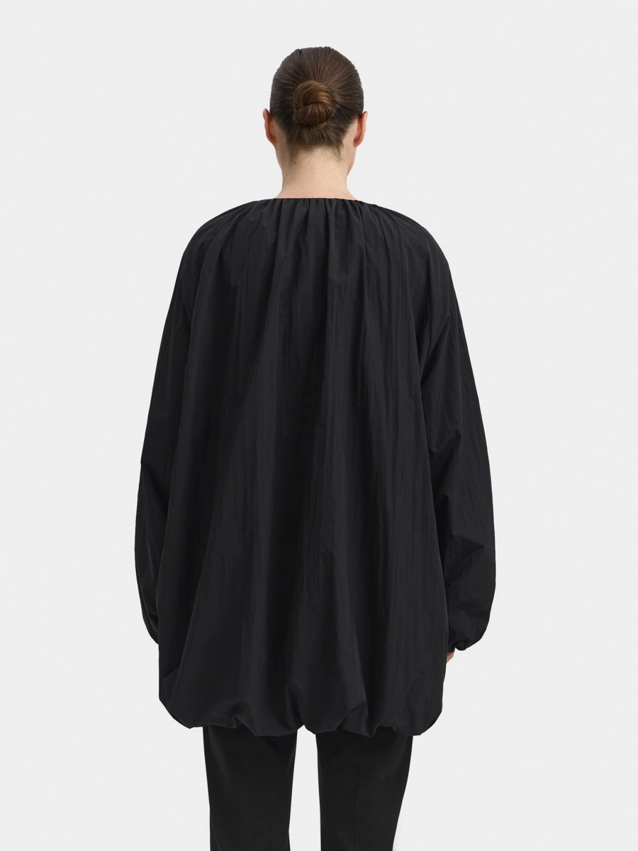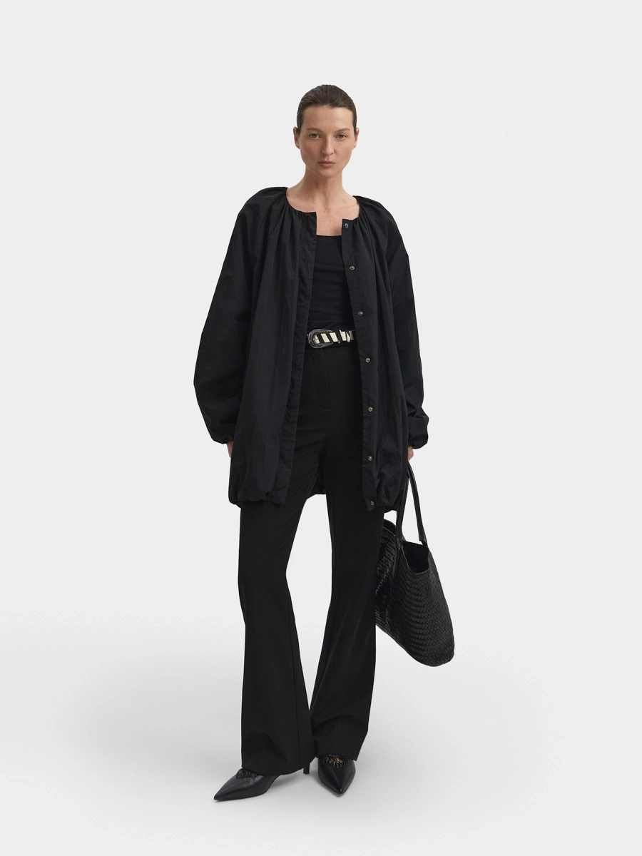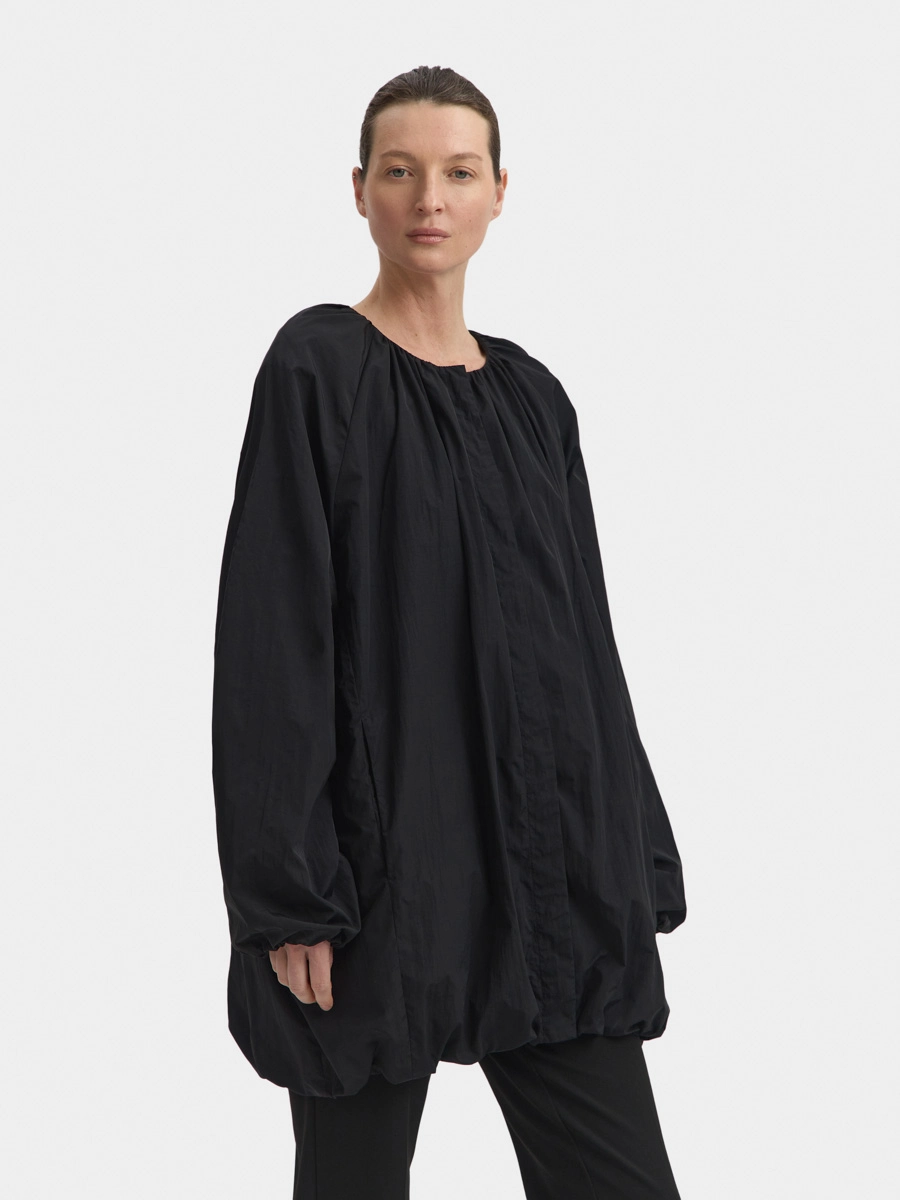 Плащ со сборкой по горловине, рукавам и низу изделия, застёжка спереди на потайные кнопки, в смещенных боковых швах обработаны карманы. Изделие на подкладке.
