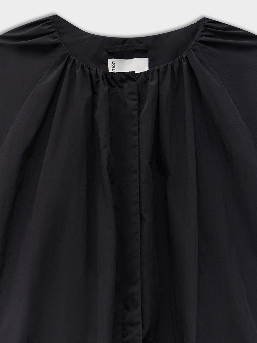 This trench coat features neck, sleeves, and hem gatherings, a front closure with hidden snap buttons, and side seams pockets. The garment is fully lined.