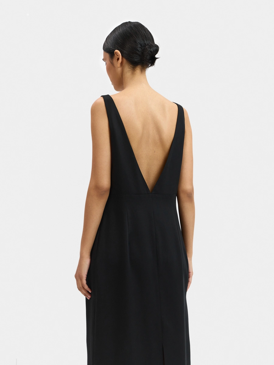 Платье полуприлегающего силуэта с V-образным вырезом спереди и сзади, разрезом в среднем шве спинки и карманами в боковых швах.