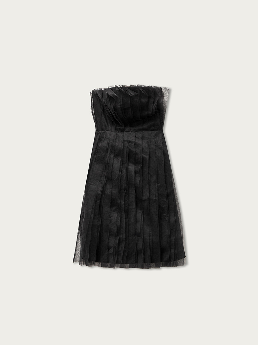 Спереди настрочены вертикальные полосы из слоёв сетки, которые закреплены на талии сквозной строчкой, задающей направление полос.