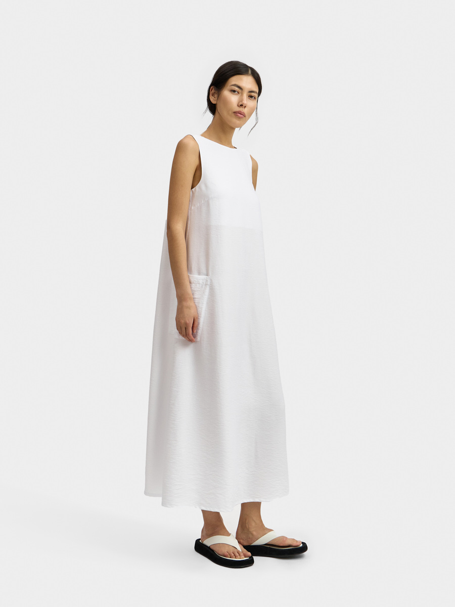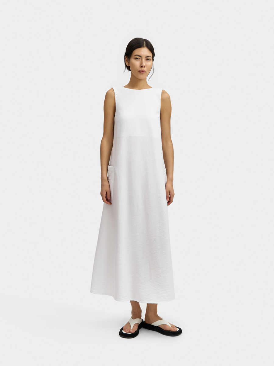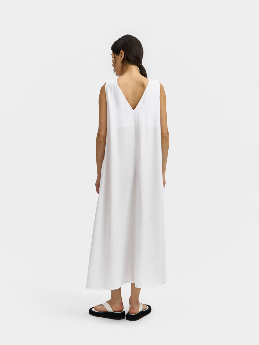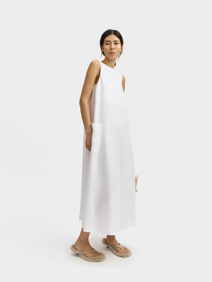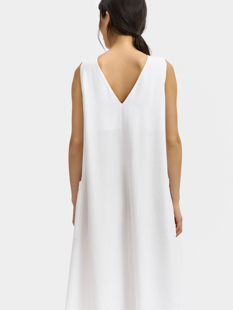 Платье без рукавов в длине макси имеет А-силуэт, круглый вырез горловины спереди и V-вырез сзади, накладные карманы по бокам.