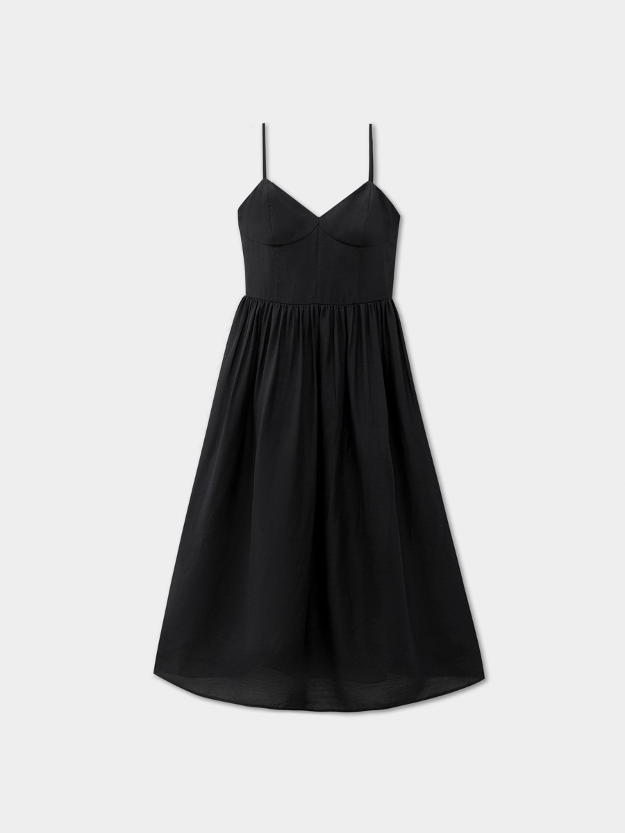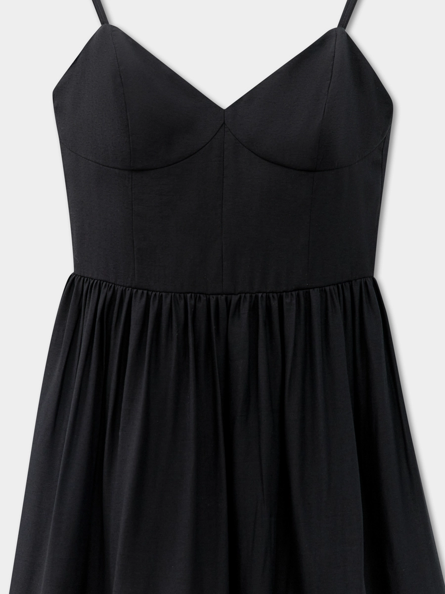 Платье в бельевом стиле, отрезное по талии с пышной юбкой со сборкой. Лиф полуприлегающий на тонких бретелях с регулировкой. Перед с V-образным вырезом и отрезными деталями чашек. Перед и спинка с рельефами и средним швом. В среднем шве спинки обработана застёжка на потайную молнию.