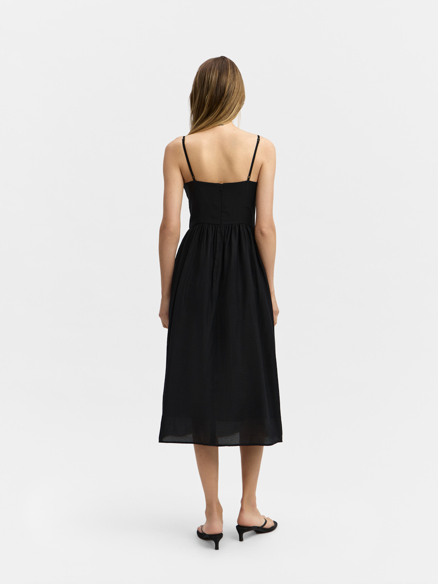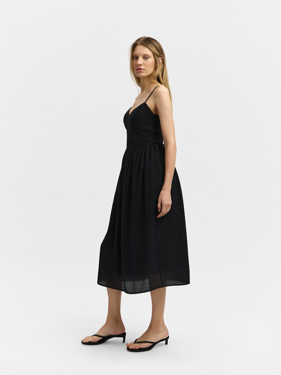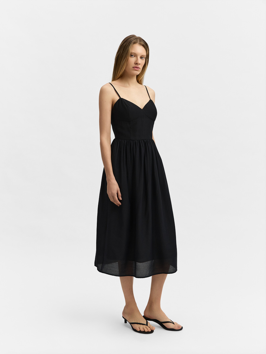 Платье в бельевом стиле, отрезное по талии с пышной юбкой со сборкой. Лиф полуприлегающий на тонких бретелях с регулировкой. Перед с V-образным вырезом и отрезными деталями чашек. Перед и спинка с рельефами и средним швом. В среднем шве спинки обработана застёжка на потайную молнию.