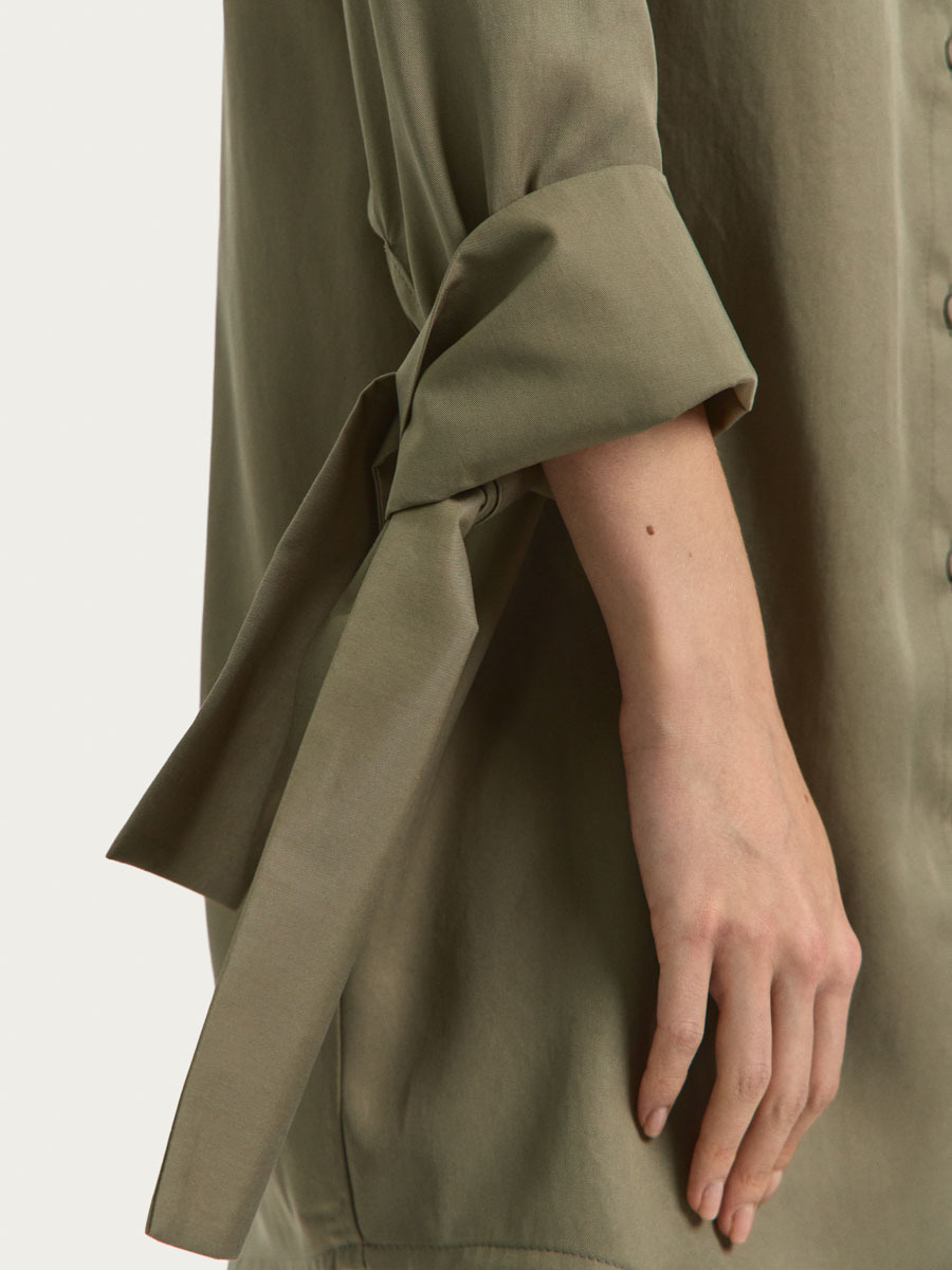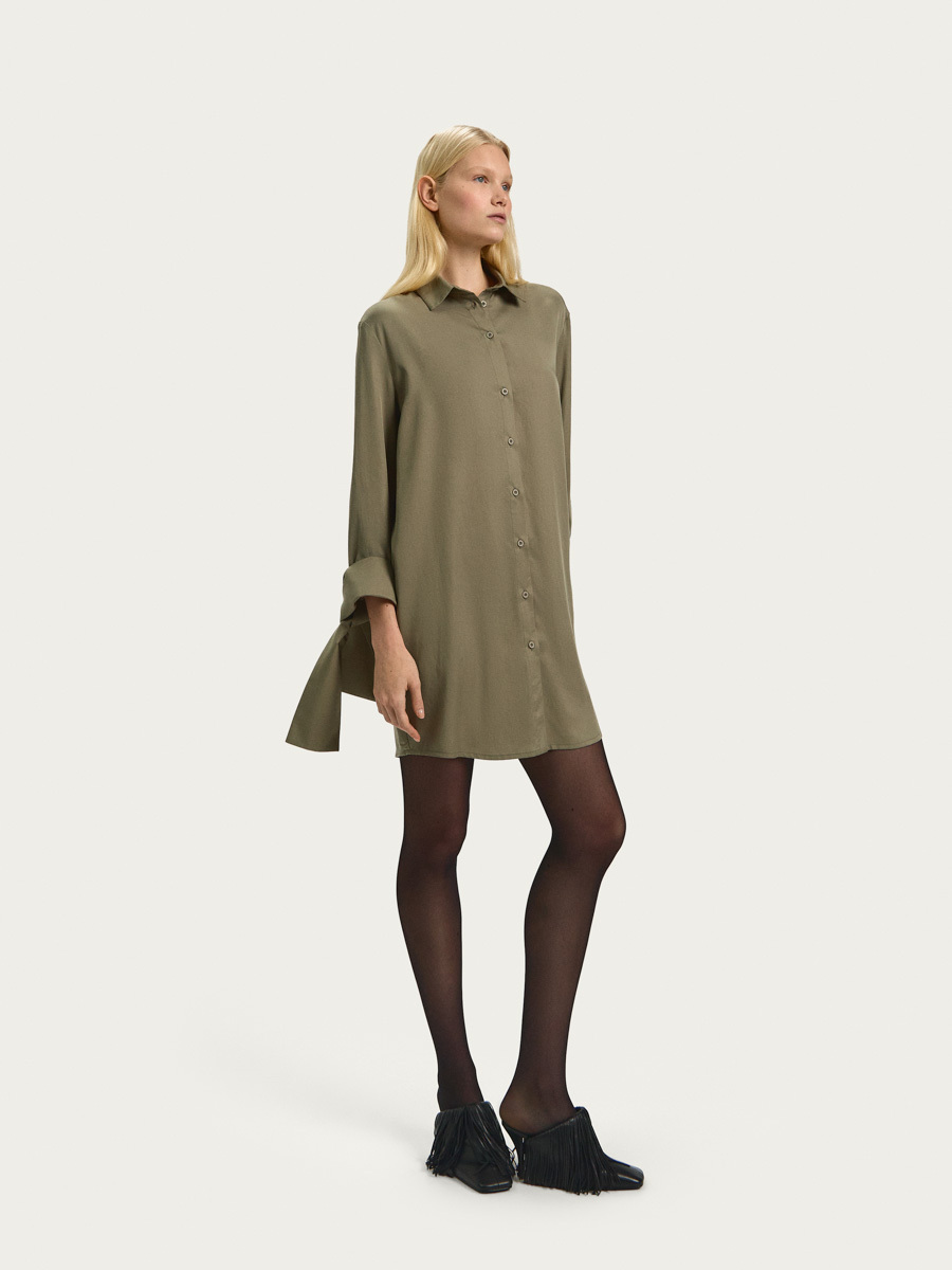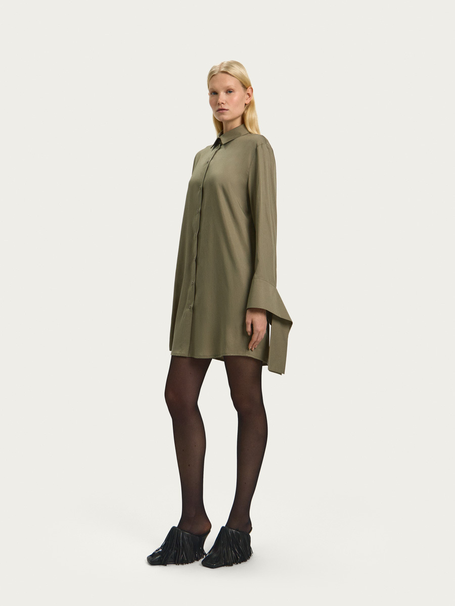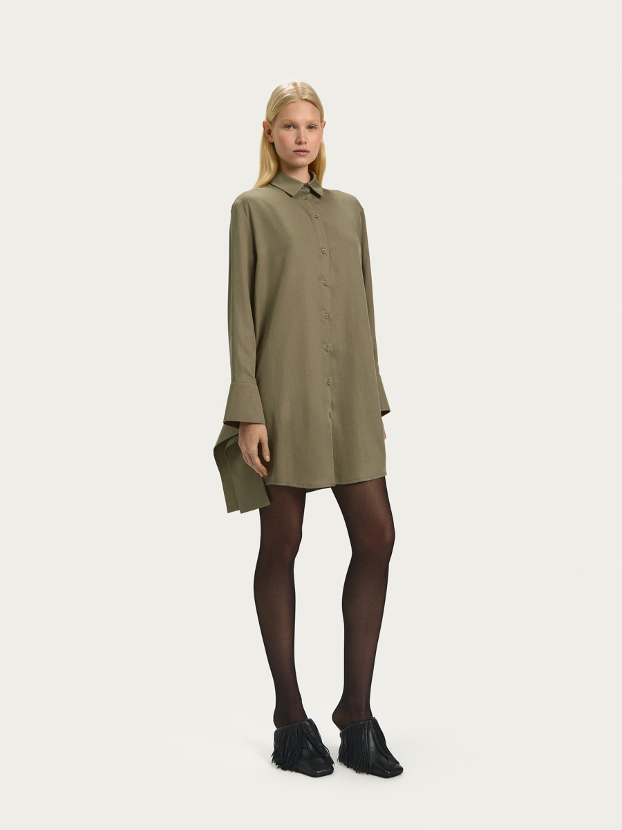 Платье со спущенной линией плеча имеет застежку на петли и пуговицы, скругленную линию низа и классический рубашечный воротник. Рукав длинный с разрезами и широкими декоративными манжетами, которые можно носить в свободном виде или завязывать на узел.
