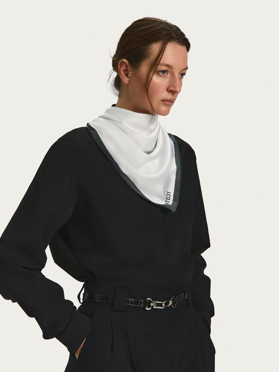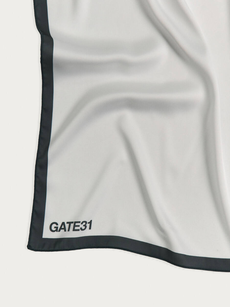 Платок GATE31 из струящейся атласной ткани. По краю платка выполнена тонкая контрастная рамка и логотипы бренда.
