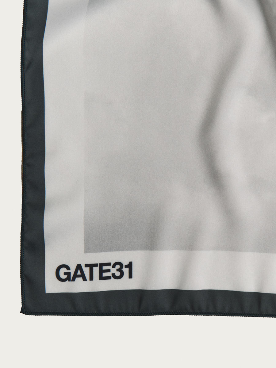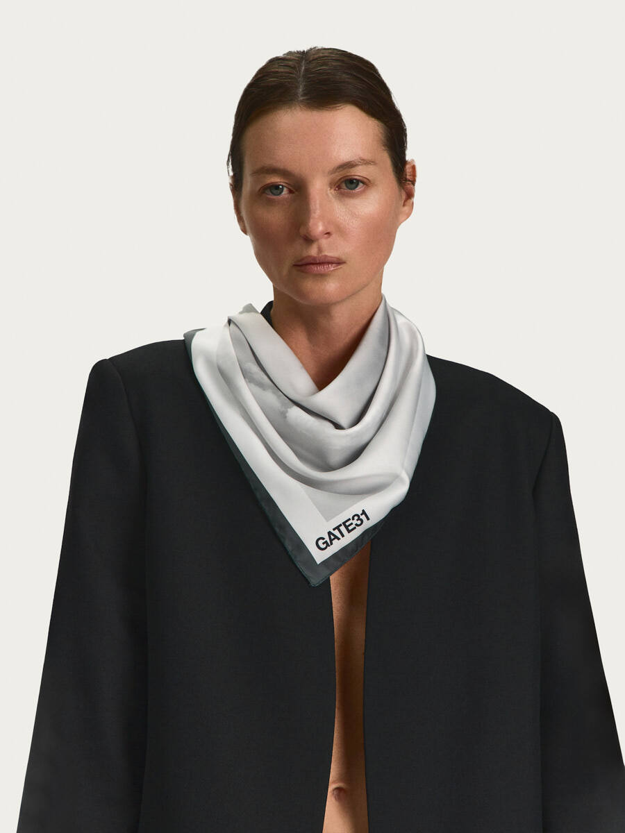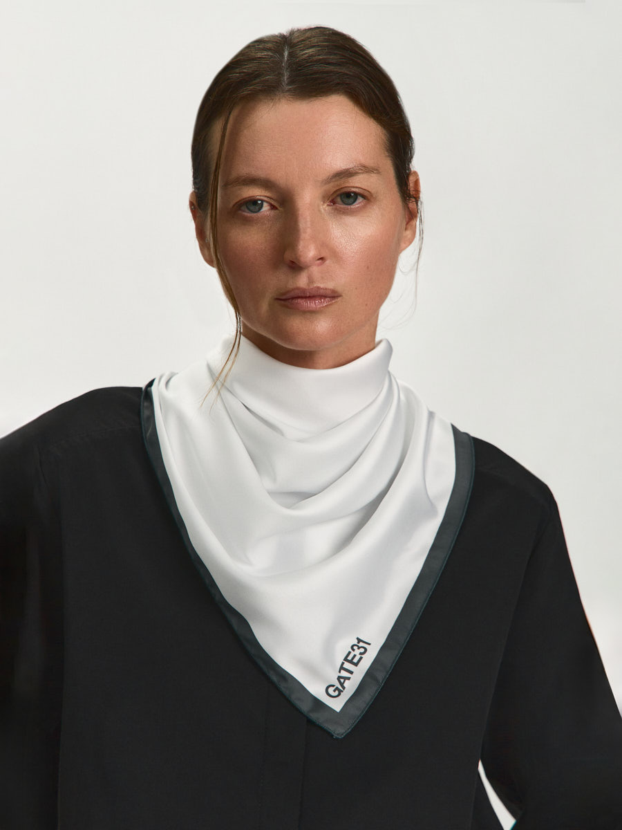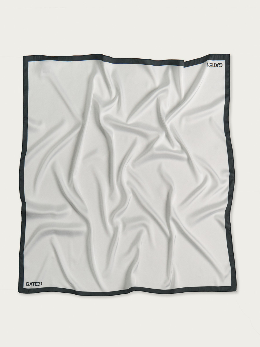 Платок GATE31 из струящейся атласной ткани. По краю платка выполнена тонкая контрастная рамка и логотипы бренда.