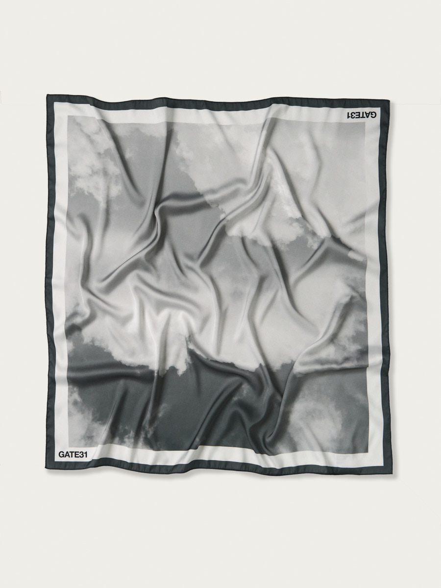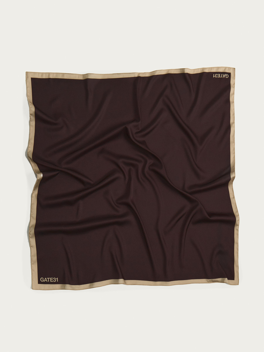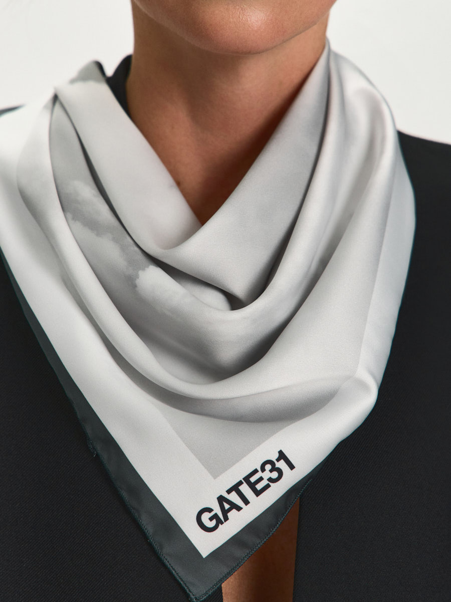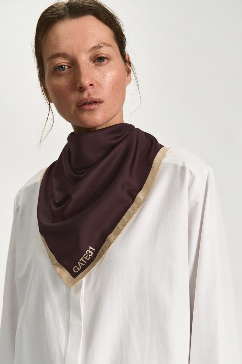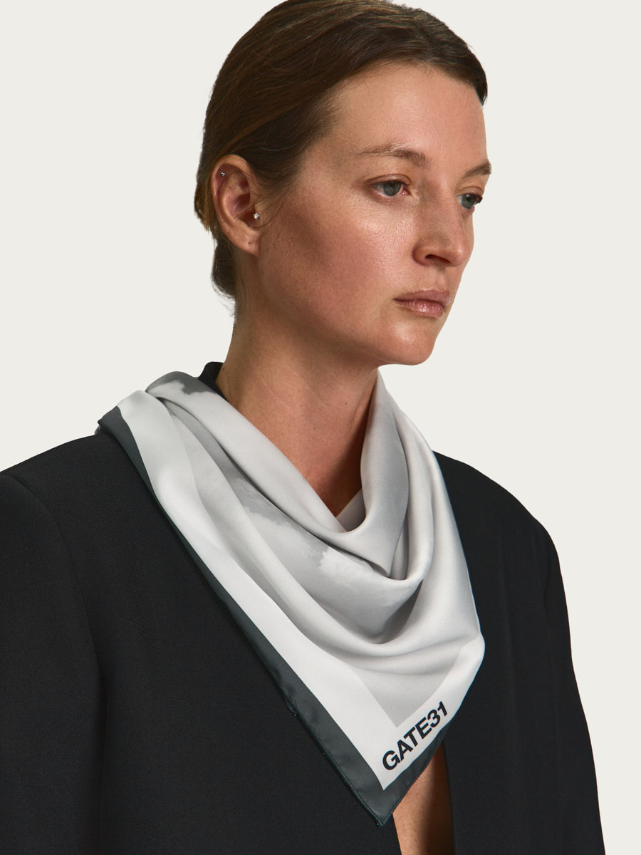 Платок GATE31 из струящейся атласной ткани. По краю платка выполнена тонкая контрастная рамка и логотипы бренда.
