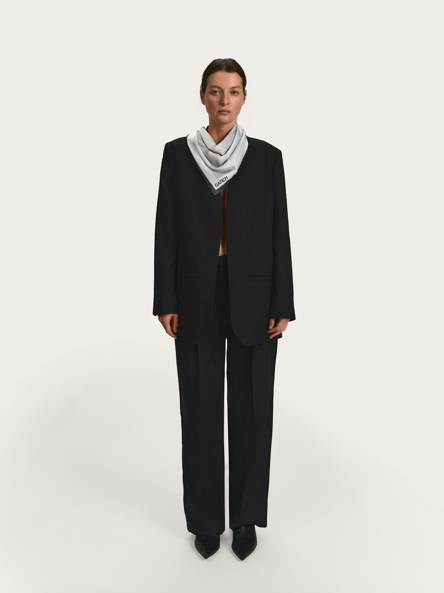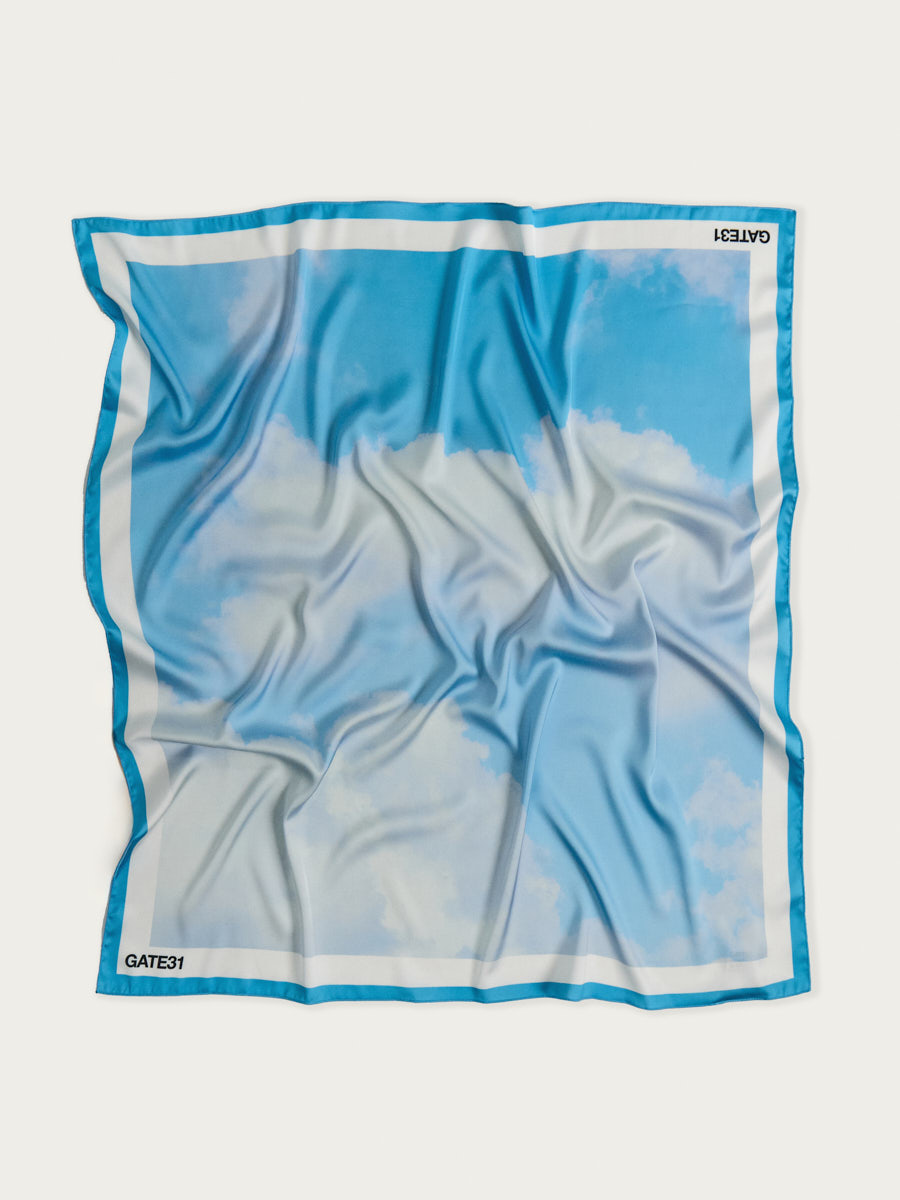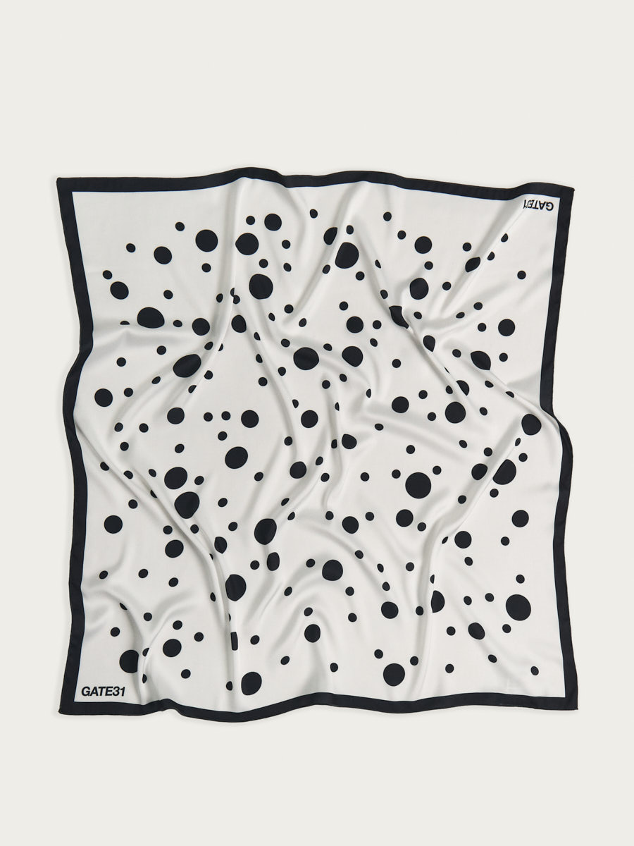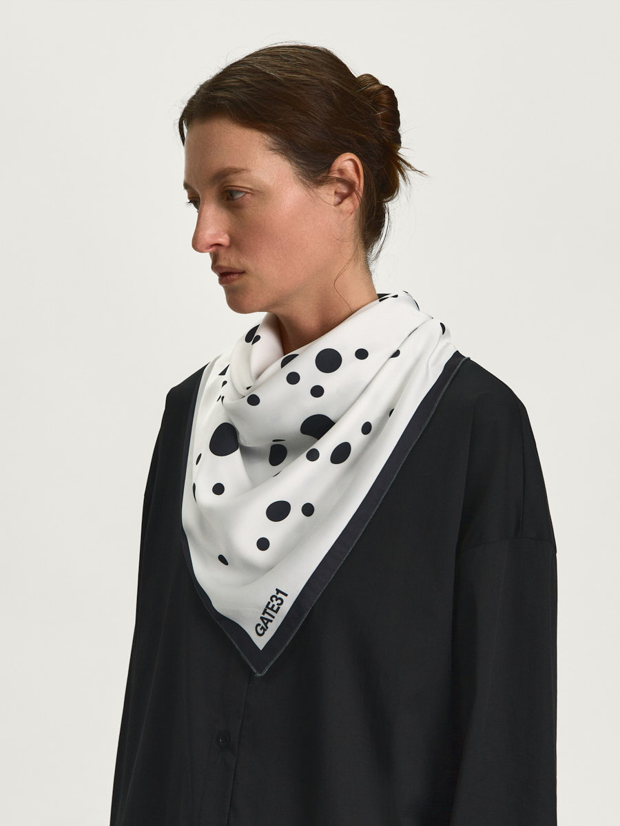 Платок GATE31 из струящейся атласной ткани. По краю платка выполнена тонкая контрастная рамка и логотипы бренда.