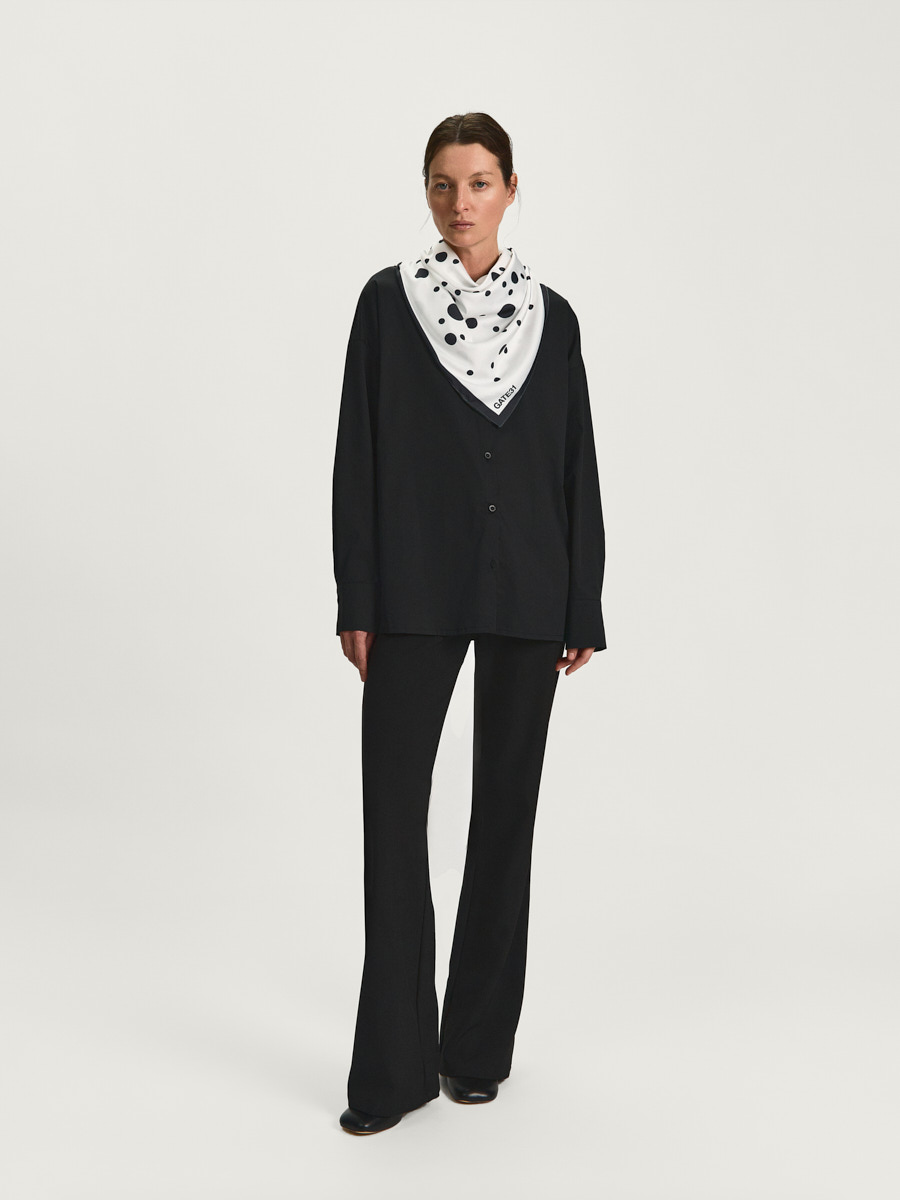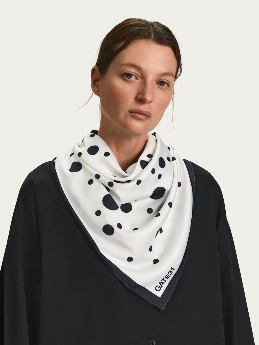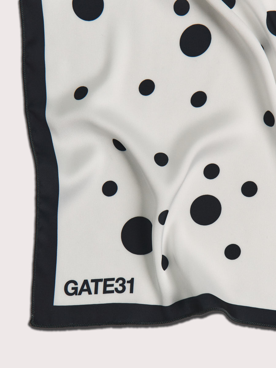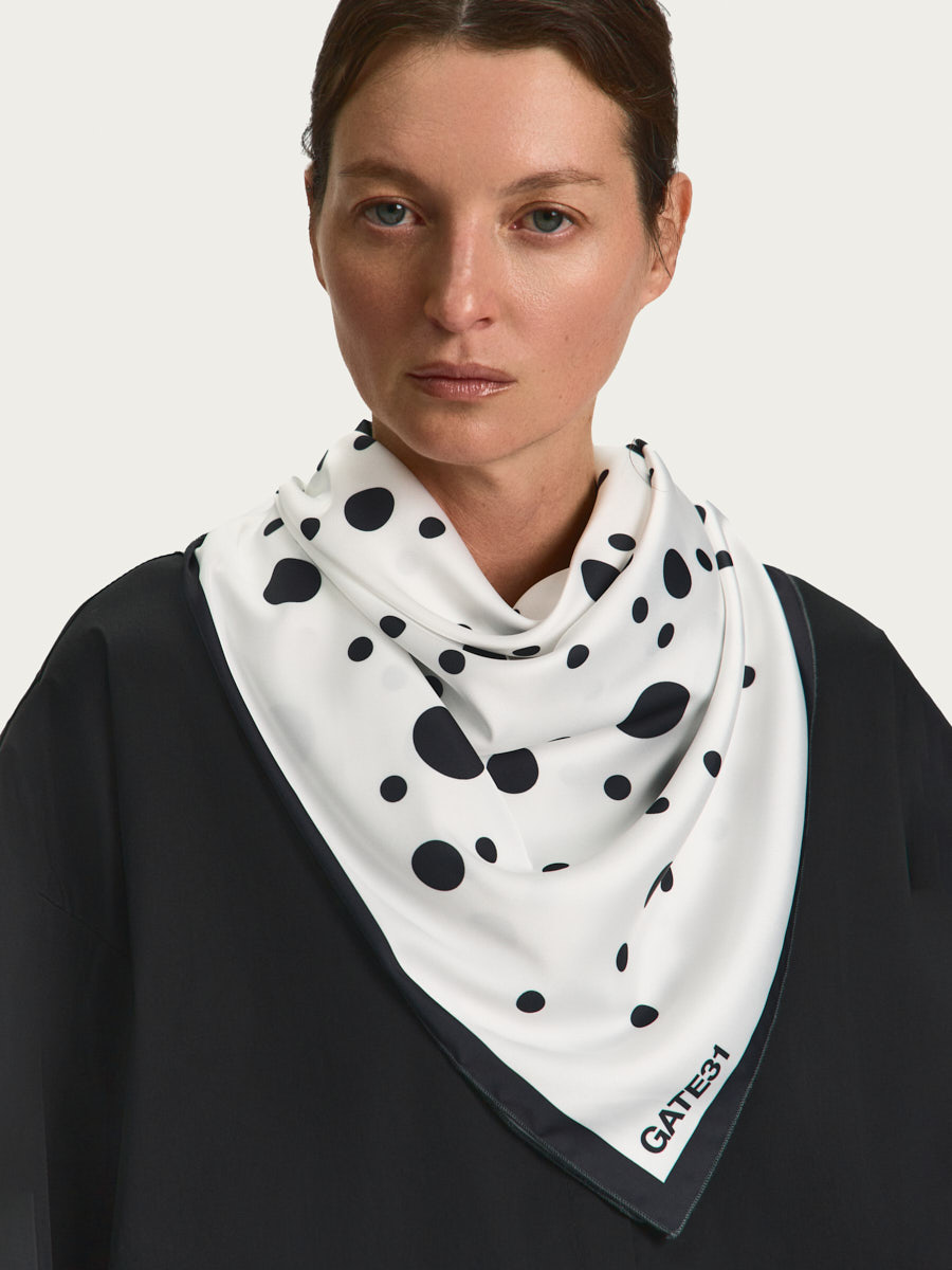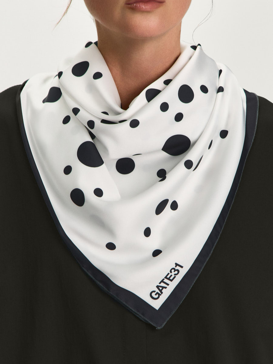 Платок GATE31 из струящейся атласной ткани. По краю платка выполнена тонкая контрастная рамка и логотипы бренда.
