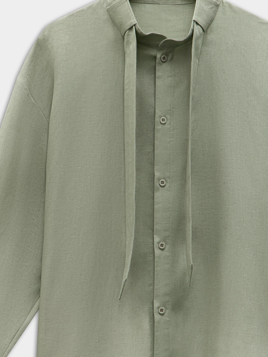 This straight silhouette shirt features a stand-up collar, a front button closure, and long sleeves finished with buttoned cuffs — when fastened, the cuffs create a soft pleat at the sleeve hem. The collar is complemented with wide loops and a removable twilly scarf. The hem has a curved silhouette.