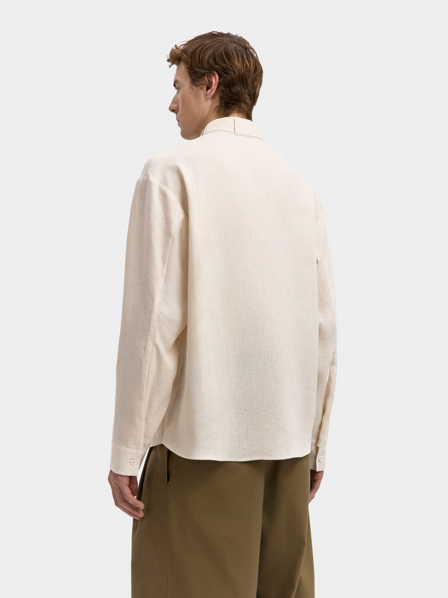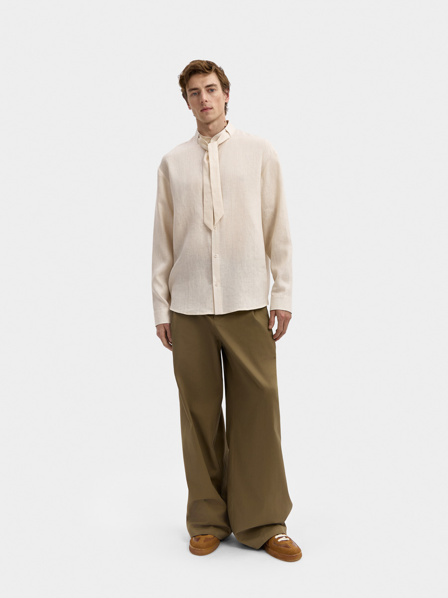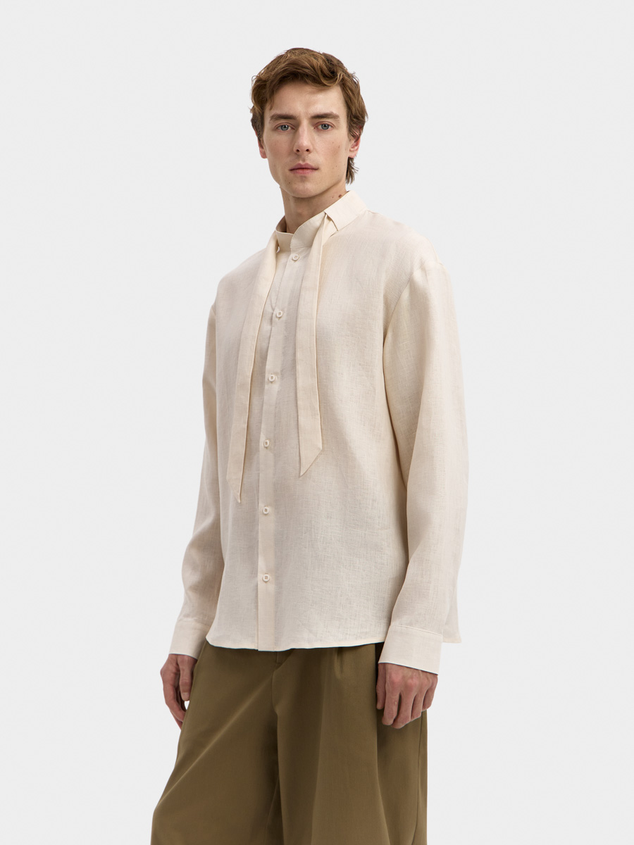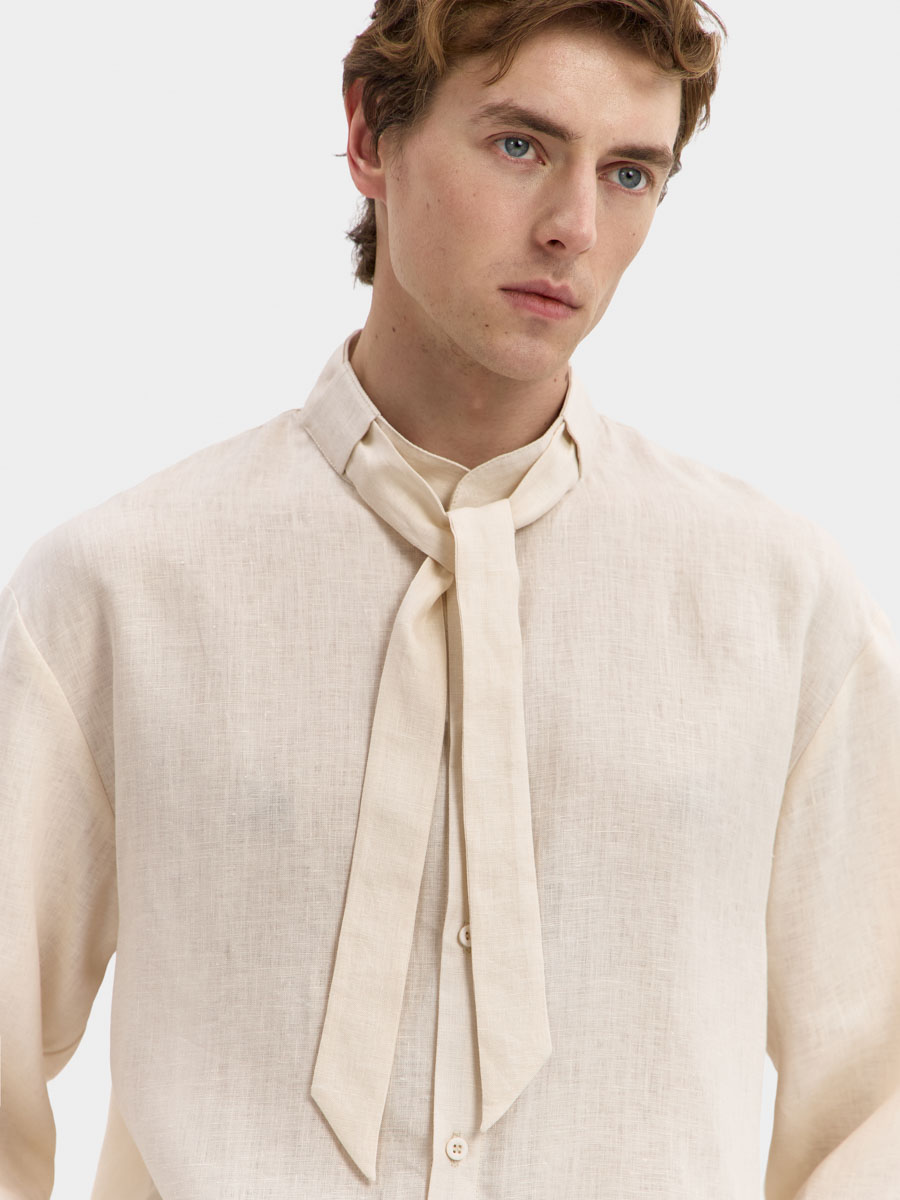 This straight silhouette shirt features a stand-up collar, a front button closure, and long sleeves finished with buttoned cuffs — when fastened, the cuffs create a soft pleat at the sleeve hem. The collar is complemented with wide loops and a removable twilly scarf. The hem has a curved silhouette.