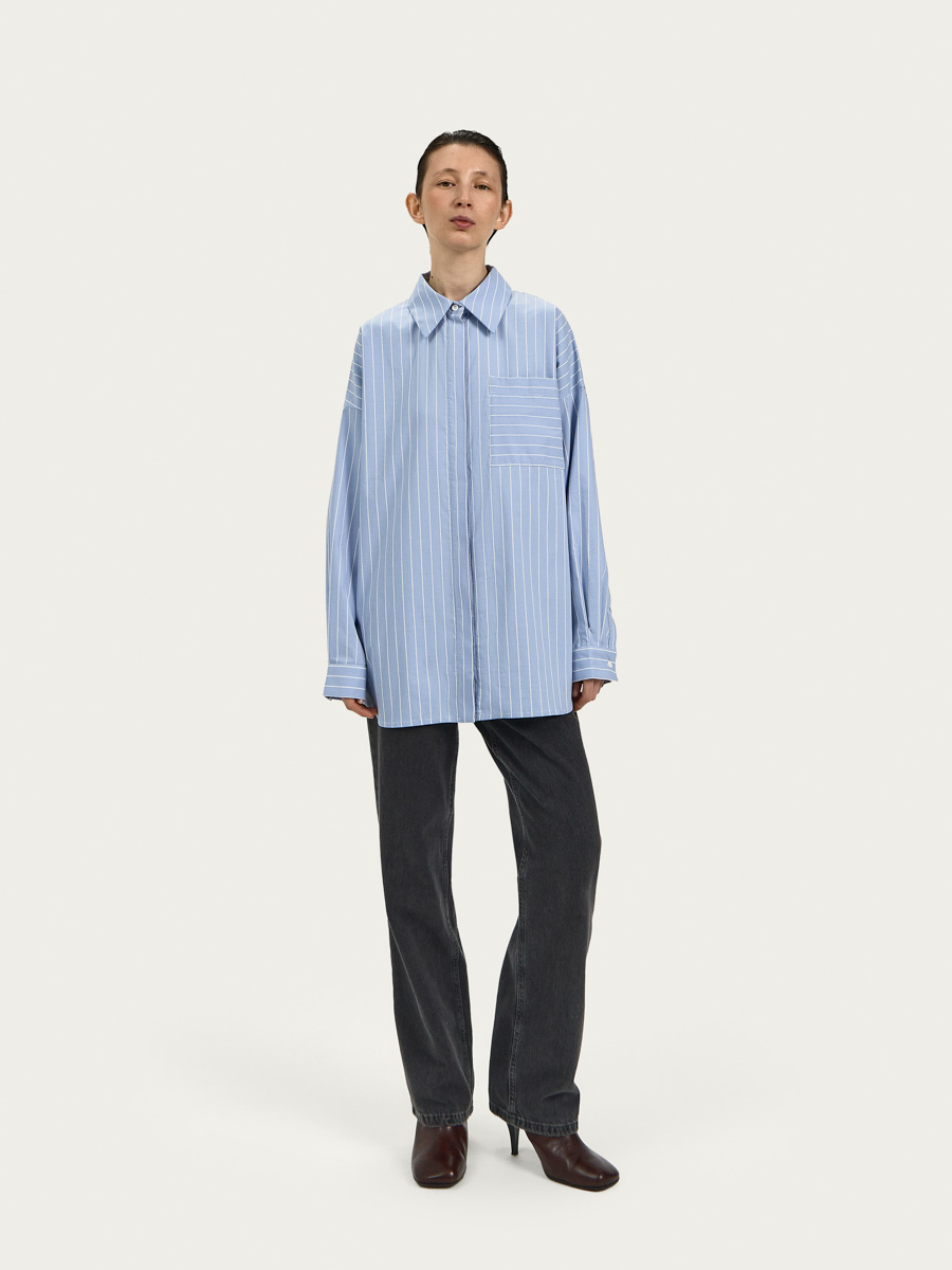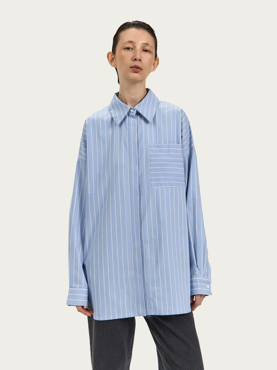 Рубашка умеренного объема со спущенной линией плеча, рубашечным воротником и застежкой на петли и пуговицы. Рукав со складками, обработанным планкой разрезом, на притачной манжете с застежкой на пуговицу.