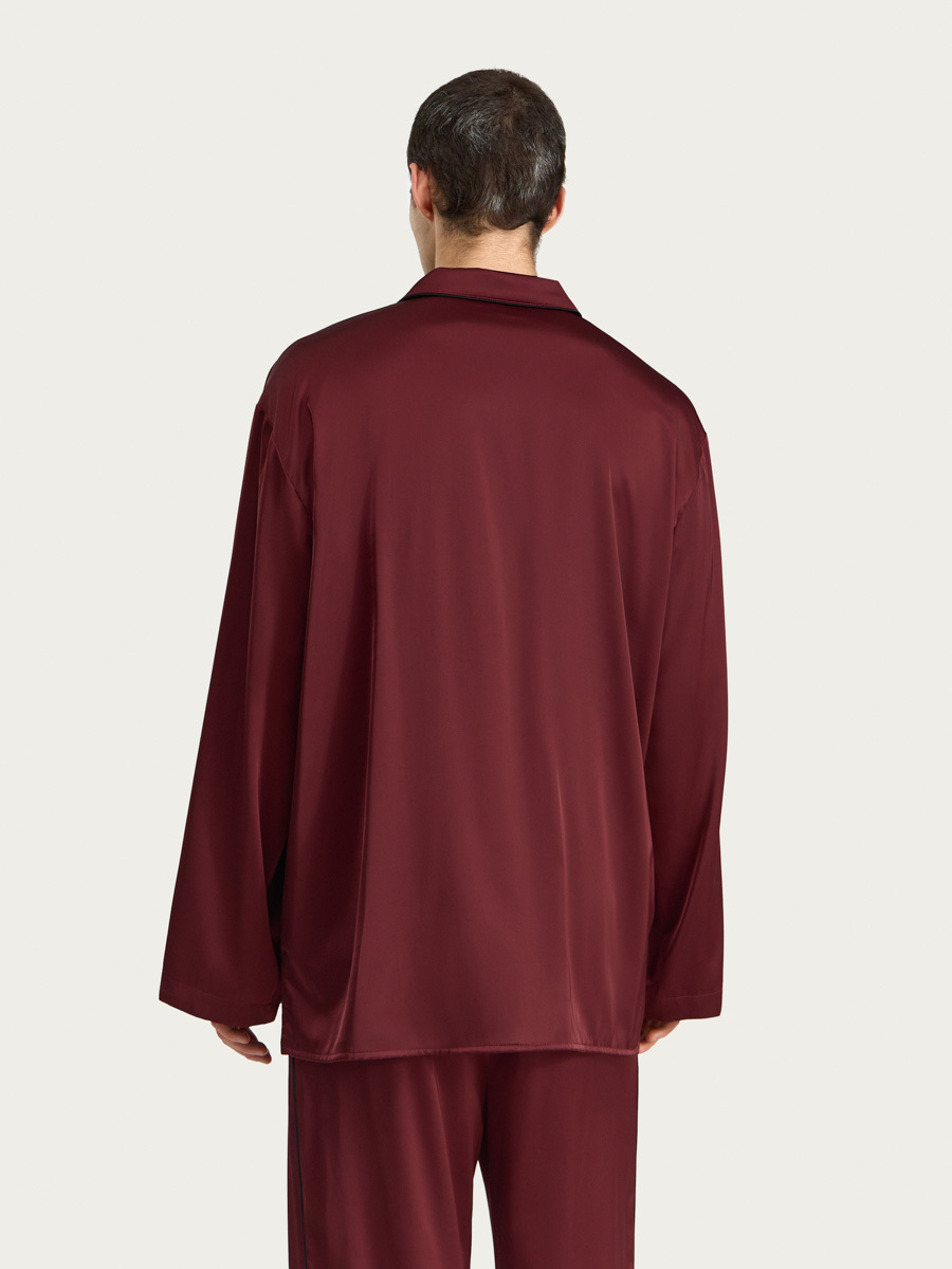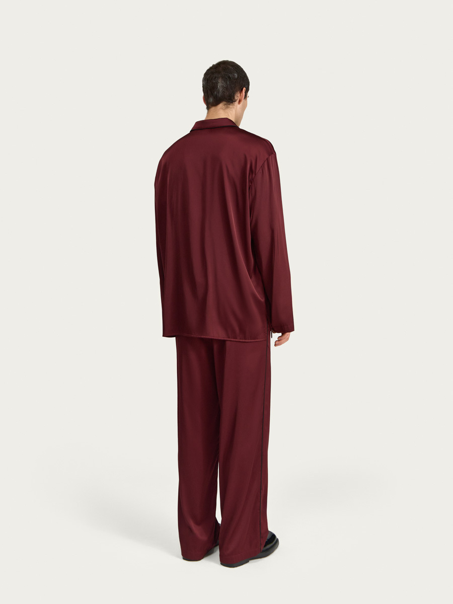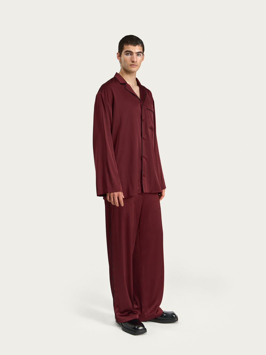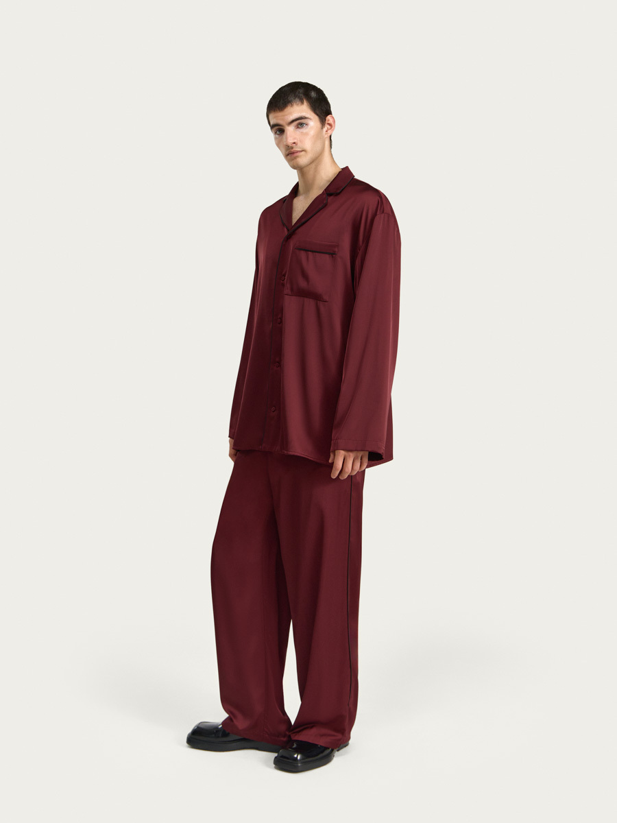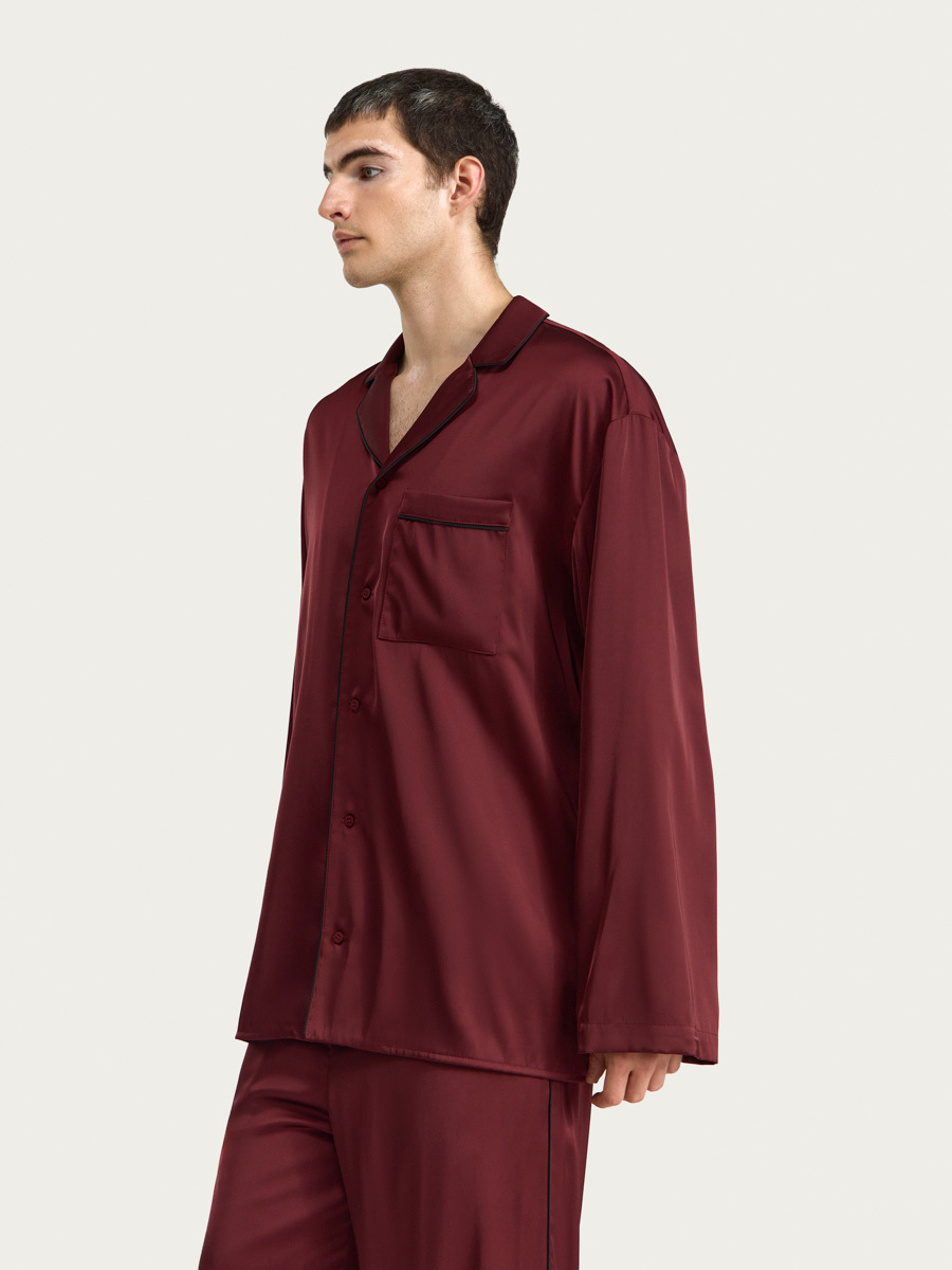 Мужская пижамная рубашка Лестер выполнена из атласной ткани. Рубашка имеет спущенную линию плеча, широкий рукав с манжетой по низу, накладной карман, застежку на пуговицы и отложной воротник с лацканами. Воротник, борт и карман рубашки обработаны с использованием контрастного канта. Рубашка Лестер составляет пижамный комплект с брюками Лестер.