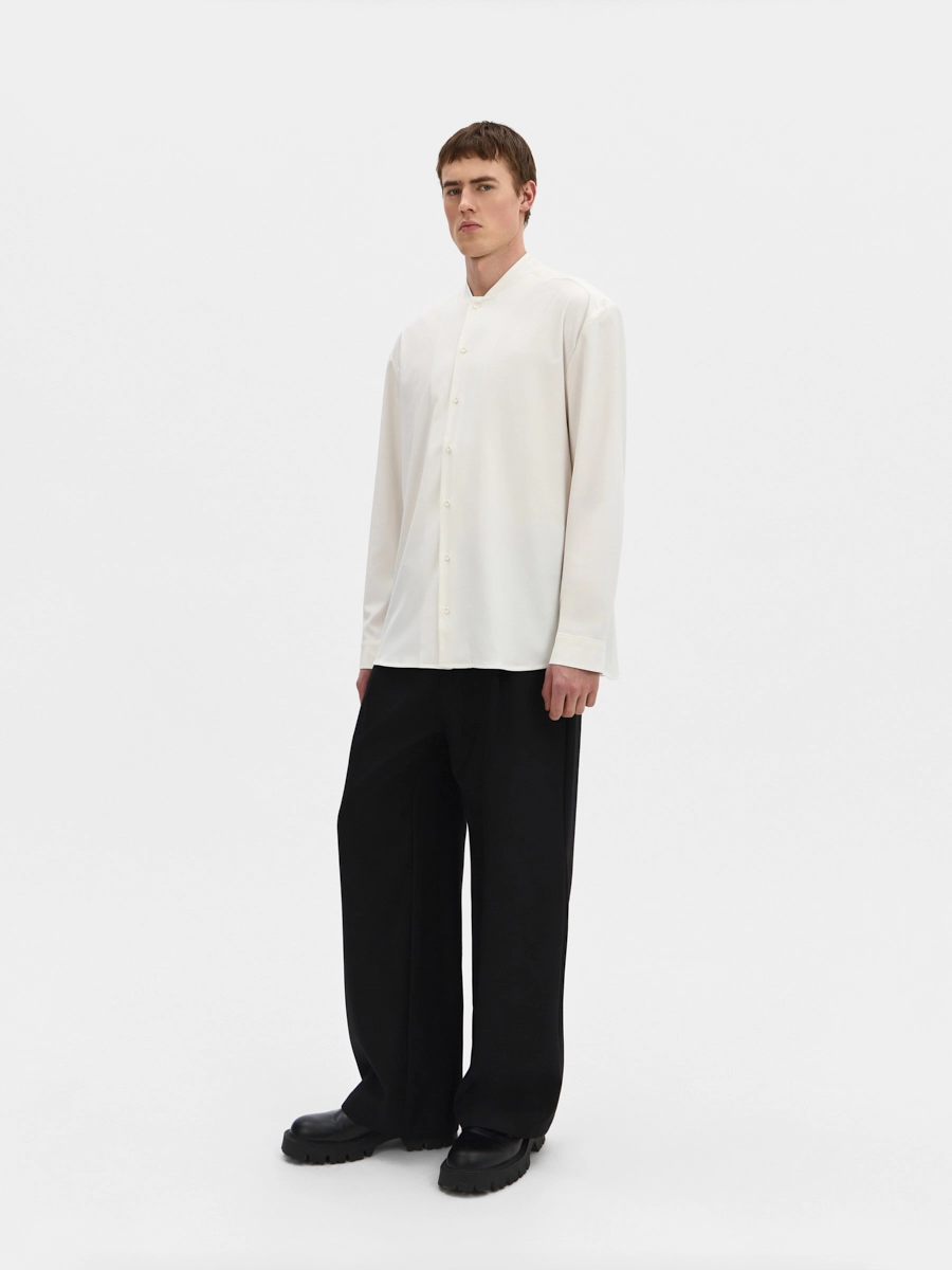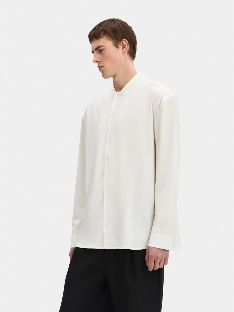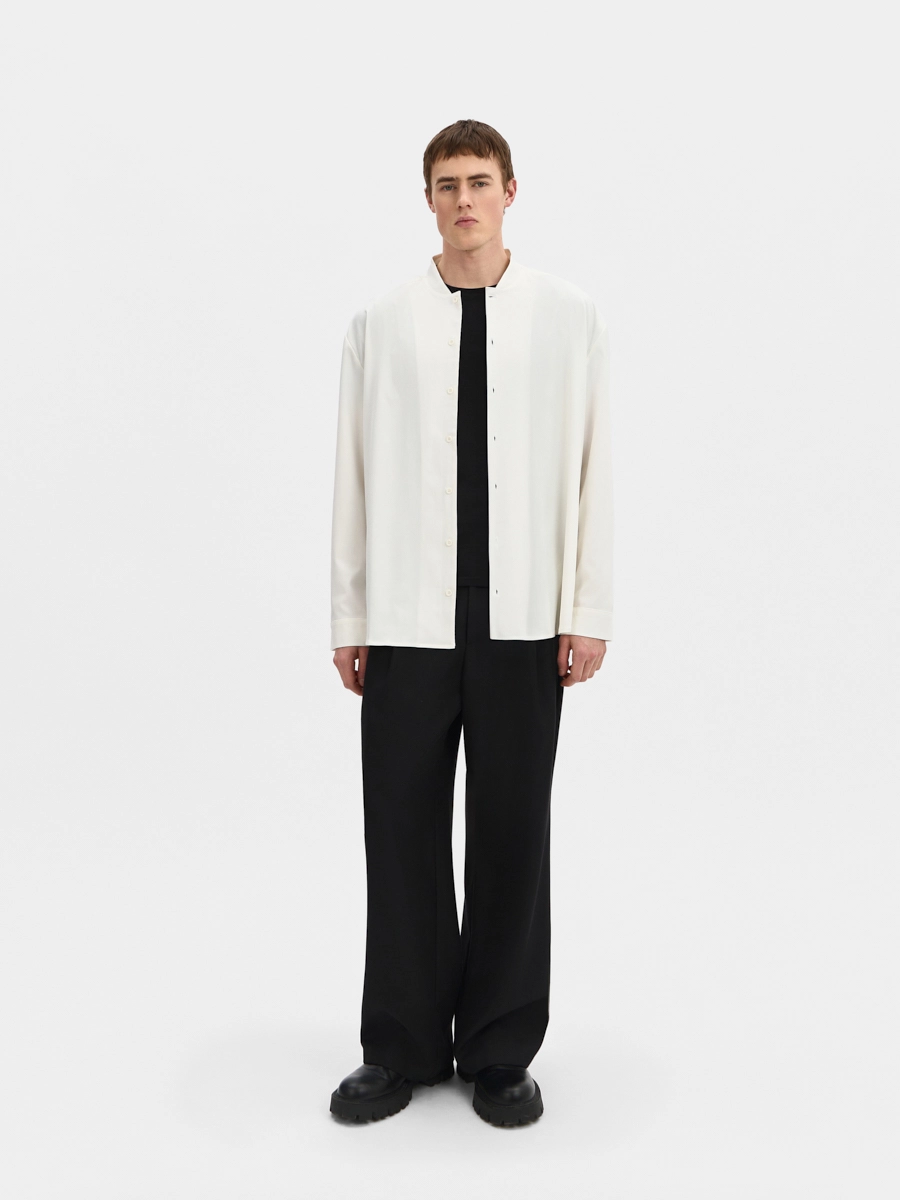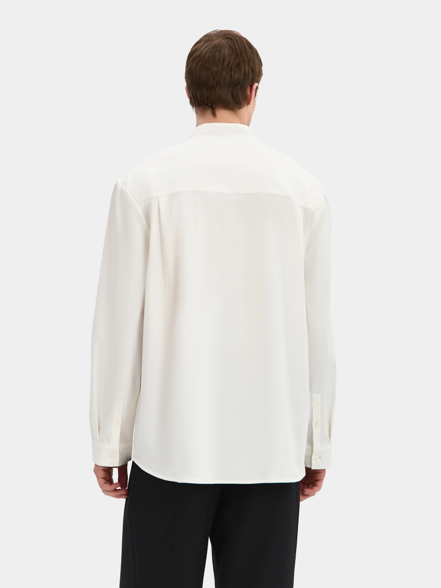 Мужская рубашка Лиам выполнена из хлопковой ткани. Рубашка имеет прямой силуэт, воротник-стойку, длинные рукава, кокетку и складки на спинке. Плечевой шов рубашки переведен вперед. Застёжка на пуговицы. Рукава на манжетах с застёжкой на пуговицы. Линия низа фигурная. Рубашка Лиам дополнит как повседневный, так и вечерний образ.