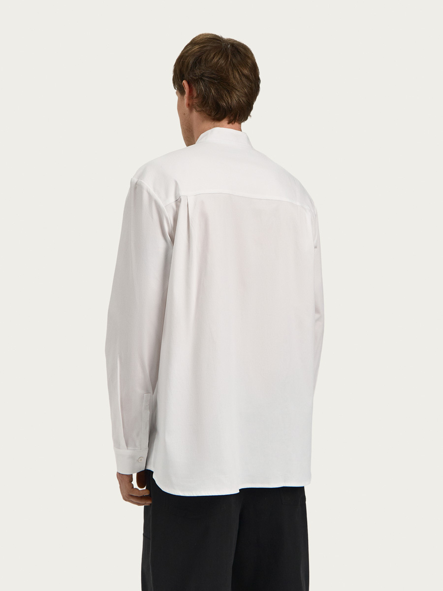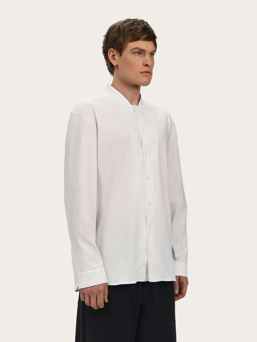 Рубашка имеет прямой силуэт, воротник-стойку, длинные рукава, кокетку и складки на спинке. Плечевой шов рубашки переведен вперед. Застежка на пуговицы. Рукава на манжетах с застежкой на пуговицы. Линия низа фигурная.