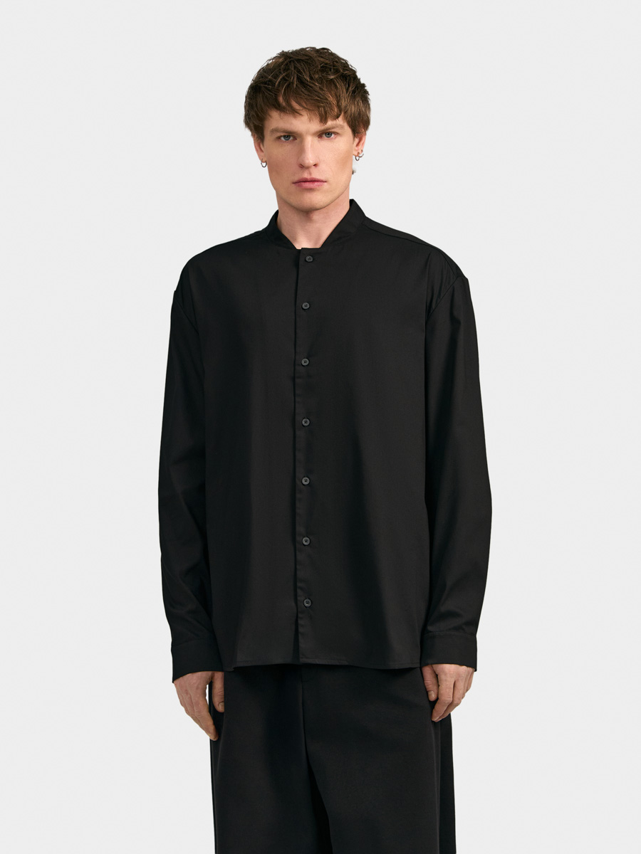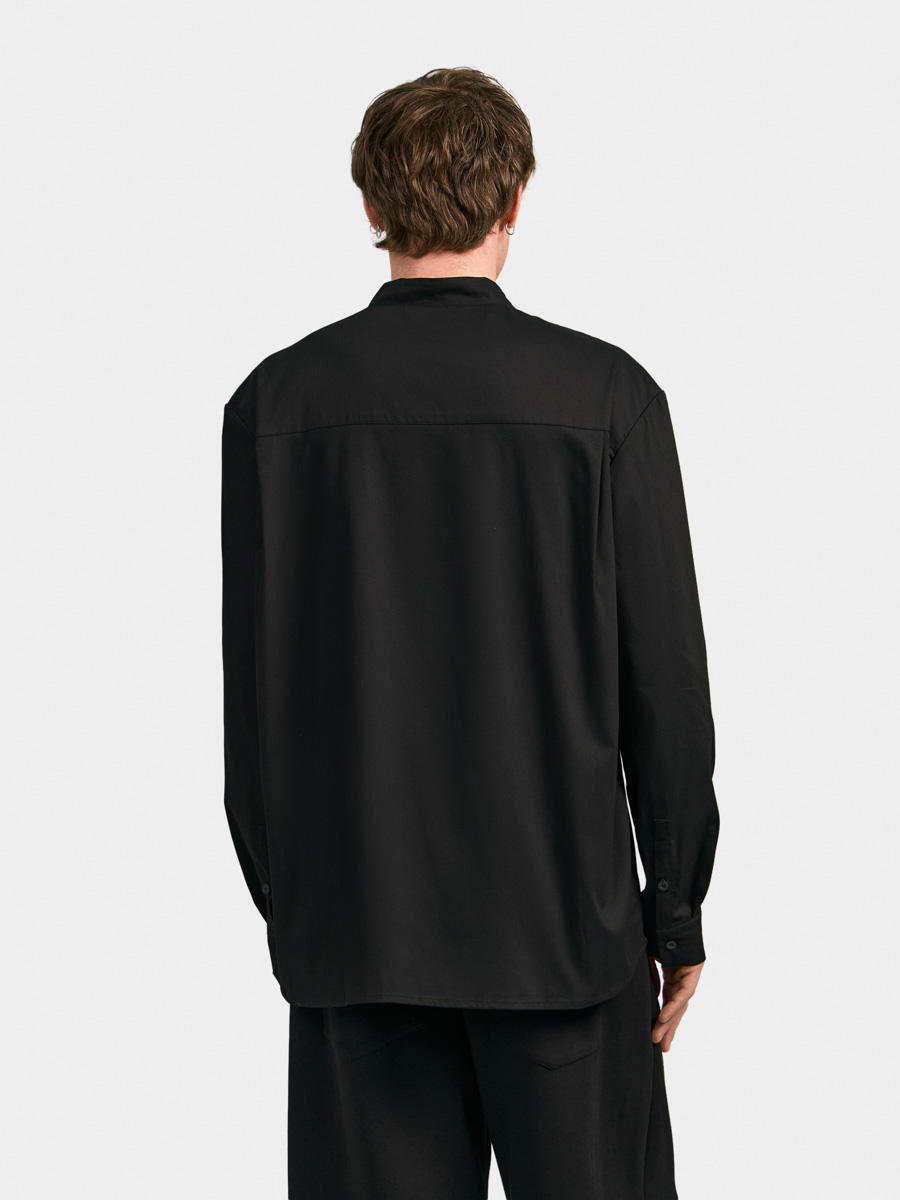 Рубашка имеет прямой силуэт, воротник-стойку, длинные рукава, кокетку и складки на спинке. Плечевой шов рубашки переведен вперед. Застежка на пуговицы. Рукава на манжетах с застежкой на пуговицы. Линия низа фигурная.