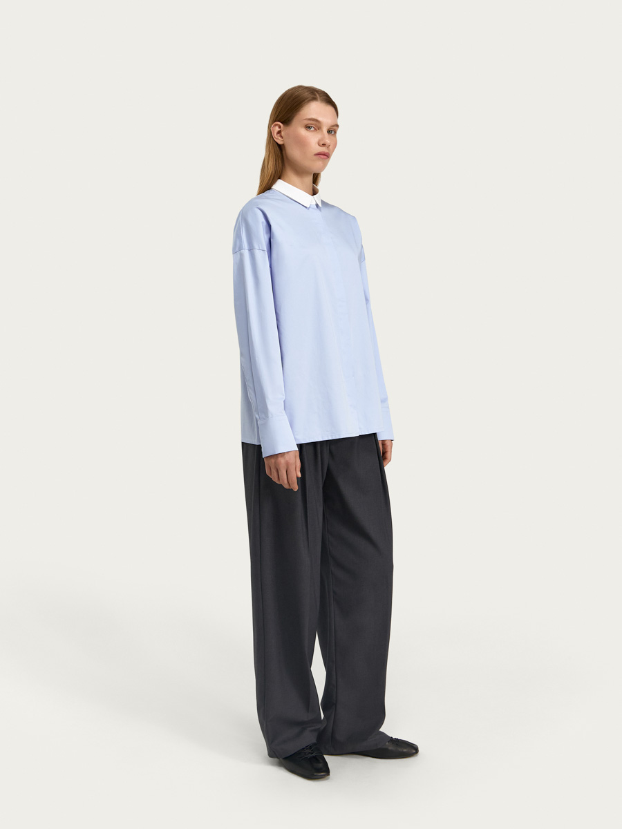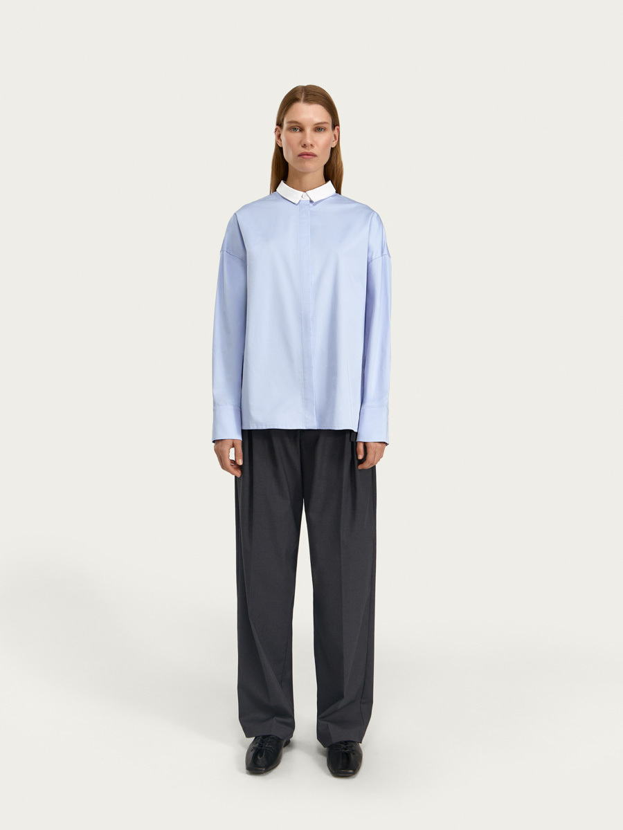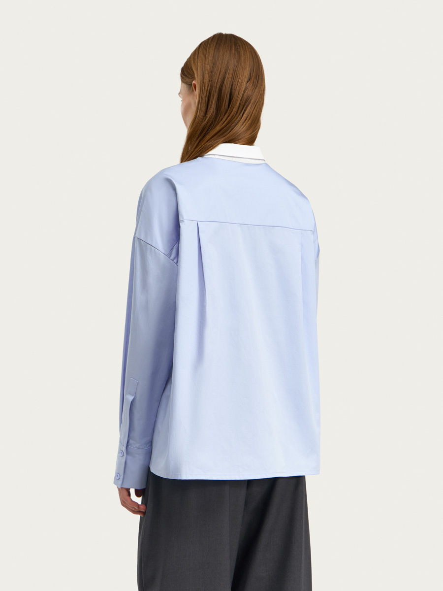 Рубашка Марго выполнена из плотного хлопка сатинового переплетения. Рубашка в объеме оверсайз имеет прямой силуэт, спущенную линию плеча и супатную застежку. Рукава со складкой и планкой, на широкой притачной манжете с застежкой на пуговицы. Небольшой отложной узкий воротник со стойкой. Спинка с кокеткой и складками.