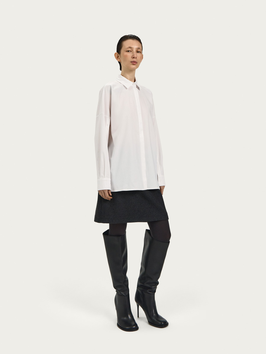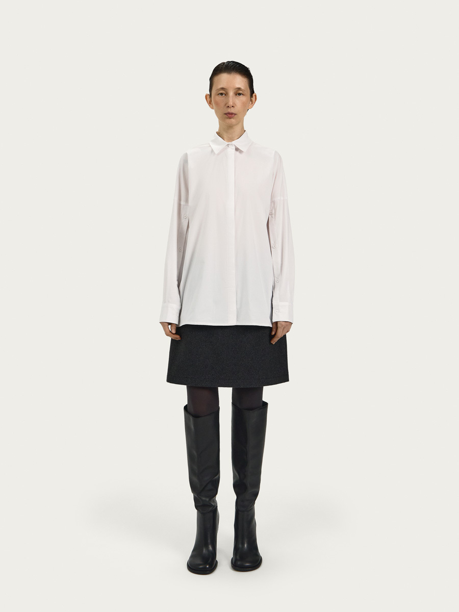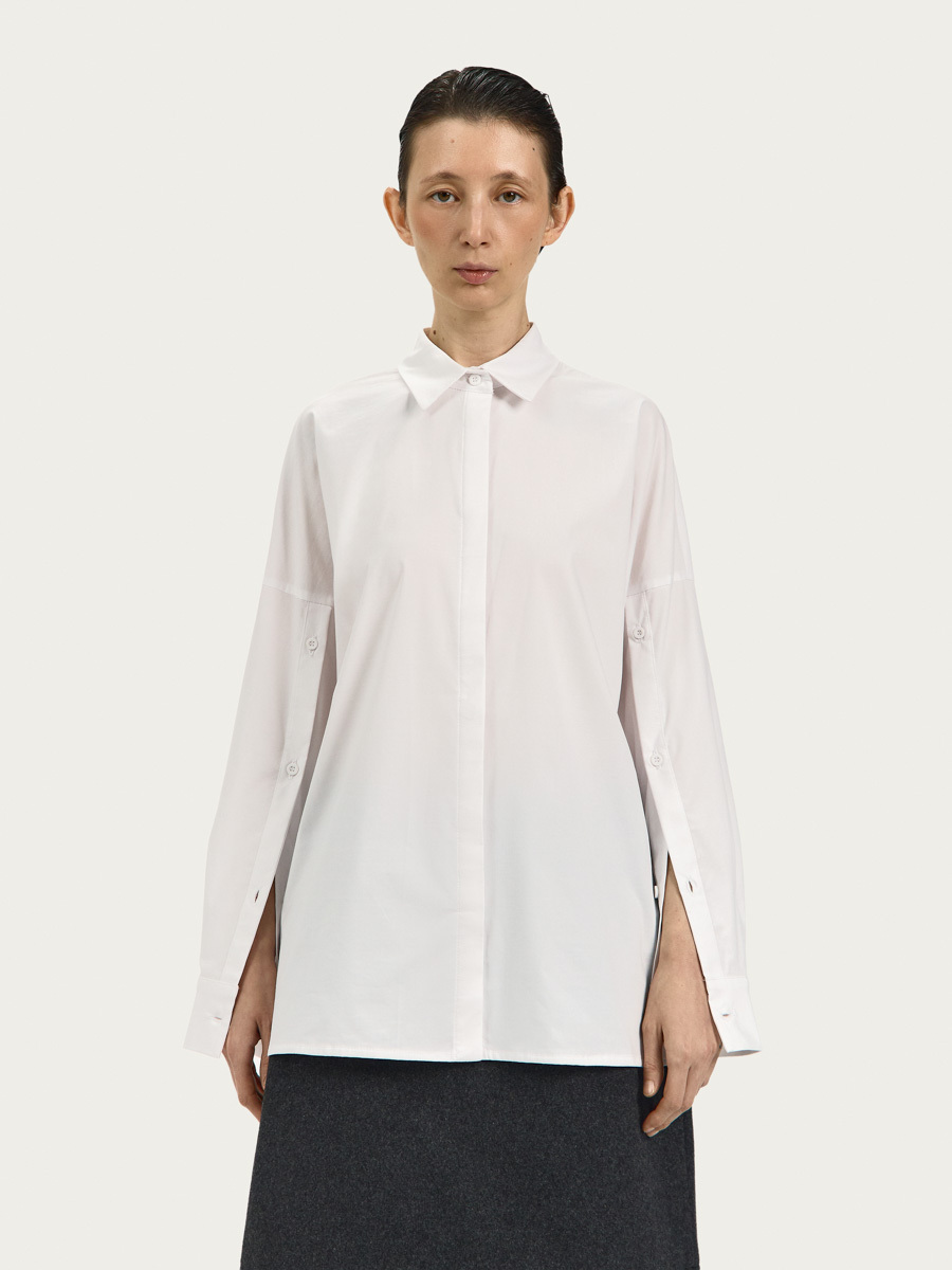Рубашка Мика прямого силуэта имеет спущенную линию плеча, длинные рукава, рубашечный воротник, супатную застёжку на пуговицы. По рукавам спереди - планки с застёжкой на пуговицы. Низ рукавов на манжете. Рубашка Мика подойдёт для Вашего повседневного и офисного гардероба.