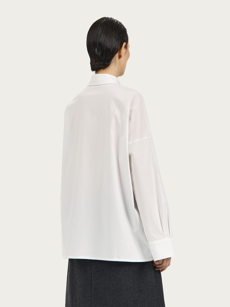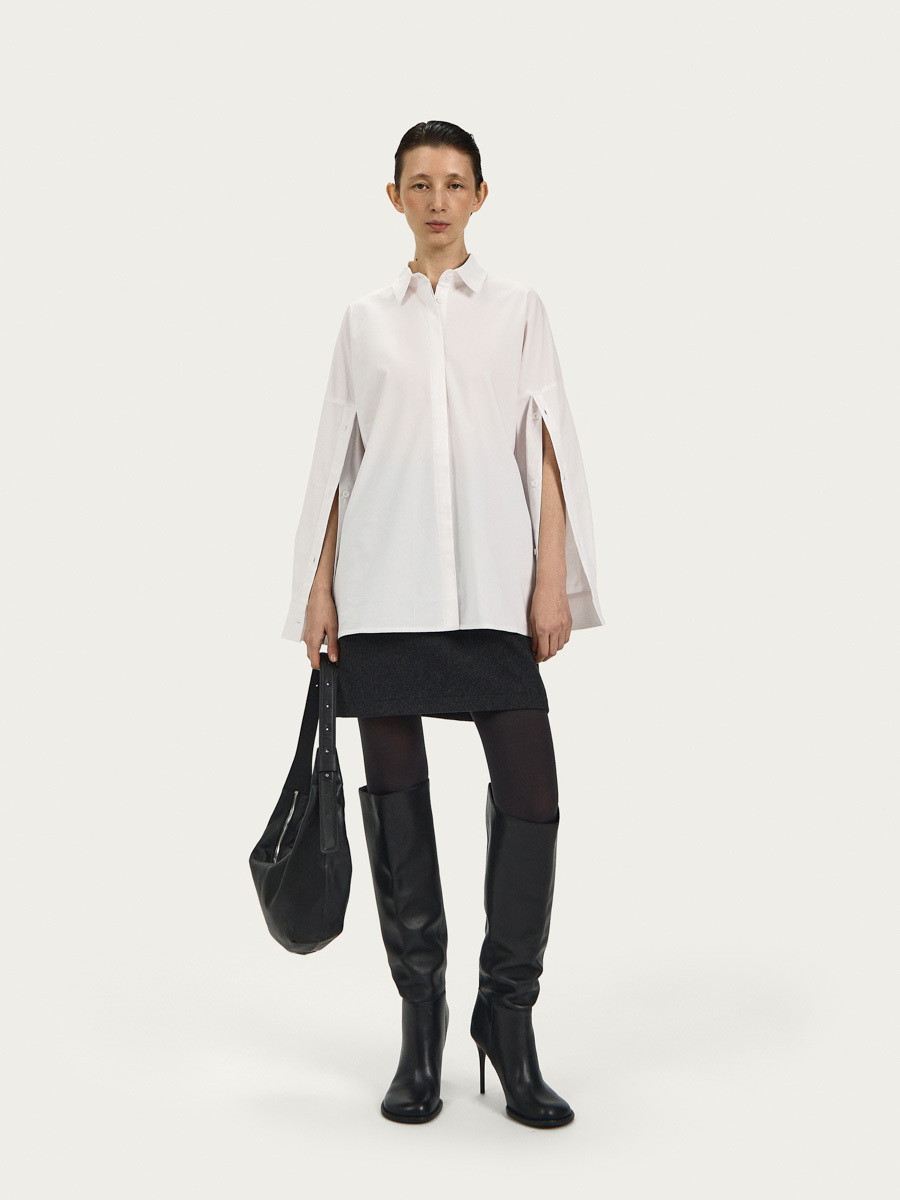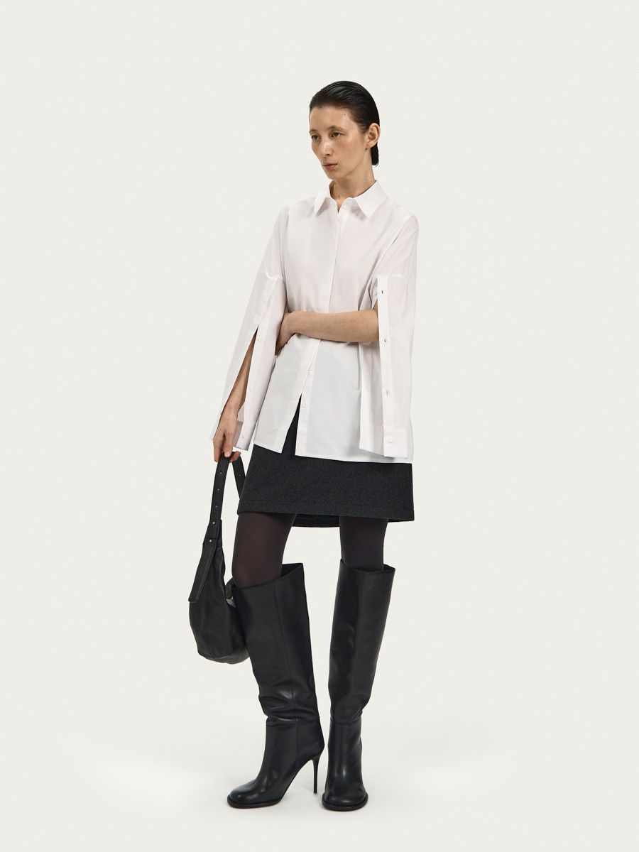 Рубашка Мика прямого силуэта имеет спущенную линию плеча, длинные рукава, рубашечный воротник, супатную застёжку на пуговицы. По рукавам спереди - планки с застёжкой на пуговицы. Низ рукавов на манжете. Рубашка Мика подойдёт для Вашего повседневного и офисного гардероба.