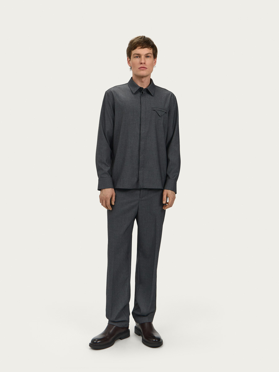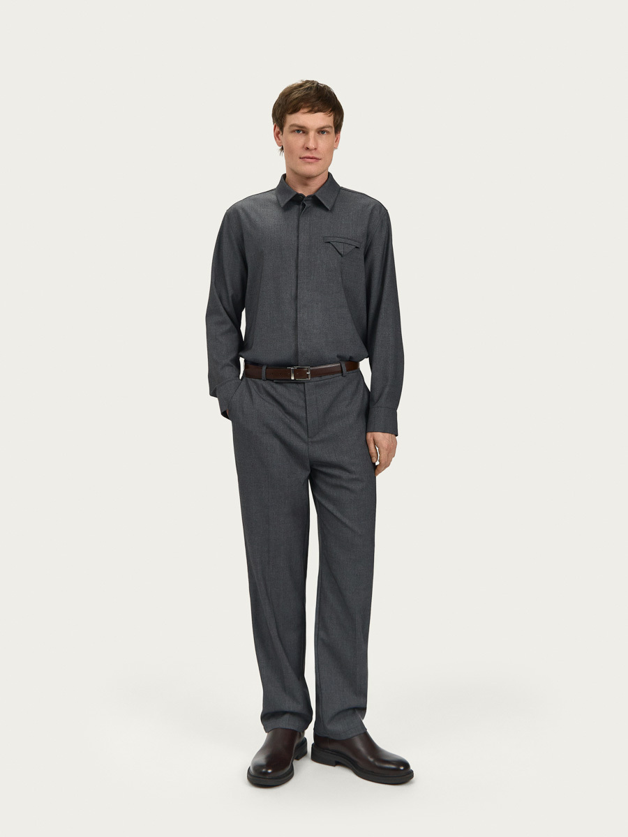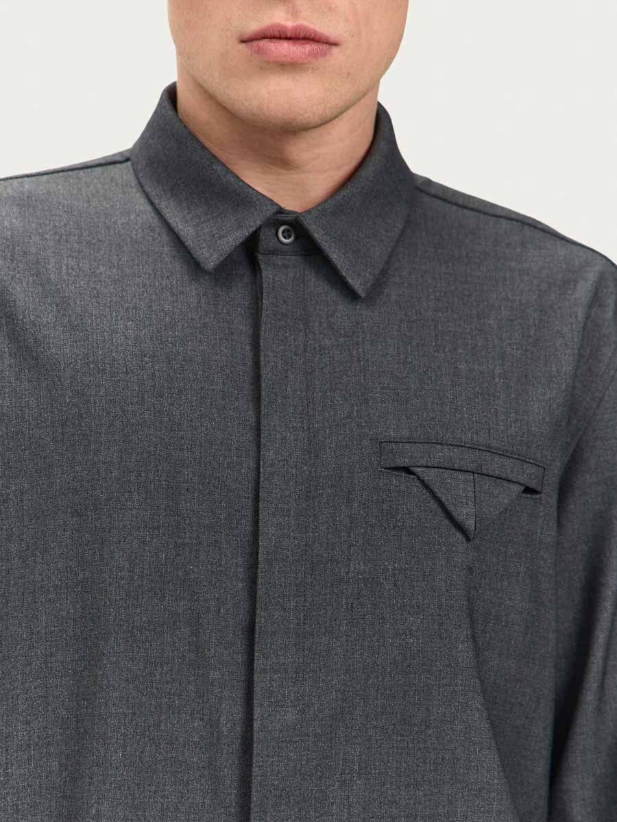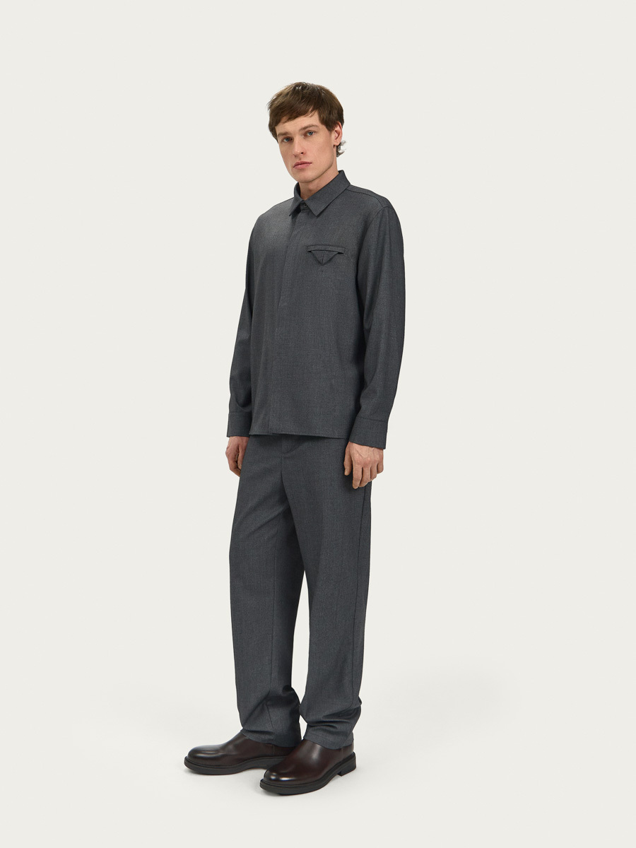 Мужская рубашка Питер выполнена из мягкой костюмной ткани. Рубашка имеет отложной воротник и супатную застежку на петли и пуговицы. Спинка с кокеткой. Рукава со складкой, на притачной манжете с застежкой на петли и пуговицы. На левой полочке обработан прорезной карман с листочкой и застежкой на пуговицу и декоративную петлю, оформленную треугольником.