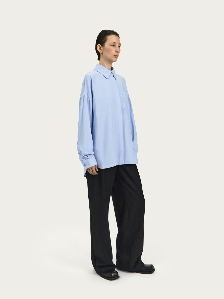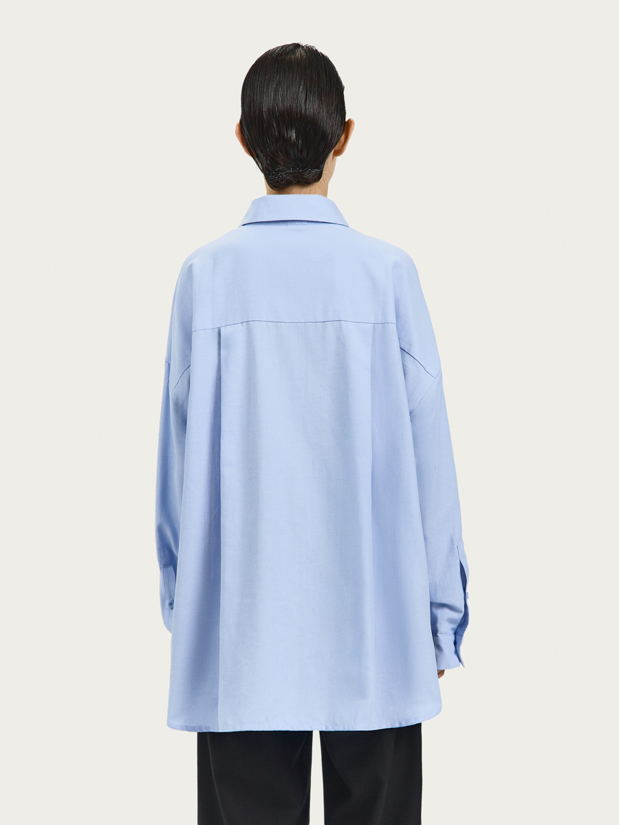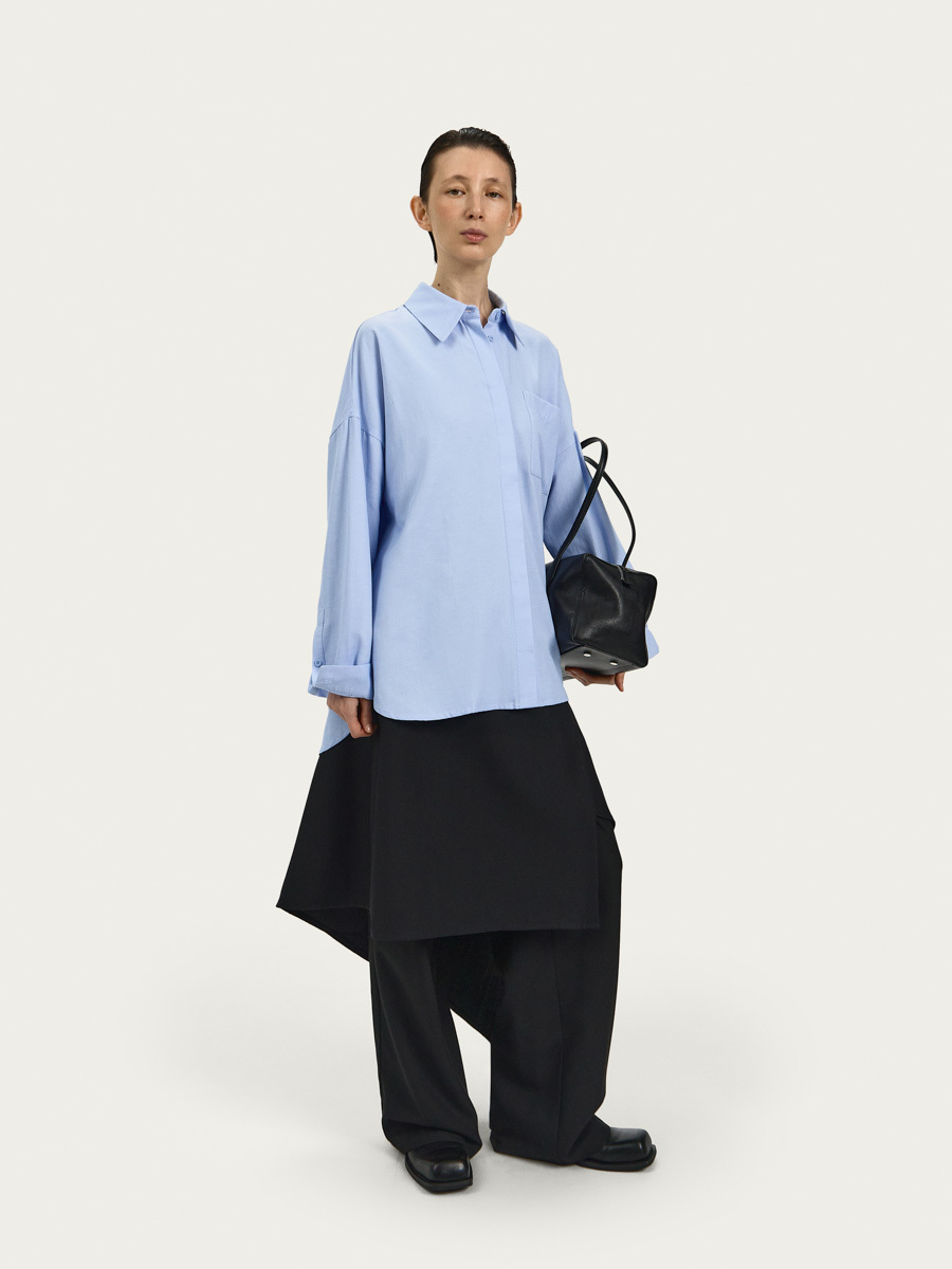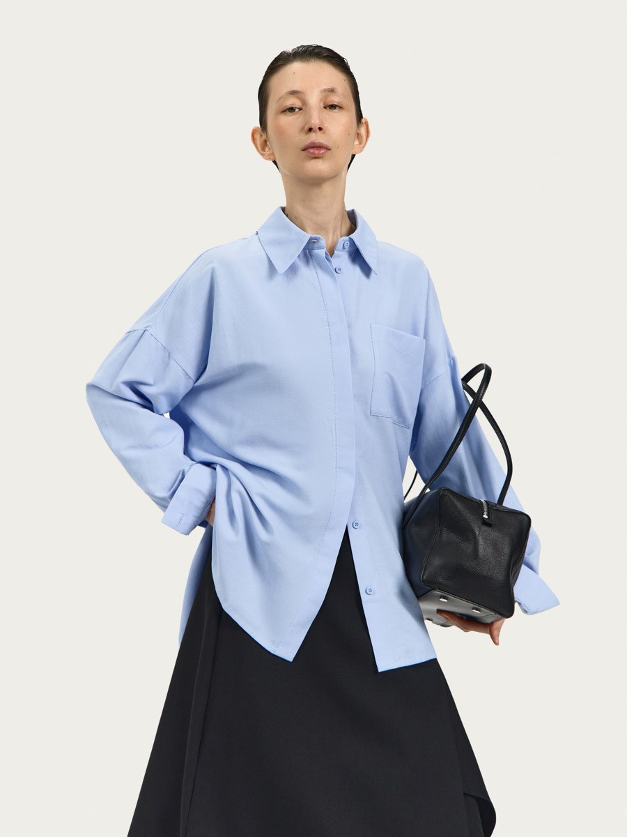 Рубашка Рэй оверсайз силуэта имеет классический воротник, застёжку на пуговицы и один большой нагрудный карман. Объёмный силуэт, линия низа изделия, кокетка со складками на спине и дизайн манжет придают рубашке нотки мужского стиля