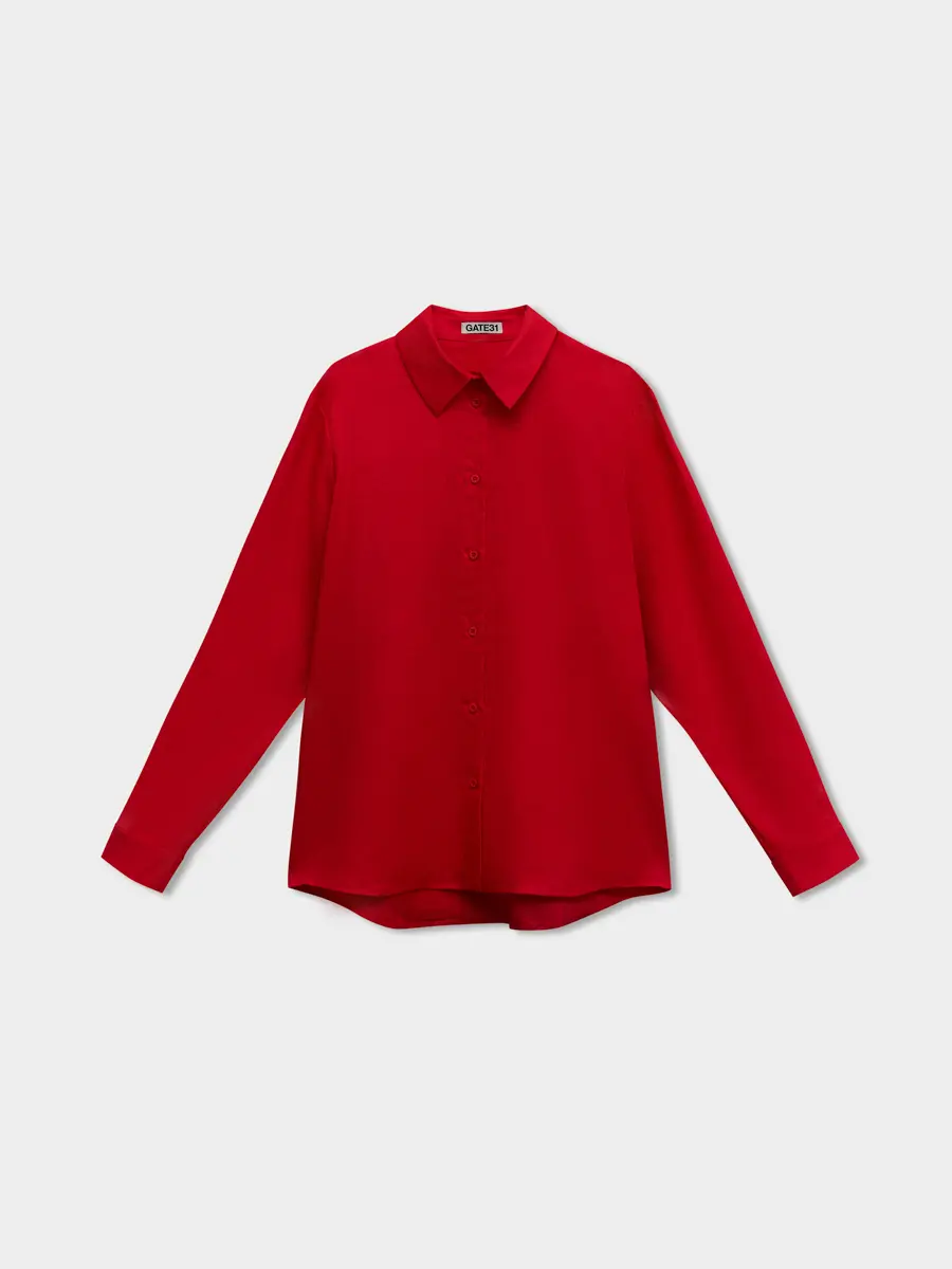 Рубашка базового объема прямого силуэта с застёжкой на пуговицы спереди, рубашечный воротник имеет классическую форму, длинный рукав оформлен внизу манжетой с застёжкой на пуговицу, разрезом с планкой и одной складкой, спинка с отрезной кокеткой, линия низа фигурная.
