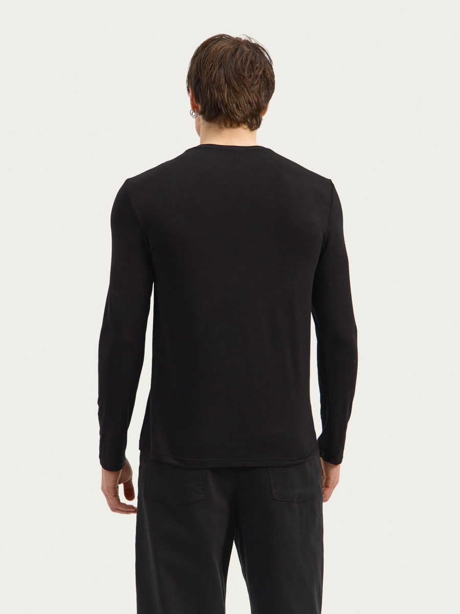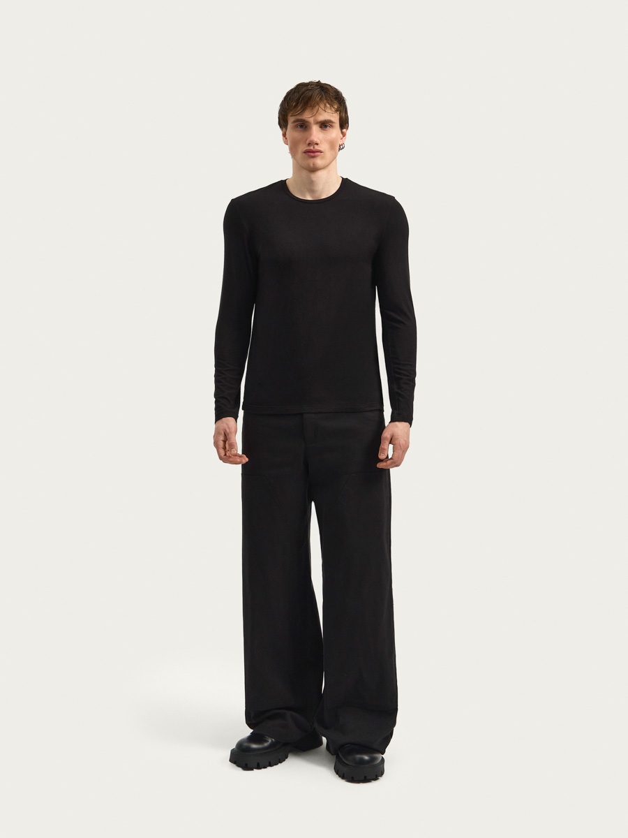 Сет Киран выполнен из тонкого вискозного трикотажа и состоит из лонгслива, футболки и майки. Лонгслив полуприлегающего силуэта, футболка и майка прямого силуэта. Каждый новый слой короче предыдущего. Горловины обработаны тонкими обтачками.