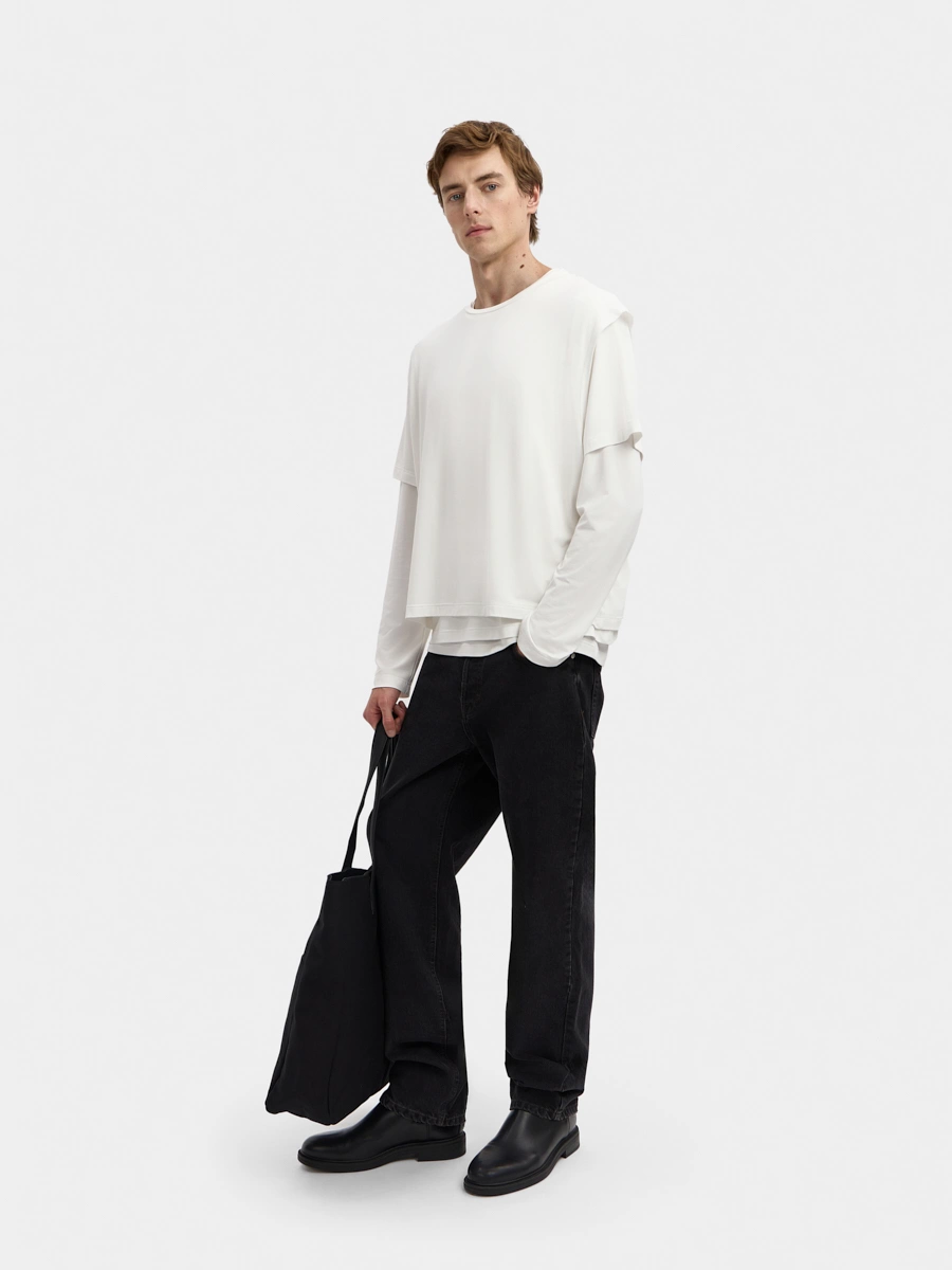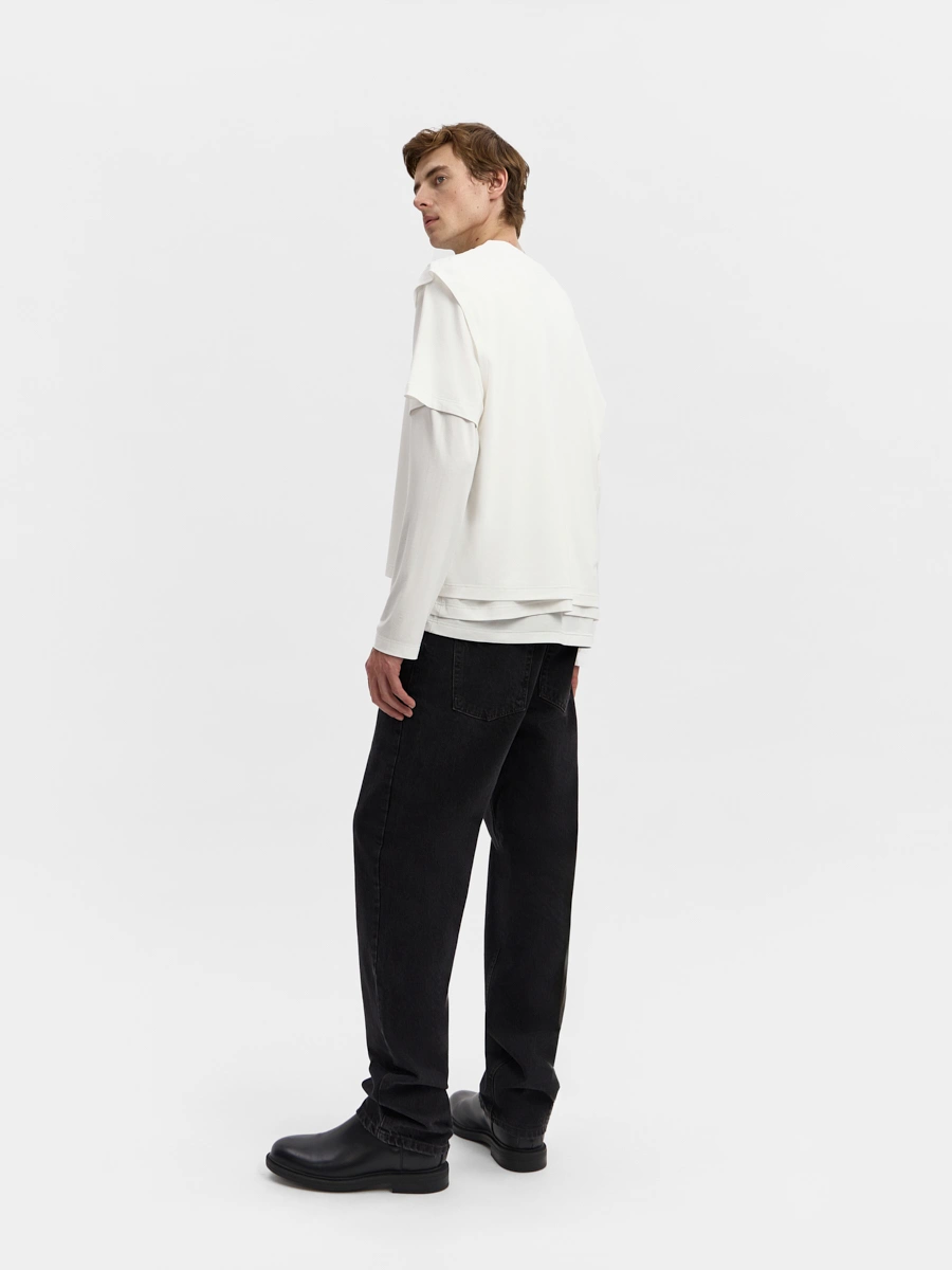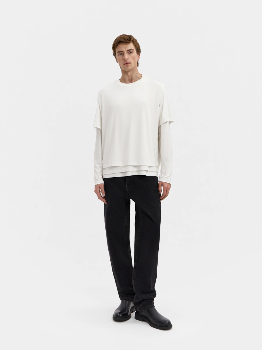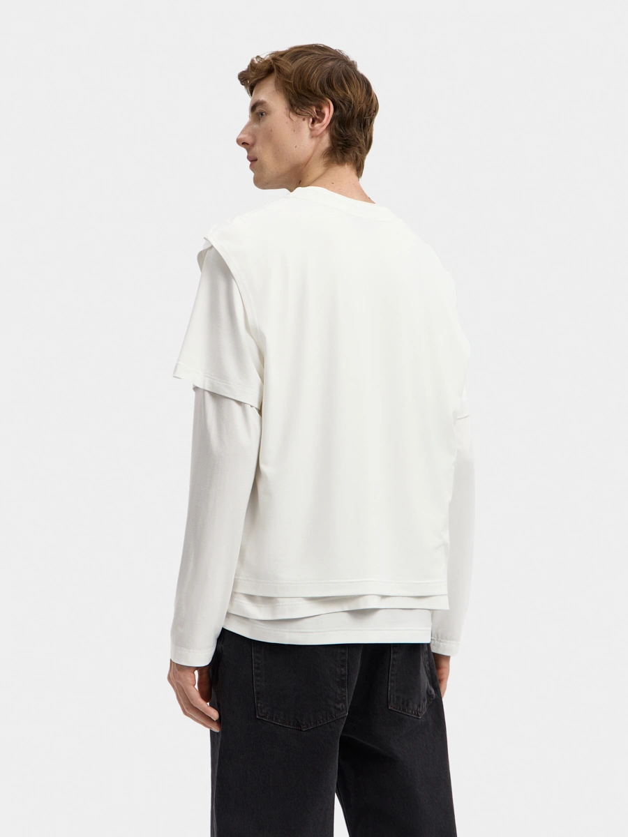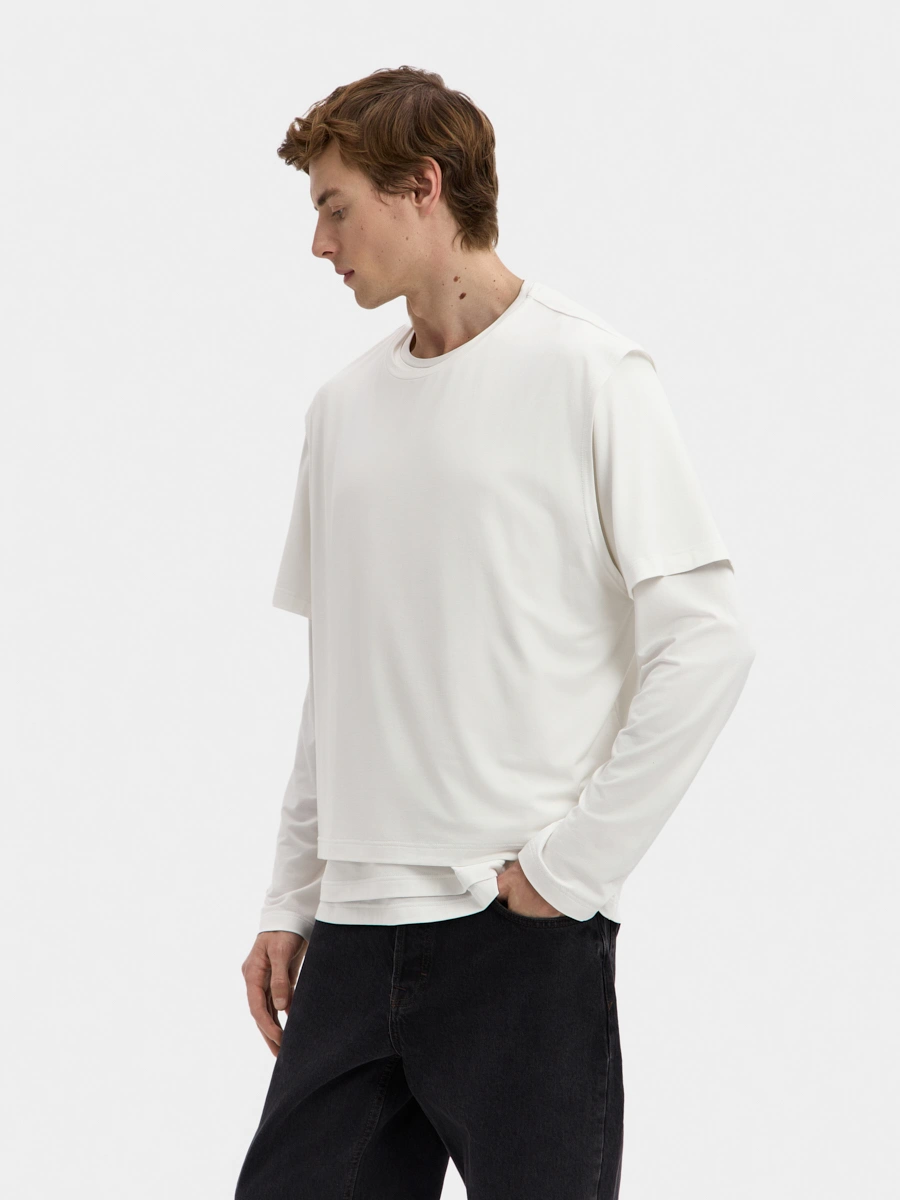 Сет Киран выполнен из тонкого вискозного трикотажа и состоит из лонгслива, футболки и майки. Лонгслив полуприлегающего силуэта, футболка и майка прямого силуэта. Каждый новый слой короче предыдущего. Горловины обработаны тонкими обтачками.