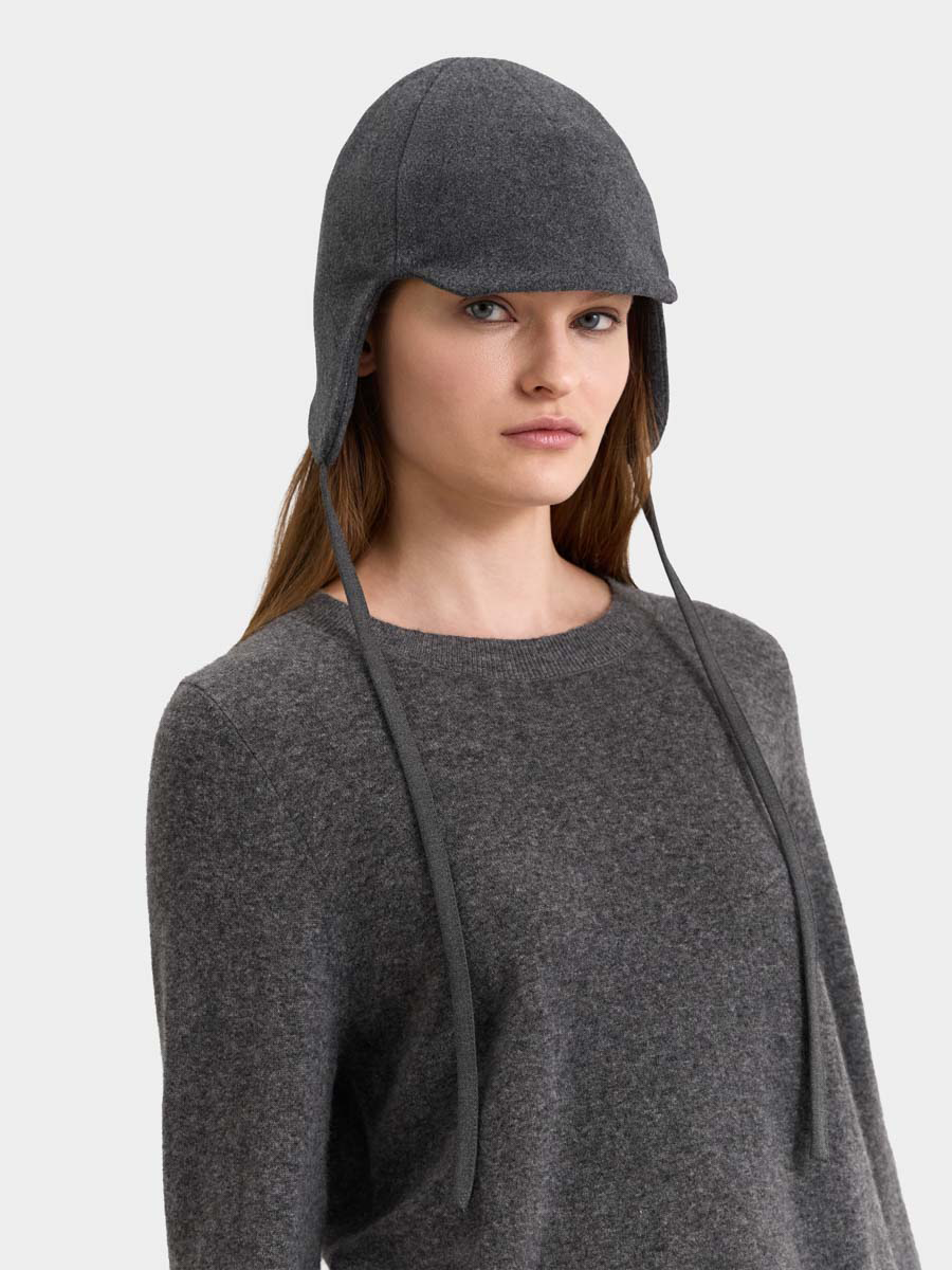 Шапка имеет цельнокроеный козырёк и ушки с завязками из ткани - компаньона.