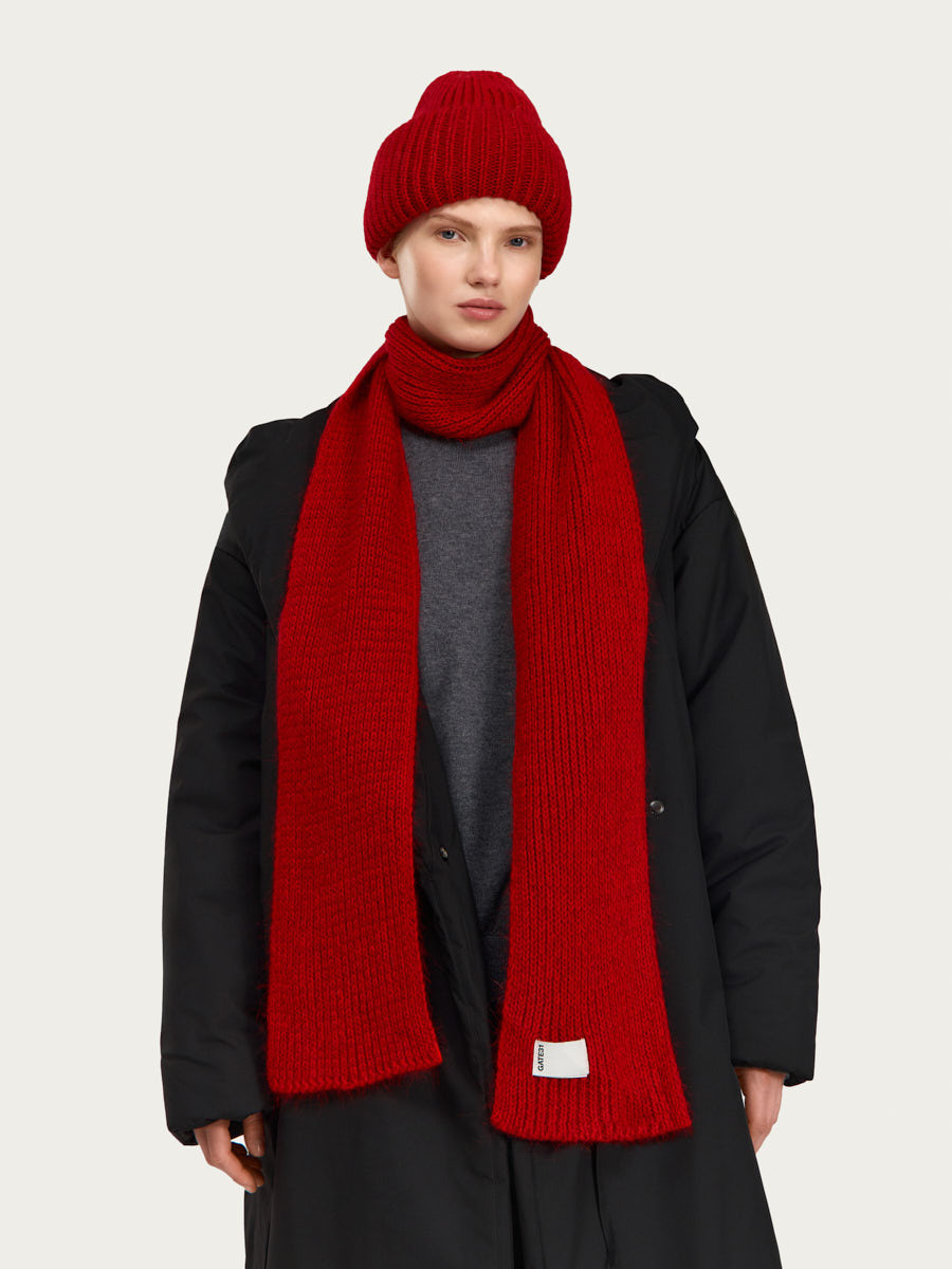 Объемная шапка с большим отворотом выполнена крупной эластичной вязкой “резинка”.