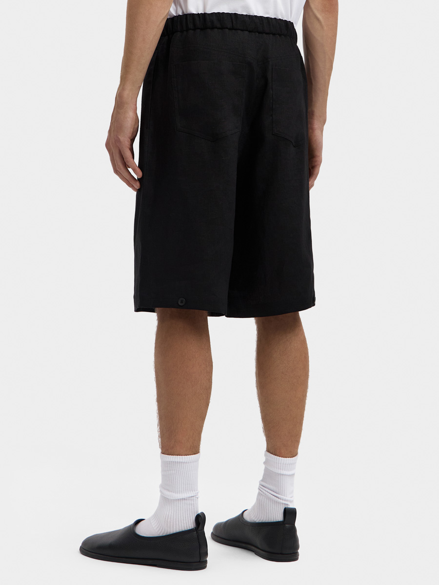 These relaxed straight-fit shorts feature an attached waistband with elastic and inner drawstrings, a mock fly, side seam pockets, a curved back yoke, and shaped patch pockets. The front panels have pleats. The leg width can be adjusted with side button tabs. The shorts are finished with decorative topstitching.