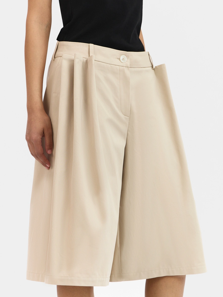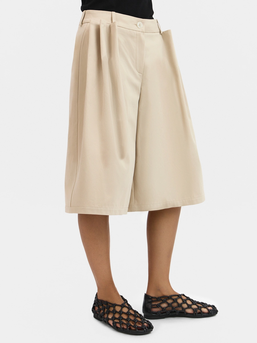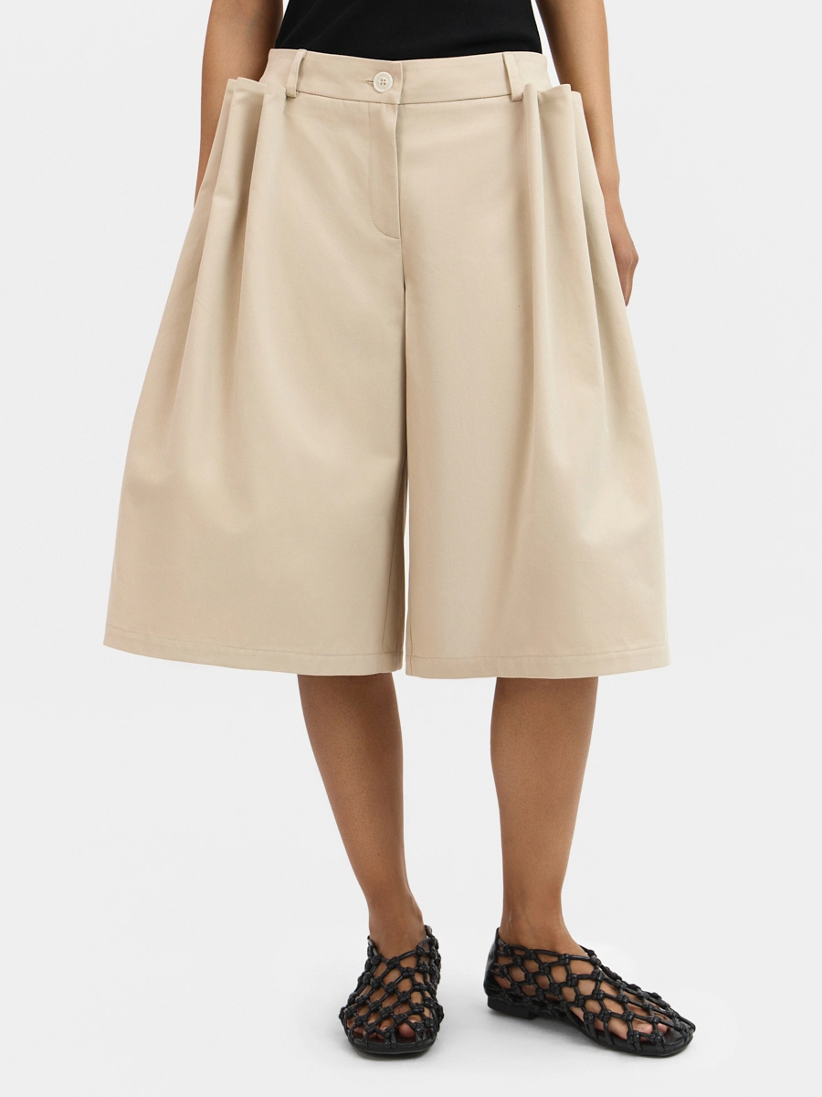 Шорты А-силуэта с низкой посадкой, пояс притачной со шлёвками и застёжкой на пуговицу, брючная молния в гульфике, карманы в боковых швах, задние половинки с вытачками, на передних половинках заложены объемные декоративные защипы.
