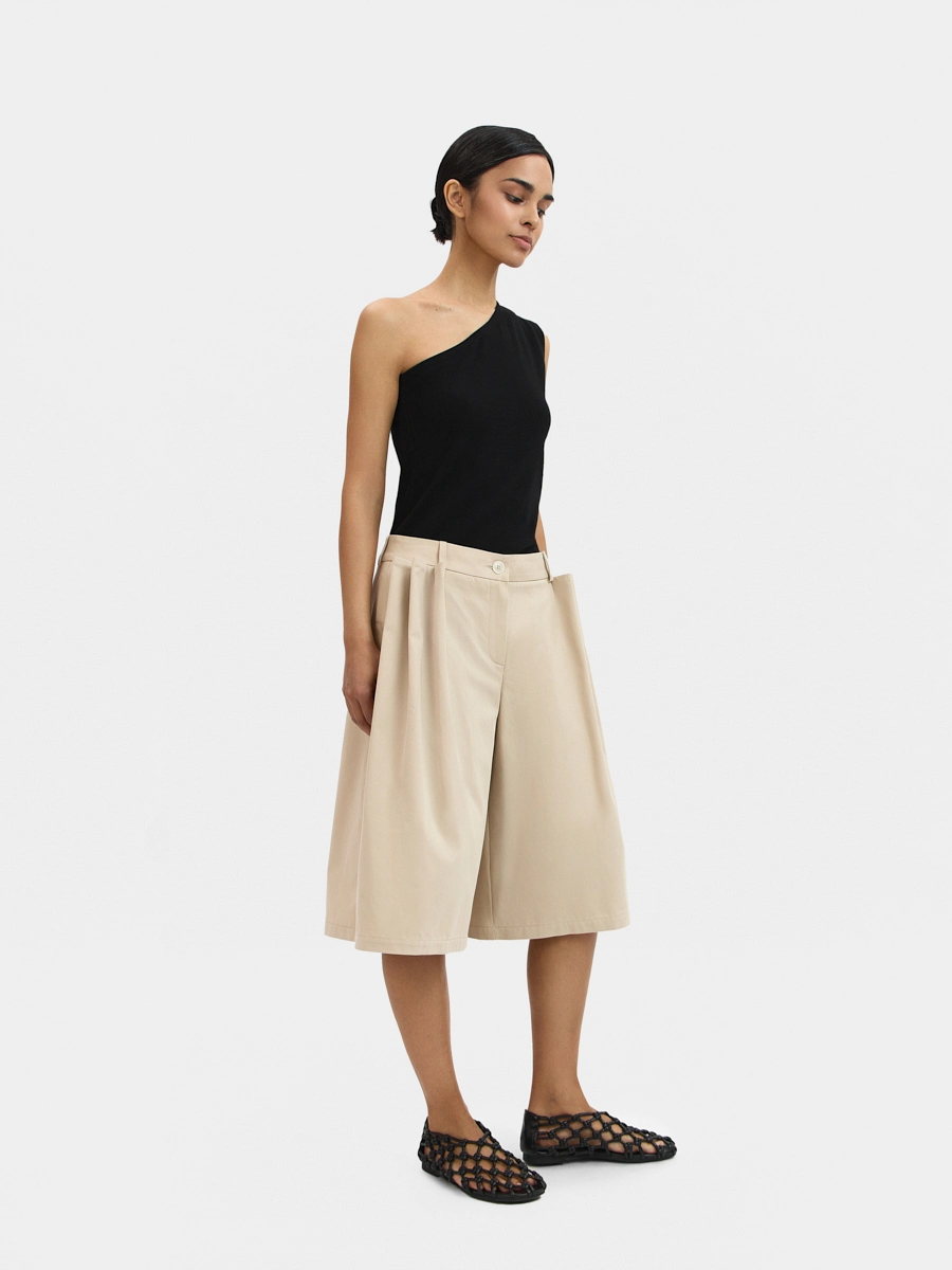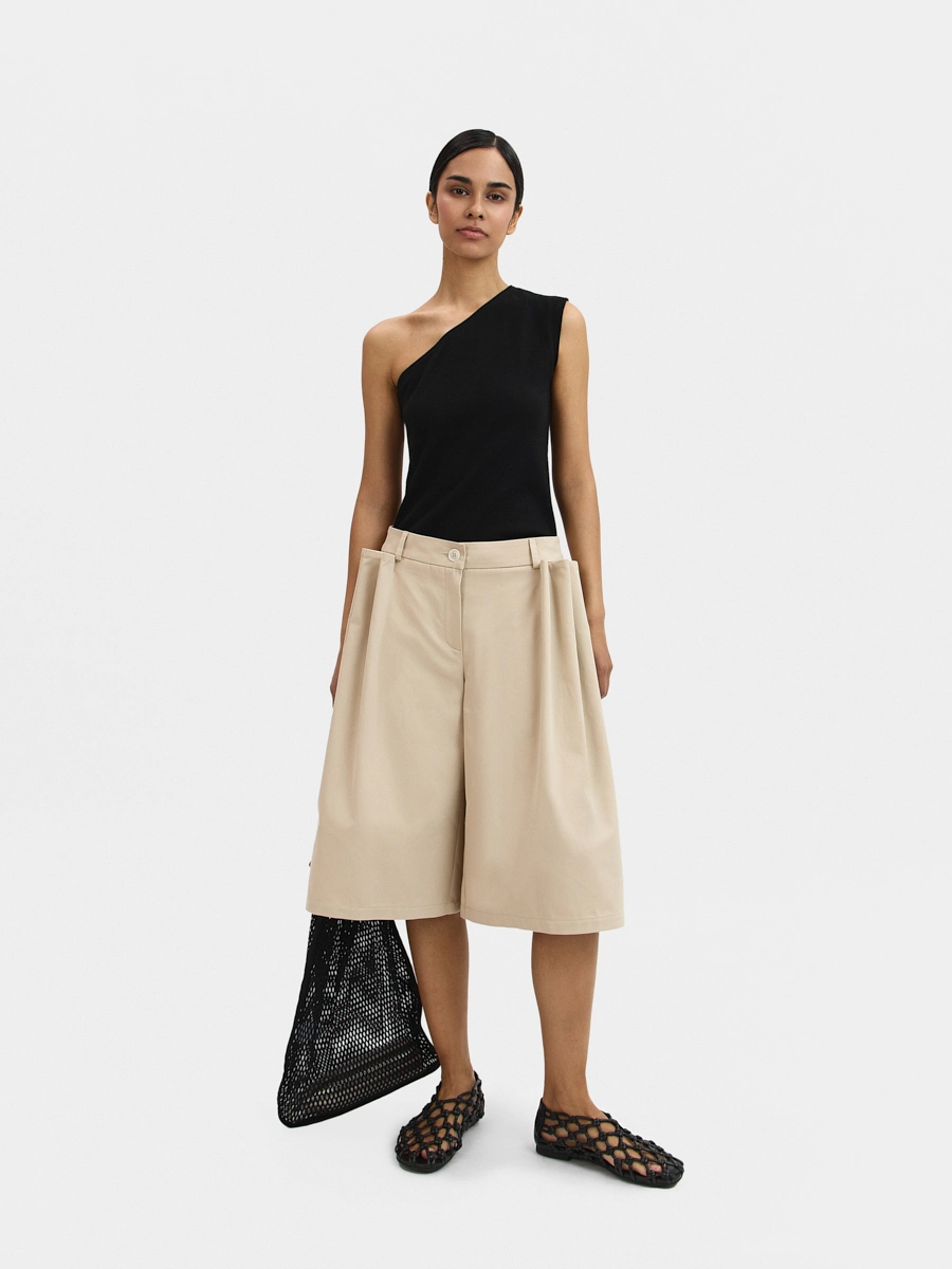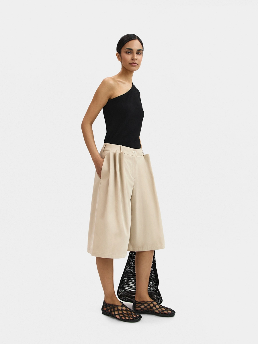Шорты А-силуэта с низкой посадкой, пояс притачной со шлёвками и застёжкой на пуговицу, брючная молния в гульфике, карманы в боковых швах, задние половинки с вытачками, на передних половинках заложены объемные декоративные защипы.