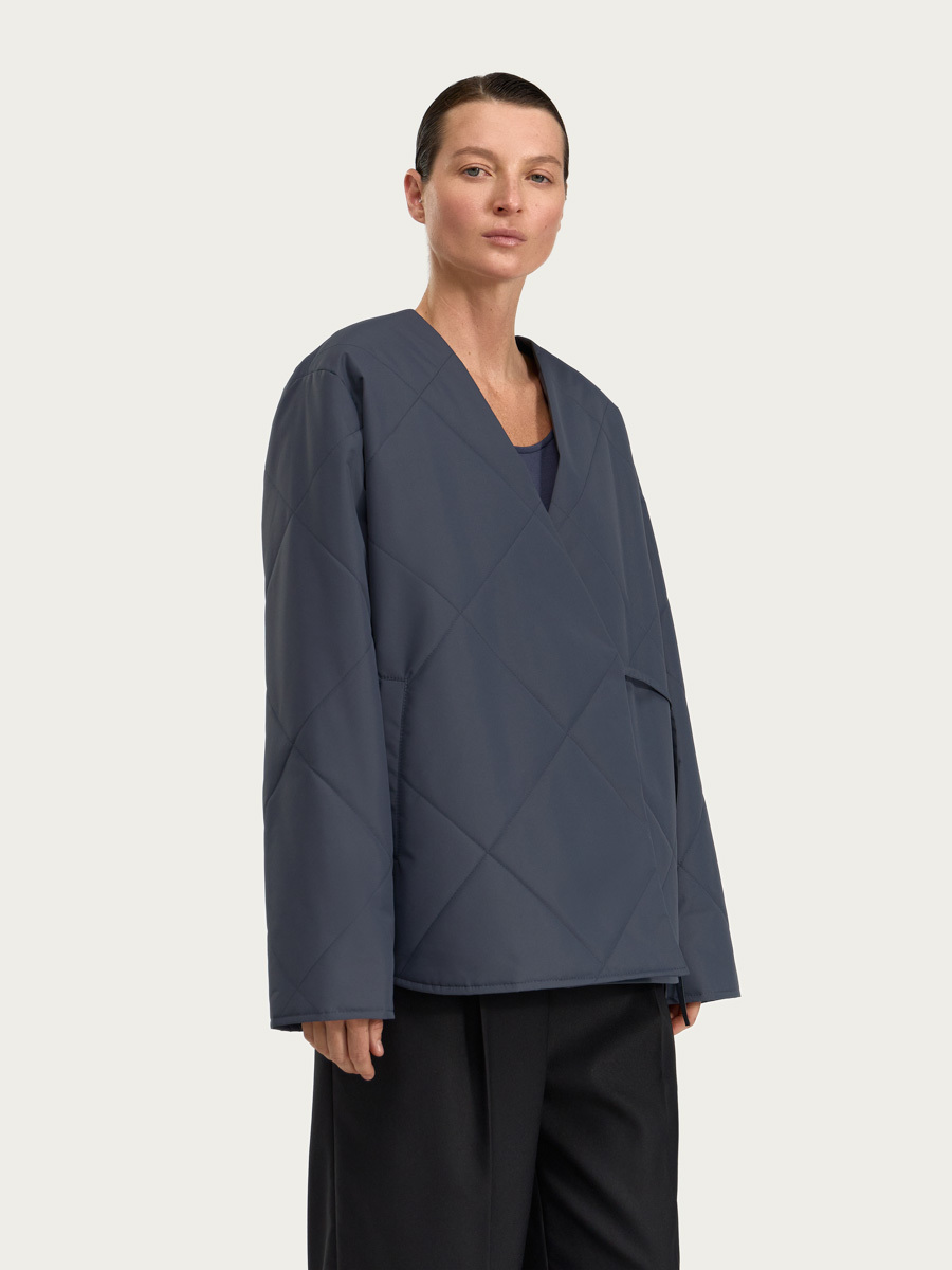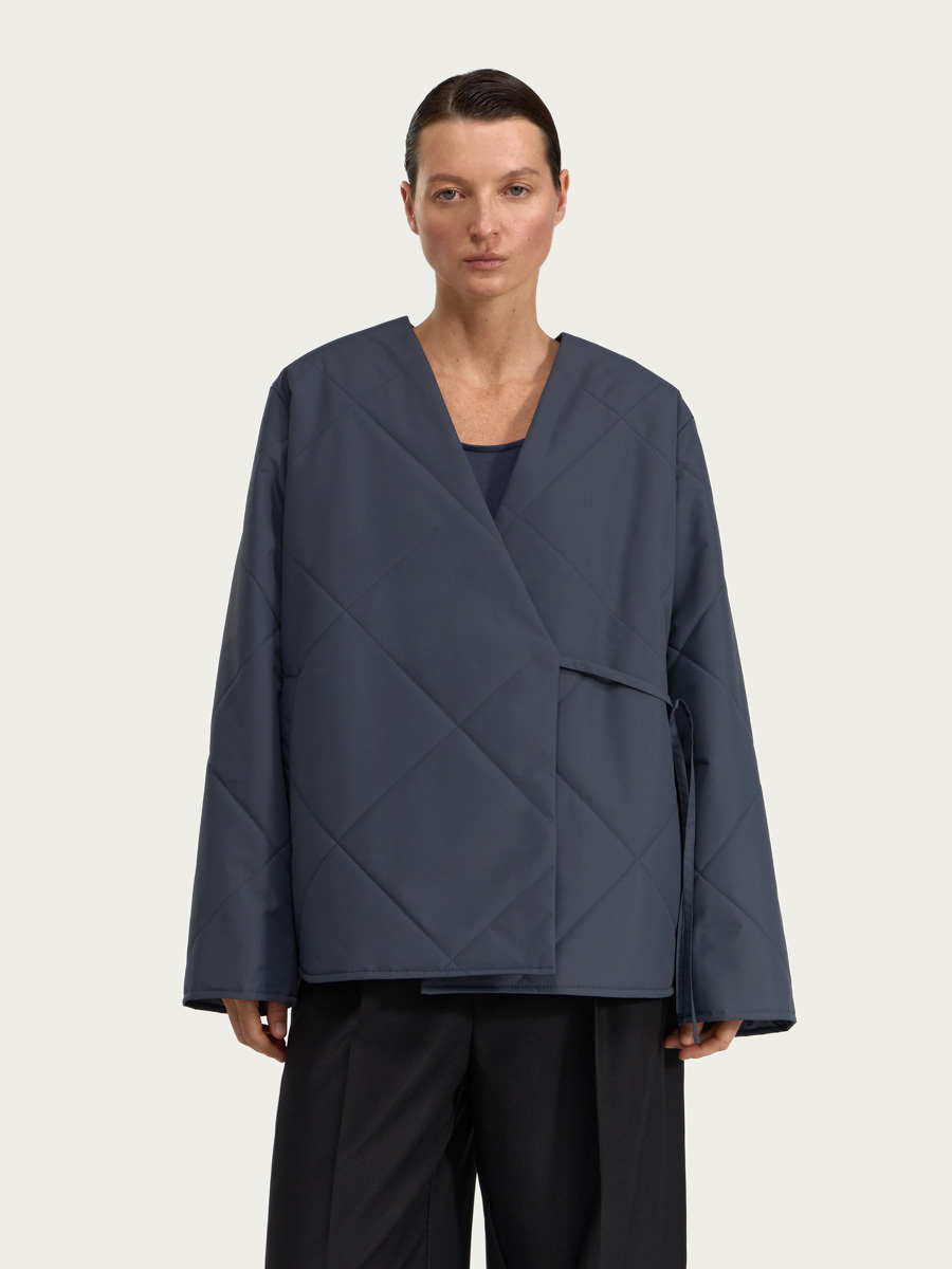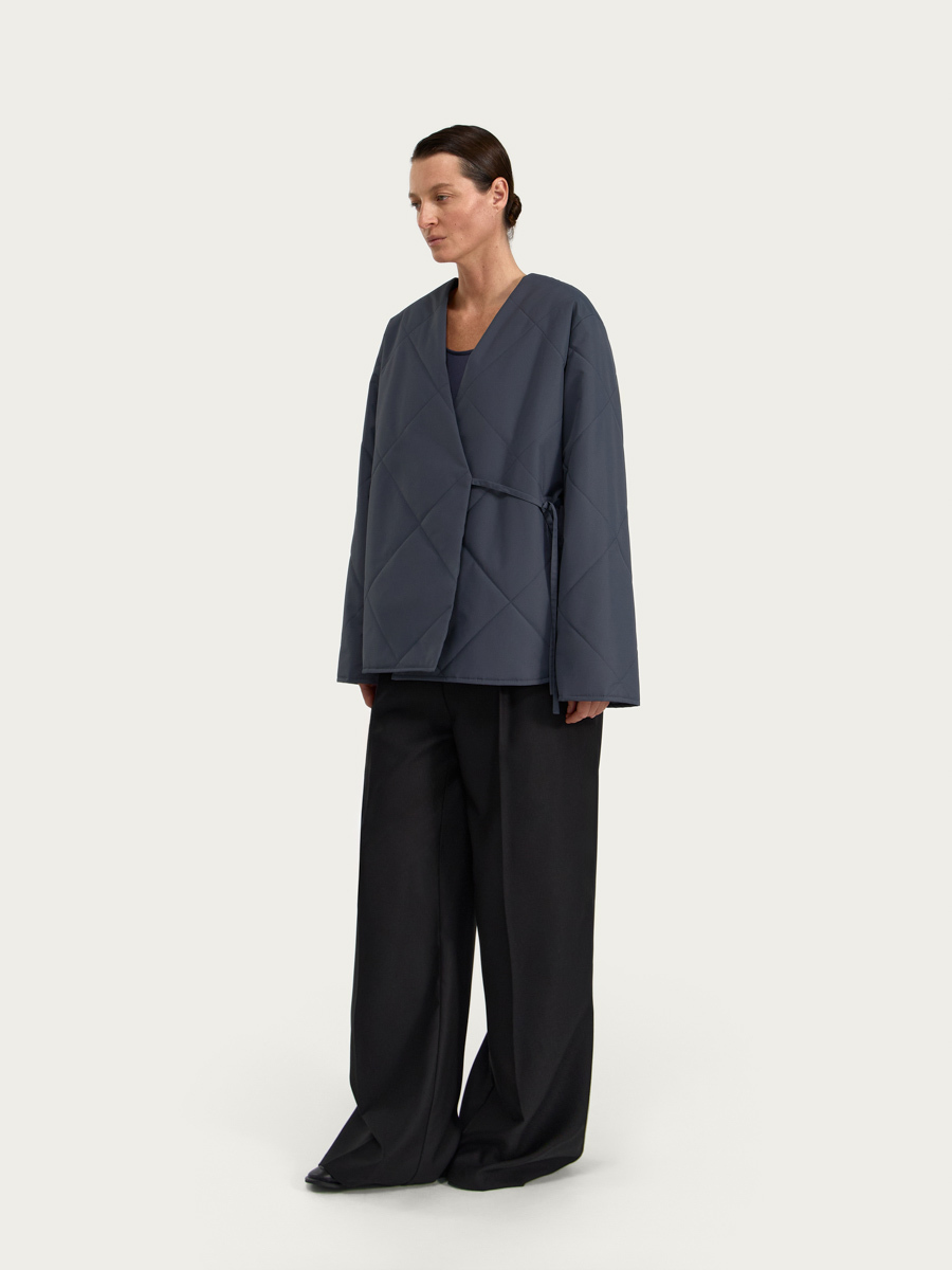 Куртка стёганая с утеплителем 100 грамм на запах. Изделие на подкладке. Край борта фиксируется на завязки, выходящие из бокового шва и края борта. В изделии предусмотрены прорезные карманы с листочкой. Куртку можно носить как осенью, дополнив ее утепленным аксессуаром, так и зимой, используя ее в качестве дополнительного слоя под пальто или пуховик. Благодаря лаконичному дизайну изделия, крупной стёжке и борту на запах куртка Эдинбург станет особенно важным изделием вашего базового гардероба.
