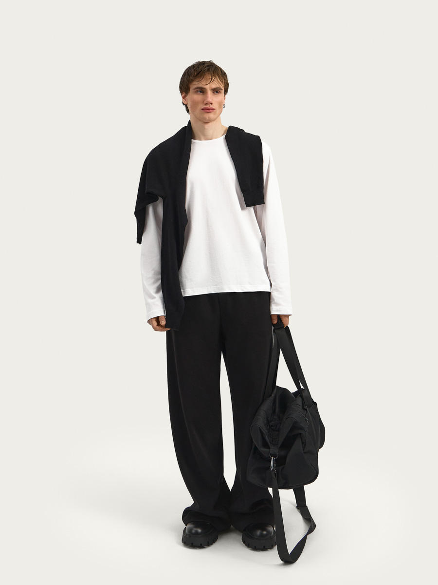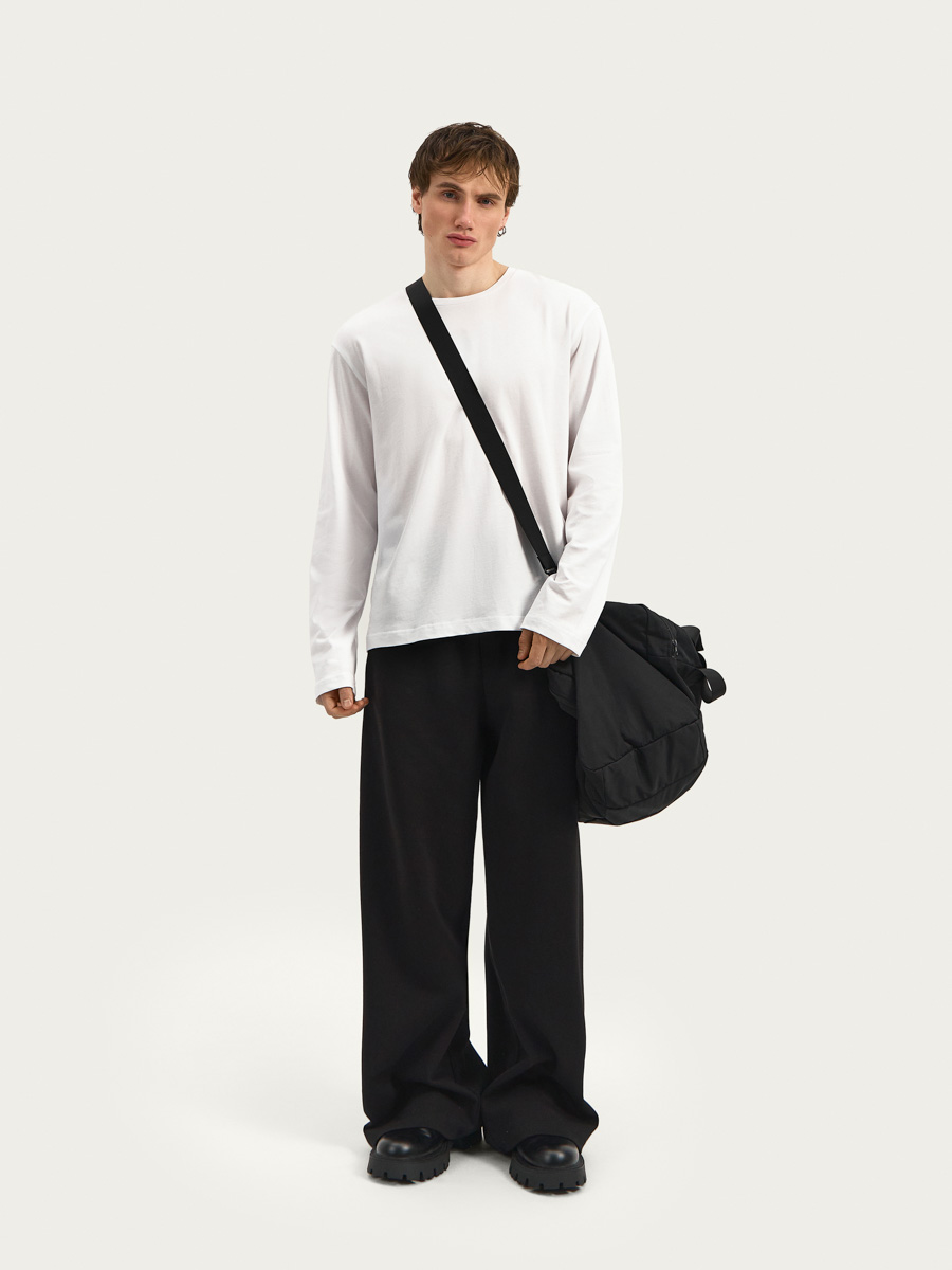 Вместительная сумка объема макси имеет застежку на витую молнию, ручки из ременной ленты, съемный ремень с регулировкой по длине. В боковых частях сумки расположены вместительные отсеки с застежкой на молнию.